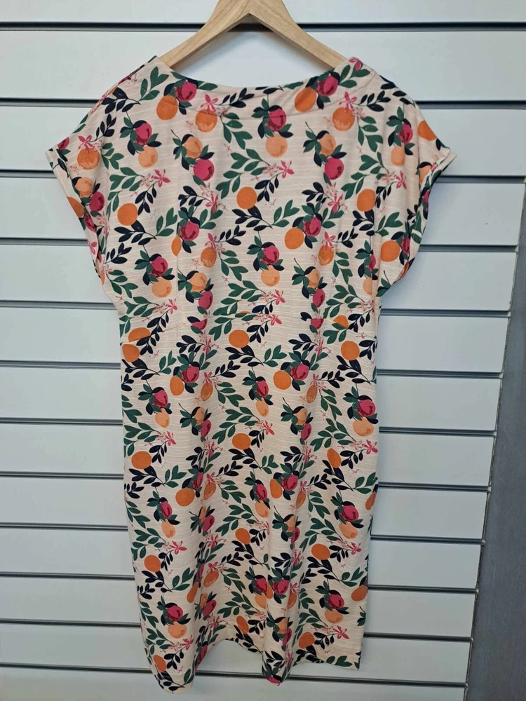 Introducing a brand new tunic dress from the popular brand Weird Fish. This knee-length A-line dress is made from 100% cotton jersey fabric, which guarantees a comfortable and breathable fit. Its multicoloured citrus fruit print is perfect for the summer season, while the round neck and short sleeves make it suitable for any casual occasion. Moreover, this dress features pockets, which is an added convenience for women on the go. Available in size 10, this tunic dress is perfect for those looking for a comfortable yet stylish outfit. Get this must-have item for your wardrobe today!