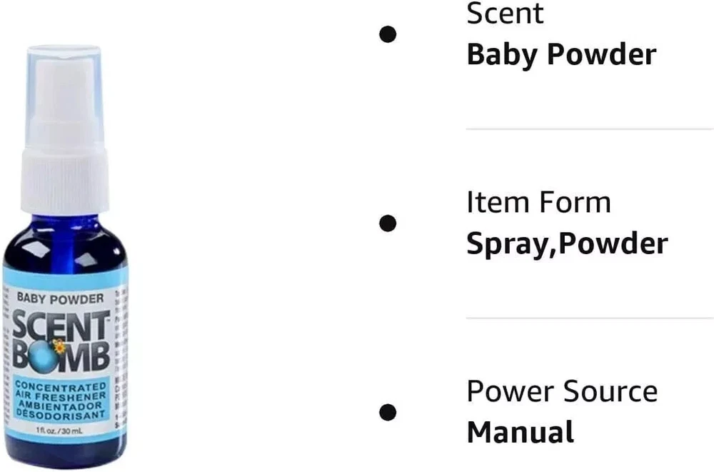 Scent Bomb 100% Oil Based Concentrated Air Freshener Spray, Baby Powder, Pack of 3 Scent Bomb Air Freshener Spray, Baby Powder 3 Bottle Product Info Scent Bomb air freshener spray refreshes your car, home, and anywhere you want to mask odor. Our air freshener spray is oil based, that is designed for its long lasting fragrance that will give you a fresh and calming ambience. This is intended to fill your home, car, or office with incredible scents that covers all types of odors and smells. Made in the USA. Just a few sprays and it will last for days! Features QUALITY FORMULA: Scent Bomb air freshener uses a scented oil-based formula that is created for long lasting fragrance that will give you a fresh and calming ambience. Just a few sprays and it will last for days! HOME AND CAR AIR FRESHENER: This air freshener spray is ideal to refresh your car, home, room, or office with incredible scents that eliminate all types of odor and smells! LUXURIOUS SCENTS: Scent Bomb air freshener will help you relieve stress, help you stay alert, and improve your mood. Remove odor and freshen your life that gives you a pleasant scent. PACKAGE CONTENT: Each pack contains Baby Powder, 1 fl.oz. spray air freshener bottles. Great use for car freshener, room spray, bathroom spray, or spray for your gym bag! A great air freshener for home, work or on the go! TRUSTED BRAND: All Scent Bomb Air Fresheners are made in the USA and designed for its long lasting fragrance. A great air freshener spray for your car and home