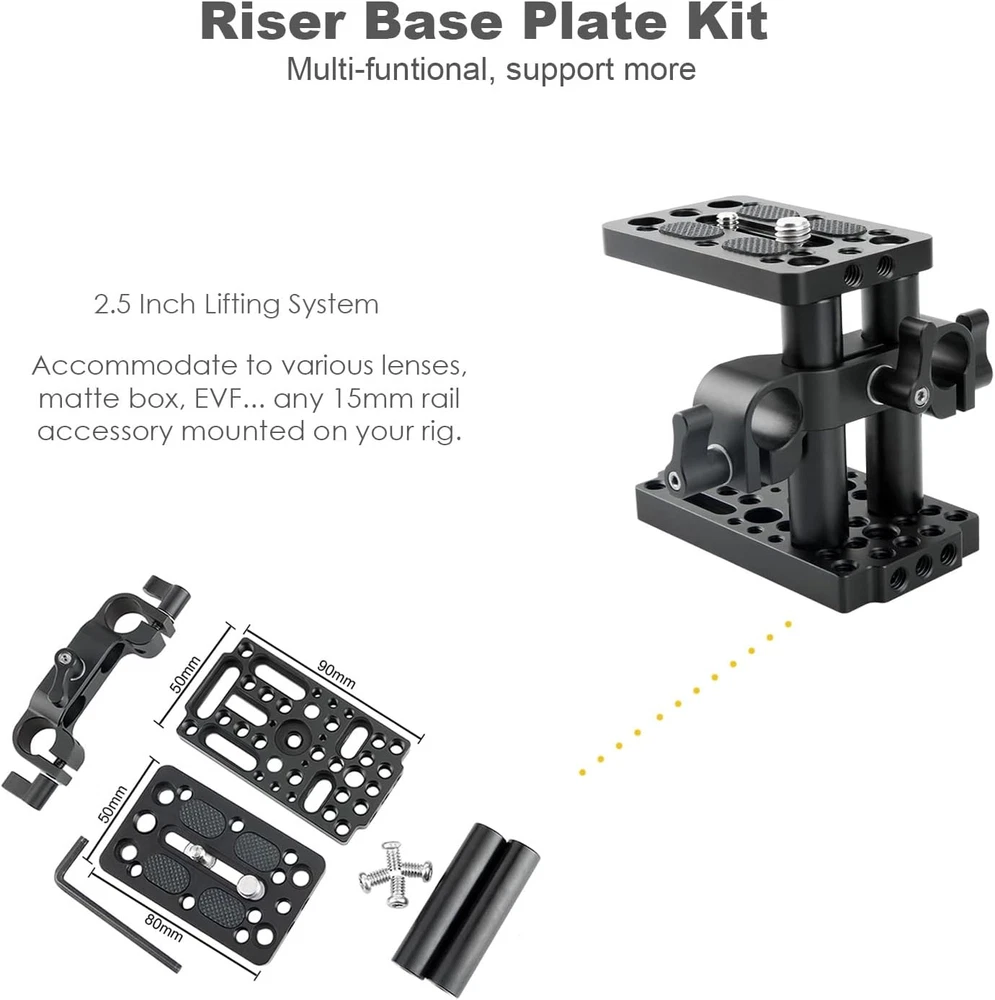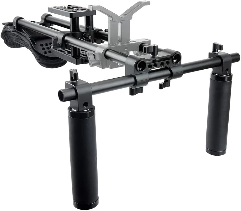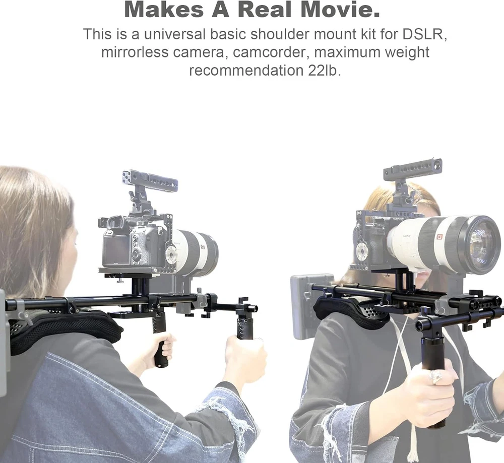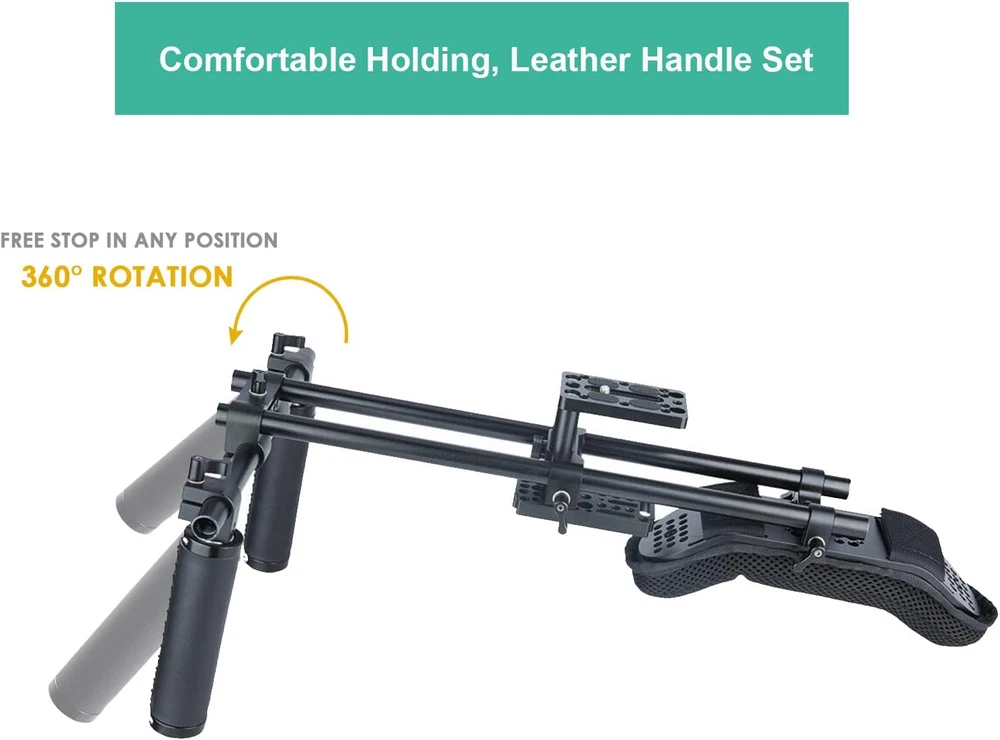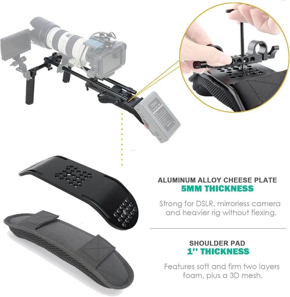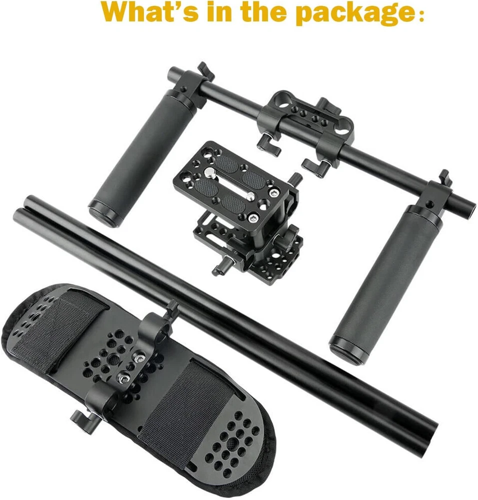 Niceyrig shoulder rig system 173 provides steady video shooting for people who keeps long time shooting to help release pressure Fits for industry standard 15mm rail rod system (rod centre to center distance is 60mm) Easy Set Up- Its shoulder pad integrated with ergonomics principle indeed makes your shoulder feel much comfortable, and the camera rig systems also includes a lifting easy plate equipped with various threaded holes ( 1/4" 3/8" M3 M4 ) in 9mm spacing, plus leather handgrips. Main body made of quality Aluminum Alloy, sturdy and durable Niceyrig 15mm Shoulder Pad Rig Stabilizer for Sony Canon Nikon DSLR Cameras, Film Movie Making System * Easy to set up,strong enough for 15mm shoulder rig system * Release pressure from your hand to your shoulder, and free your hand from the handle support * Dual to Single 90 Degree 15mm rod clamp --Designed to attach side handles to the front of shoulder mount * Leather handle single rod clamp can move together pushing away from your body or towards your body or move independently so you can have one grip further away from your body then the other grip. * Used for DSLR camera baseplate lifting system (For Arca Swiss) * With mini cheese plate, it suits for all DSLR cameras, you can add v-lock battery, magic arms, wireless microphone receiver etc. * A top 15mm railblock mounted on the shoulder pad to directly attach to DSLR rig 15mm rails. * The 16'' aluminum rods both ends M12 female thread.You can use a 15mm rod connector to extend the rod,with standard 15mm diameter,compatible with all 15mm rail system and other support system. * Main body made of quality Aluminum Alloy, durable and lightweight Package Includes: 1X Shoulder pad 2X 16'' Aluminum Alloy rods 1X 15mm railblock 2X Easy plate 1X 15mm rod clamp 2X 63mm rods 2X Handgrip 1X 15mm rod clamp 1X 12" Aluminum rod
