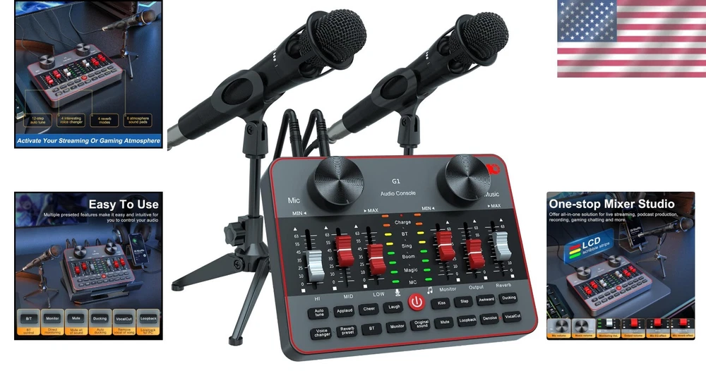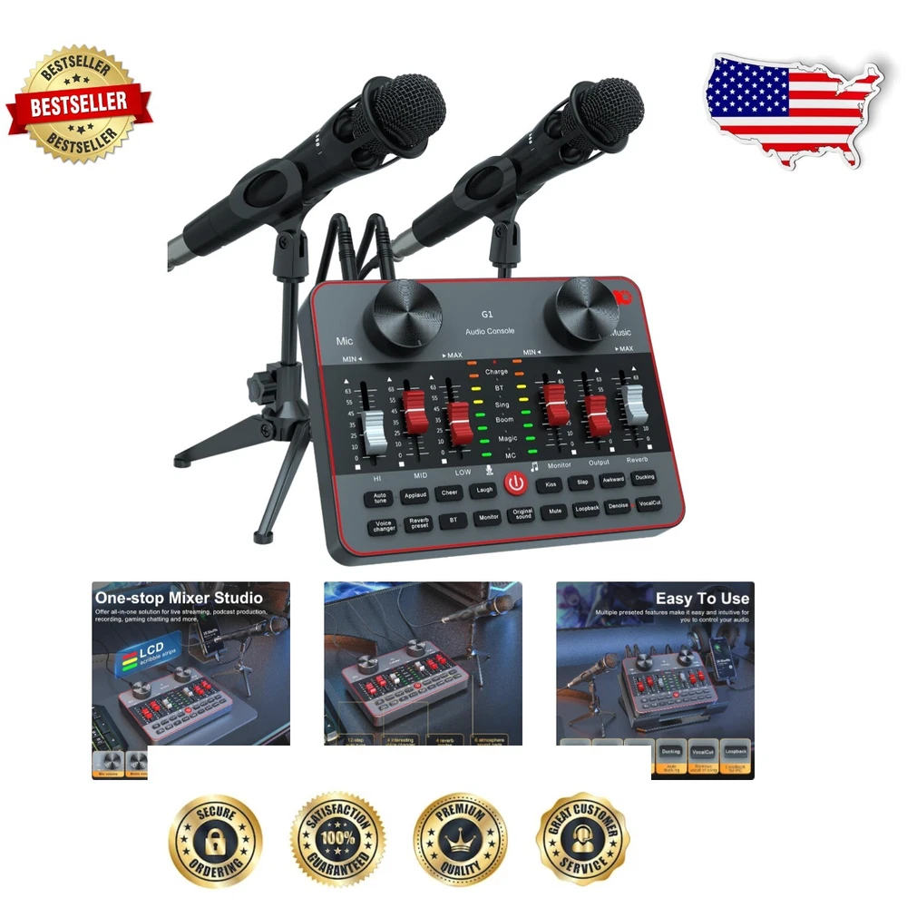 Complete Podcast Equipment Bundle for 2 Mic Live Streaming & TikTok Creators ‹ › ‹ › ‹ › ‹ › ‹ › ‹ › ‹ › Complete Podcast Equipment Bundle for 2 Mic Live Streaming & TikTok Creators Made for TikTok Content Creators: This all-in-one podcast starter kit includes everything you need for exciting live streaming. Featuring a high-quality microphone live sound card, monitoring earphones, sturdy stand, and pop filter, you are set for success. Our Audio Interface mixer supports two users simultaneously, allowing you to captivate your audience with vocal effects, treble/bass adjustment, reverb capabilities, 4 voice changers, 12 electronic music tunes, and 5 sound scene modes for exceptional sound mixing. Key Features: All-in-one live streaming equipment perfect for influencers. Easily integrates audio interface into a DJ mixer with numerous controls for sound optimization. Includes 2 podcast microphones and 2 microphone clippers for collaborative streaming experiences. Studio Cardioid Condenser Microphone with built-in DSP chip to enhance voice clarity. Flexible heart pickup design ensuring high quality clear recordings by minimizing ambient noise. Instrument input capability allows seamless integration of guitars, bass, and more for captivating performances. Mobile-friendly for studio-quality streaming on smartphones, easy plug-and-play functionality for effortless creation. Professional-grade sound card designed for live streaming with a sample rate of 120kHz and bitrate of 24-bit. Benefits: Hassle-free setup and ease of use for beginners and seasoned creators alike. Empowers content creators to generate high-quality productions enhancing user engagement. Transforms simple live streaming into unforgettable experiences with an array of sound effects and features. Durable construction ensures long-lasting performance whether streaming at home or on-the-go. Perfect gift for budding YouTubers, gamers, and social media influencers chasing their dreams. Why Choose Our Podcast Equipment Bundle? Embarking on a new live streaming journey has never been easier! Our Complete Podcast Equipment Bundle is meticulously designed to cater to your creative aspirations across platforms like YouTube, Facebook, Instagram, and TikTok. With professional-grade sound quality and a versatile setup, your audience will experience unparalleled entertainment that keeps them coming back for more. Engage, entertain, and elevate your streaming experience with this comprehensive kit. Unlock a world of high-quality sound and creativity—order your Complete Podcast Equipment Bundle today and start captivating your audience! Shipping Free & Fast Shipping - We offer free shipping to most of the USA with a normal delivery time of 3-7 days. However, due to the current situation, additional delivery time (up to 3 weeks) may be required for some items. Alternative Carriers - We may use alternative carriers (e.g. USPS, FedEx, UPS, etc.) to ensure your package arrives safely and on time. Due to the use of multiple carriers, we are unable to provide a tracking number automatically. Handling Time - Orders are processed and shipped within 1-2 business days of receiving cleared payment. Shipping Restrictions - Shipping to Alaska, Hawaii, Puerto Rico, Guam, and other US territories may incur shipping charges or delivery restrictions. Please contact us before ordering, or your order can be refunded/cancelled. State Restrictions - There may be restrictions based on your state of purchase. For example, certain items may not be shipped to California due to state regulations. Contact for Tracking Updates - If you require tracking updates or have any concerns about the delivery of your order, please feel free to contact us, and we will be happy to assist you. Return 30-Day Hassle-Free Returns - We want you to be completely satisfied with your purchase. If you are not, you can return the item within 30 days of receiving it for a full refund or exchange. Easy Return Process - To start a return, simply contact us and we will provide you with a prepaid return shipping label and detailed instructions. Restocking Fee - There are no restocking fees for returns. However, the buyer is responsible for return shipping costs if the return is not due to a seller's error. Refund Processing Time - Refunds will be processed within 5 business days of receiving the returned item in its original condition. Payment We accept all major credit cards, PayPal, and Apple Pay for your convenience. Your payment information is secure and encrypted to ensure a safe and seamless transaction. Please complete your payment within 3 days of purchase to avoid any delays in shipping. Feedback Your feedback is extremely important to us. We strive to provide the best products and customer service possible. If you are satisfied with your purchase, please take a moment to leave us a positive review. If you have any concerns or issues with your order, please contact us before leaving negative feedback. We are committed to resolving any problems and ensuring your satisfaction. Contact Us If you have any questions or concerns, please feel free to reach out to our customer support team. You can contact us through the eBay messaging system. We are available Monday to Friday, 9:00 am to 5:00 pm EST, and we will do our best to respond to your inquiry within 24 hours. Buy it now and enjoy a pleasant shopping experience! UPC: Not Set Maximum SPL: 120dB Unit Quantity: 1 Item Weight: Unknown Connectivity: 3.5 mm (1/8 in) TRS,Bluetooth,USB,Wireless Features: Plug and Play,Live Streaming,Podcast Starter Kit,Audio Interface,DJ Mixer,Sound Card,Condenser Microphone,Monitoring Earphone,Stand,Pop Filter,Supports 2 People,Vocal Effects,Treble/Bass Control,Reverb,4 Voice Changers,5 Sound Scenes Modes,All-in-One For Influencer Kit,Integrated Audio Interface,Professional Sound Chipset,Real-time Monitoring,Auxiliary Functions,Guitar/Bass Input,Compact Design Compatible Model: G1 a
