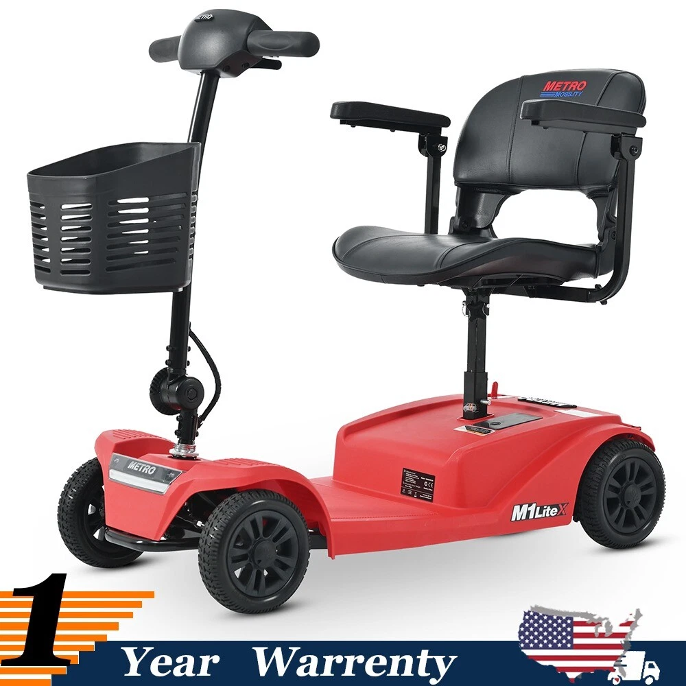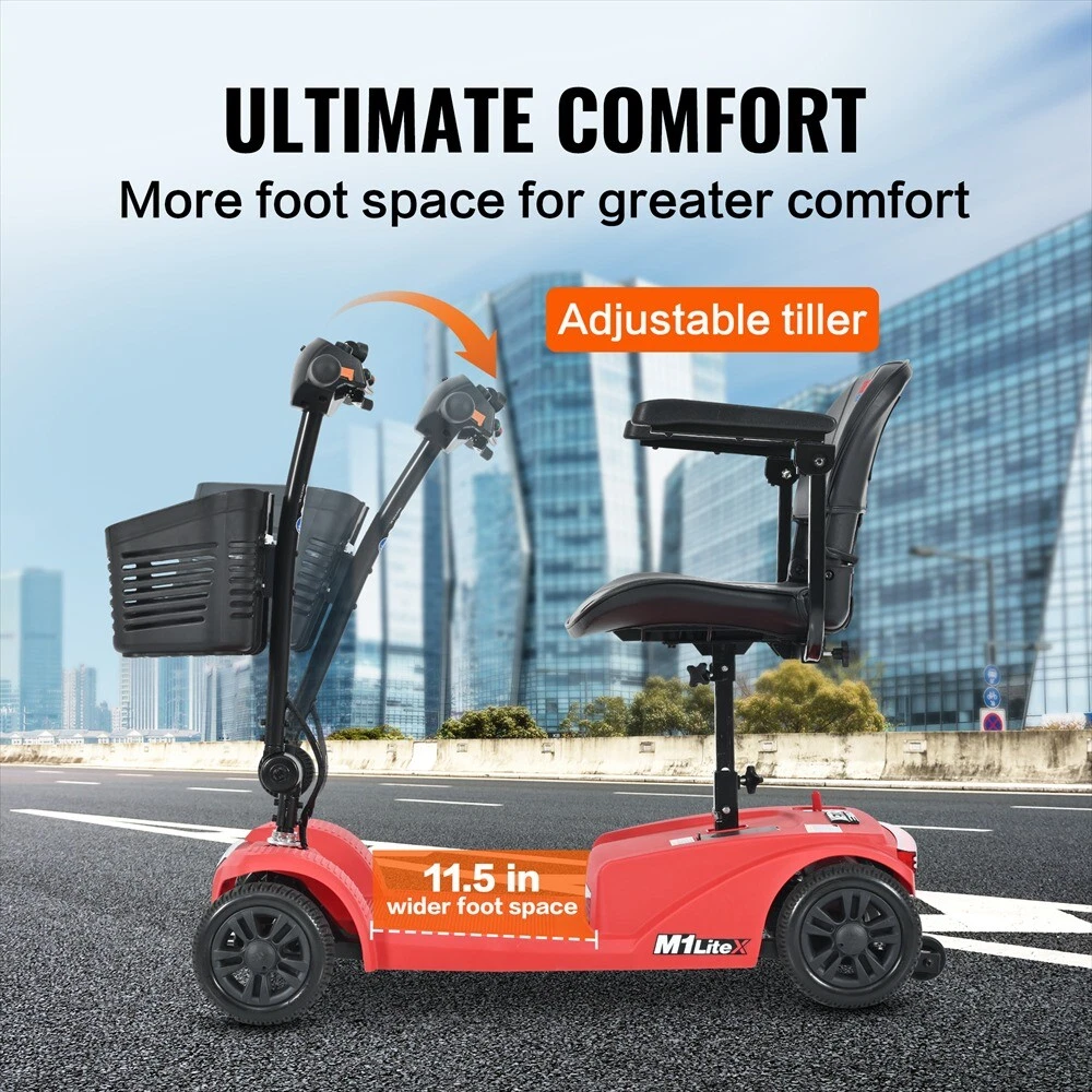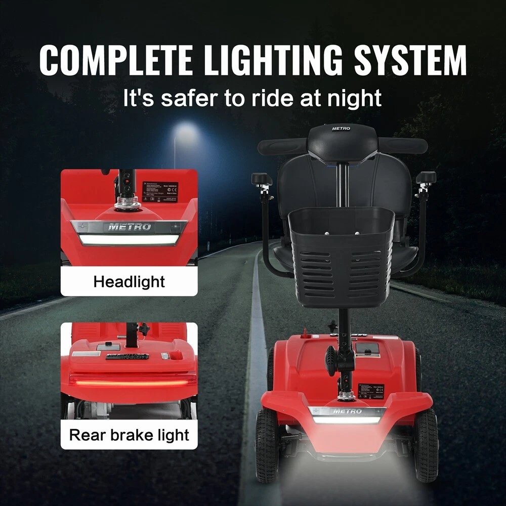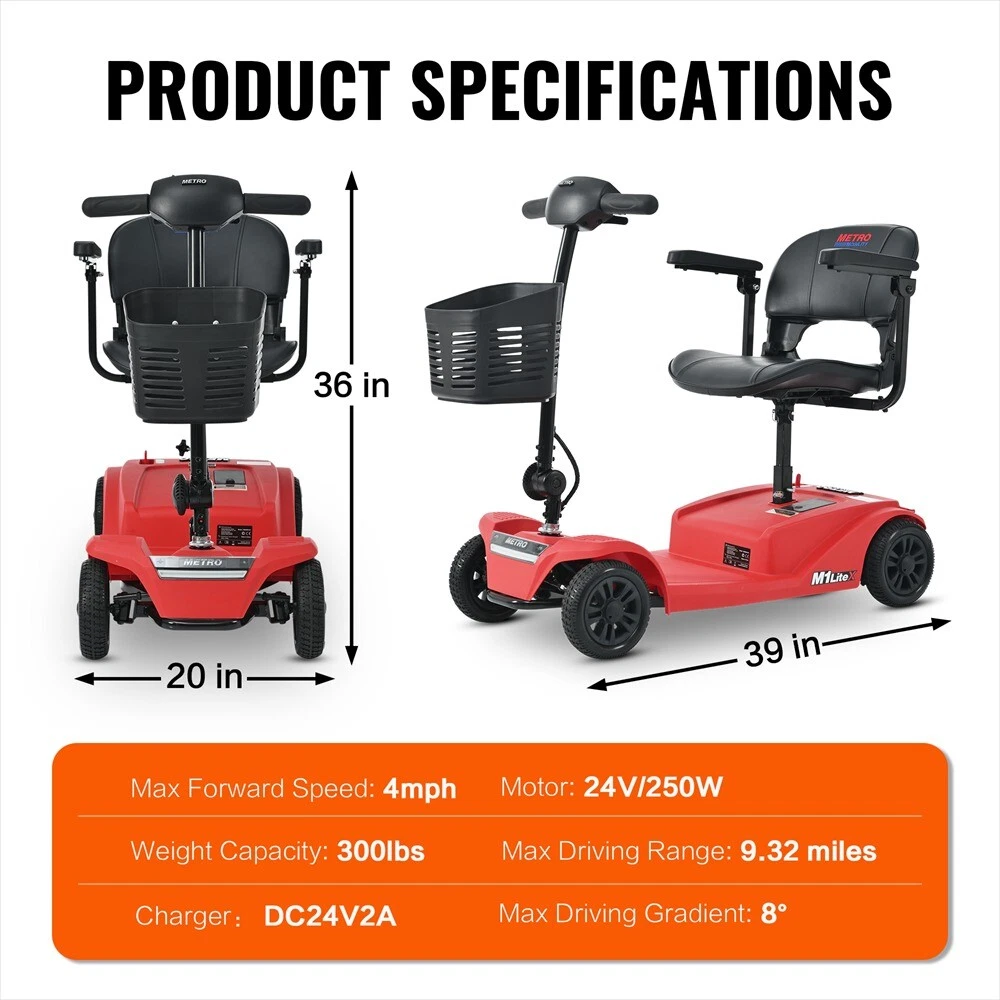 Lightweight 4 Wheels Travel Mobility Scooter 250W 24V 9.32 Miles 300lbs Capatity Features Front & Rear LED Light 300W Powerful Motor 9 inches front & rear solid tyres Rear Suspension Weight capacity: 136kg(300lbs ) High-performance operation and easy disassembly Sliding swivel seat with flip-up armrests Intelligent electromagnetic brake Simple control panel can operate with fingertips or thumbs effortlessly Driving Range: 10 miles