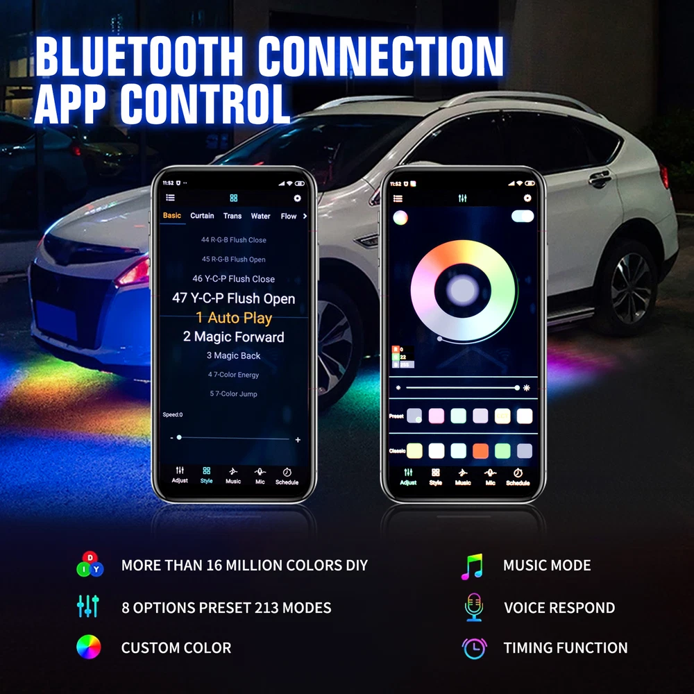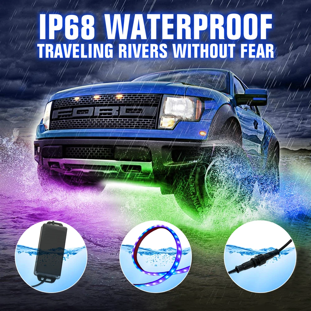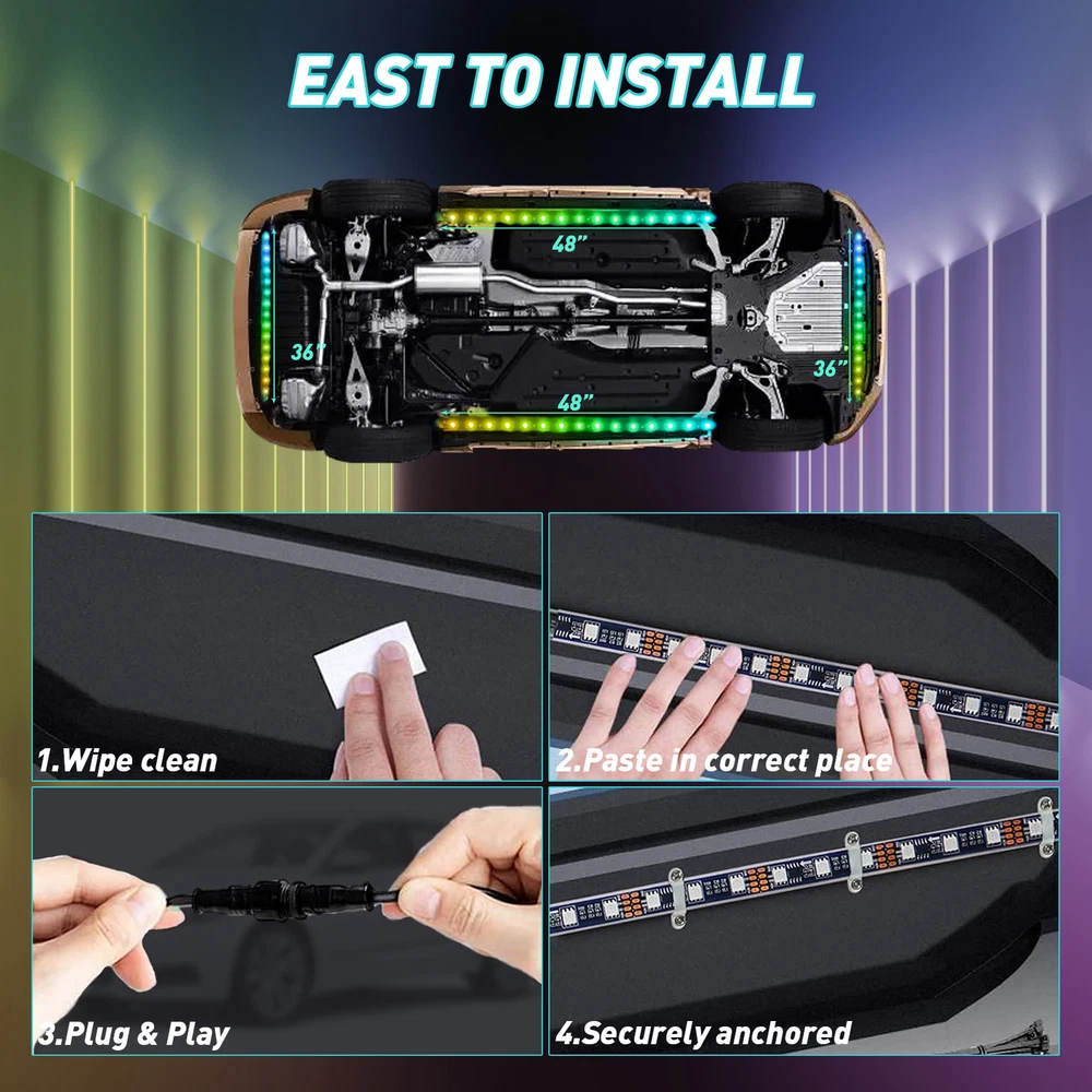 About this item: High quality: 4PCS Car Underglow Lights are made of high brightness SMD 5050 LED chips , 3 In 1 RGB Chips with flexible PVC rubber; Waterproof, Robust, Rust-proof; and our LED under car glow system can be connected to any DC 12V USB port; Not only suitable for Car exterior, But can also motorcycles, boats, trucks, TV lighting, Home, KTV, Party decortaion, etc. Control Modes: 17 keys remote control, APP control will help you avoid connecting issues, which you can use them to adjust the change speed, brightness and stroboscopic speed. The car underglow strip lights for car led lights exterior is built-in sensitive mic, which make it glow and dance to the rhythm of your music, enjoy every driving! Dream Color Chasing lights: The Undercar Strips Lighting Kits built-in Kinds of Color Chasing Modes looks like recurrently chasing, skipping, dancing, twinkling on the strip. You can make your favorite chasing lights effect underglow the car or DIY a static color for lighting. Increase the safety of driving during the day and night and the appearance of the vehicle. Easy installation: Flexible LED RGB Chassis strip lights can be bended easily, strong 3M adhesive, additional zip ties and screws equipped definitely hold it on place firmly. DC12V , IP67 waterproof, Never worry about the safety of the Car bottom light. You can install them in your car with flexibility. Package includes: 4 x Car Underglow Neon Accent Strip lights 1 x Remote Control 1x Control Box & Wiring On Nov 12, 2024 at 00:11:07 PST, seller added the following information: