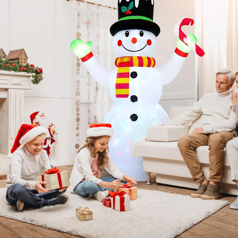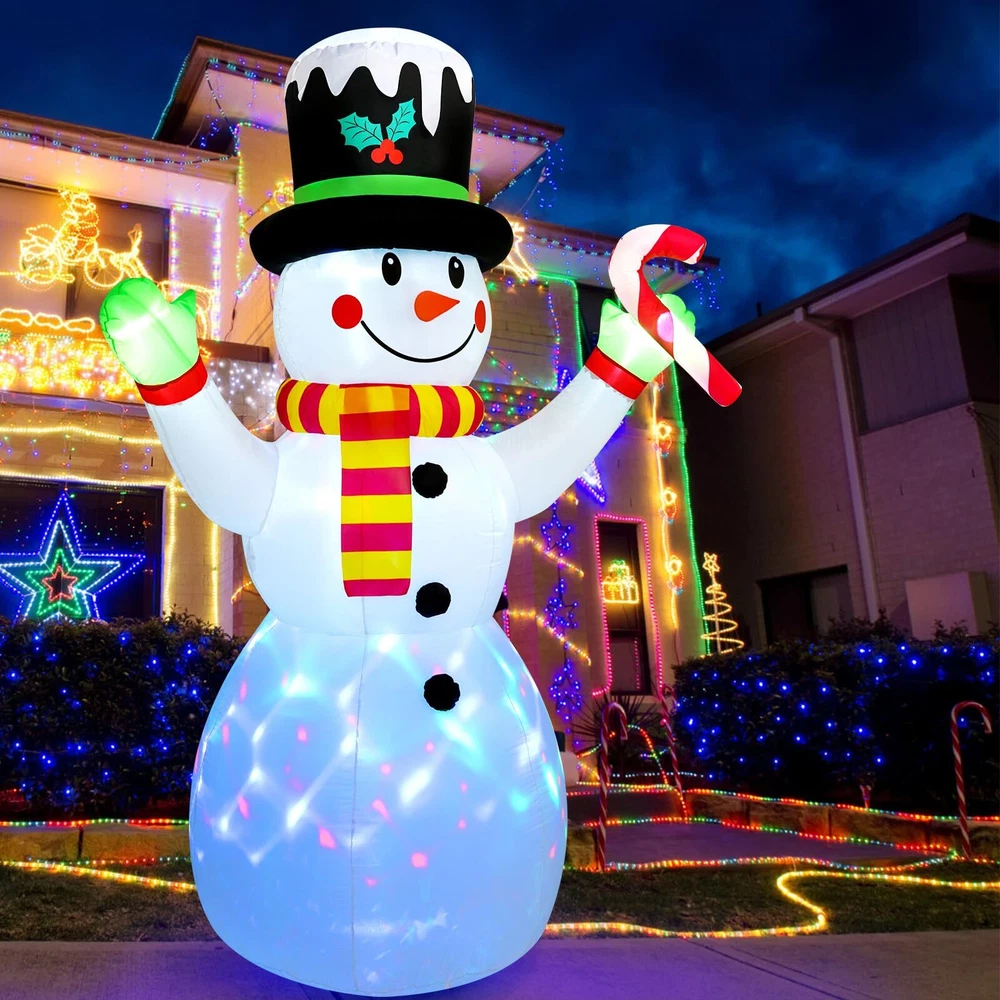 Christmas Yard Decoration: This 7 ft Christmas inflatable decoration is wearing a cute top hat and scarf, holding candy canes in his hand, with a happy smile on his face, extending his arms as if giving you a comfortable hug.This snowman inflatable brings a strong Christmas atmosphere and makes your family have a charming and enjoyable holiday time. Durable and Safety: This Christmas blow up yard decoration is made of thickened polyester fabric, which is not only more waterproof, wrinkle resistant, fade resistant, but also improves the tightness of the product and makes its service life longer.And the power plug is UL certified to ensure the safe and reliable operation of the product. Stable Use: The Christmas inflatable outdoor decoration is equipped with 6 ground inserts, 2 water bags, 2 pull strings. These accessories can effectively prevent the gingerbread man inflatable from being blown away when placed outdoors, making the product more stable. LED Lights & Scenes: Rotating magic colorful led lights are installed inside the inflatable Christmas decorations. When the power is connected, it will light up your night, bringing you a good Christmas atmosphere and attracting everyone's attention. The 7 ft Christmas inflatable is suitable for living room, garden, yard, party, doorway, patio, hallway, etc. Fast Inflating & Convenient Storage: This blow up Christmas decoration outdoor comes with an air blower that allows for quick and effortless inflation.After the holidays, simply deflate, fold, and store it in the included space-saving box for easy reuse next year.Note: Close the bottom zipper when inflating, and make sure that there is no obstruction at the blower.