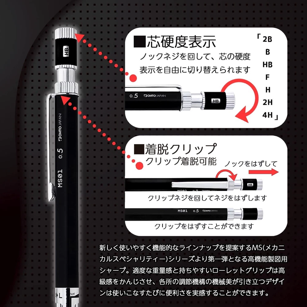 Professional high-performance sharp that can also be used as a drafting tool. 3-tier taper that makes it easy to see lines and letters while writing. Guide pipe adjustment mechanism: Can be adjusted according to the thickness of the ruler. Adjustment Mechanism: The length of the lead is adjustable with one knock. Knock cover has a hardness display window. High performance sharp that can adjust the length of the guide pipe and the length of the lead you are sending out Size: Total length 5.9 x shaft diameter 0.4 x maximum diameter 0.4 inches (151 x 10 x 11 mm); Weight: 1.0 oz (27 g) Material: Gripper, Dial, Tip, Knock: Brass, Knock Cover, Rear Shaft: Aluminum, Clip: SK material Lead diameter: 0.02 inches (0.5 mm) Country of Origin: Japan