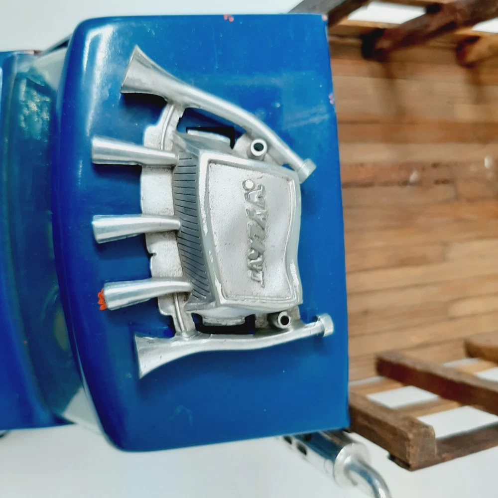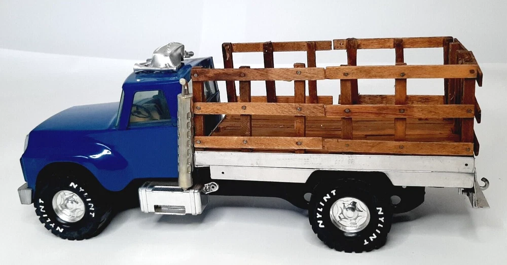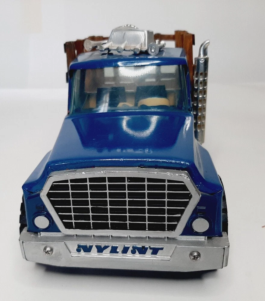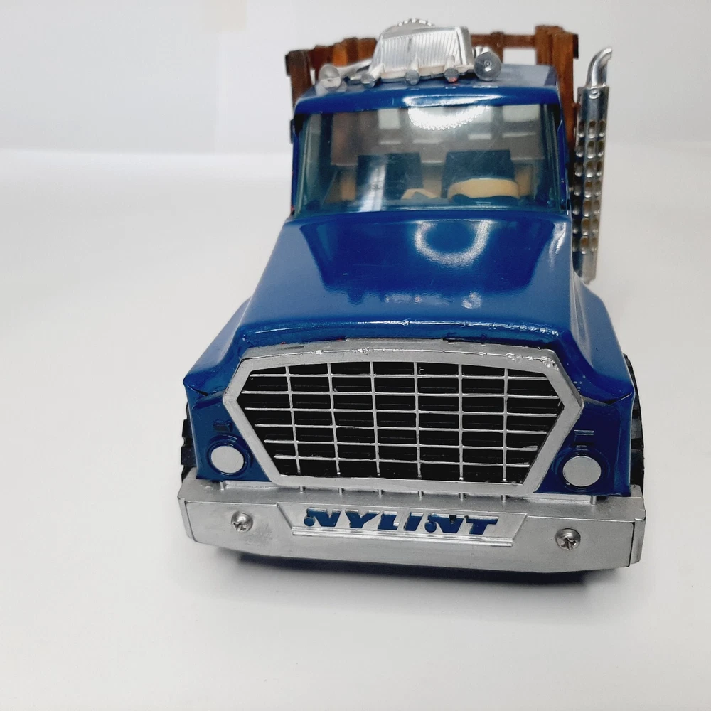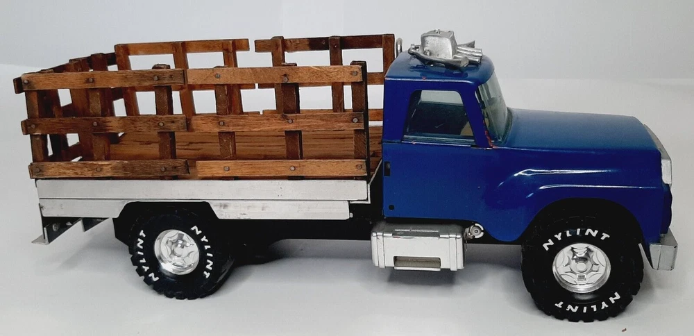 Vintage Ertl International Loadstar 1600 Stake Truck Blue Diecast Model Vehicle Good condition with only minor issues; horns on hood are a little warped; smoke stack is slightly detached; minor finish wear