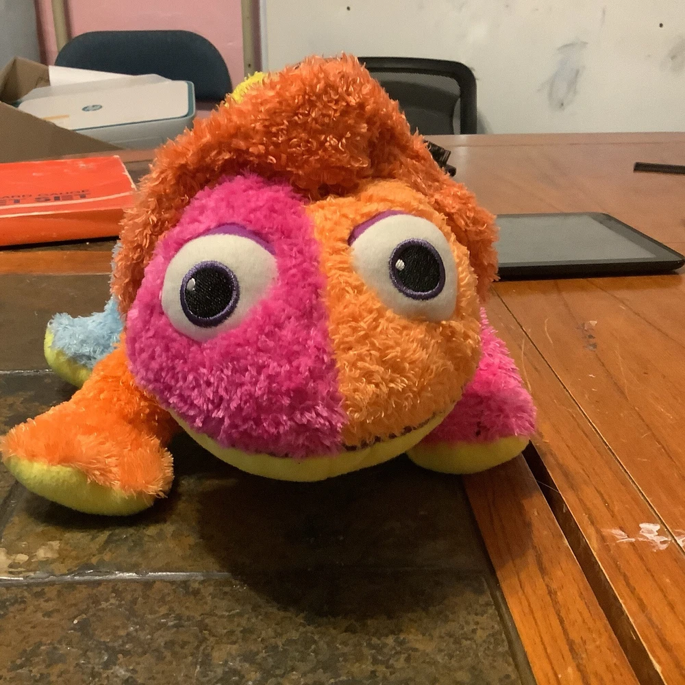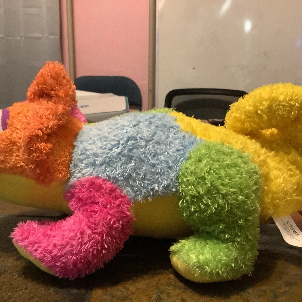 This Kohl's Cares plush toy features a colorful chameleon from the book "A Color of His Own" by Leo Lionni. The stuffed animal is 13 inches in size and has a multicolor design with a rainbow pattern. It is recommended for all ages and can be surface washed. The toy is part of the "Other Stuffed Animals" category and was manufactured in China in 2015.