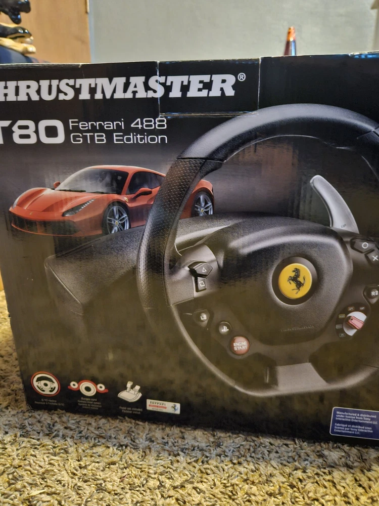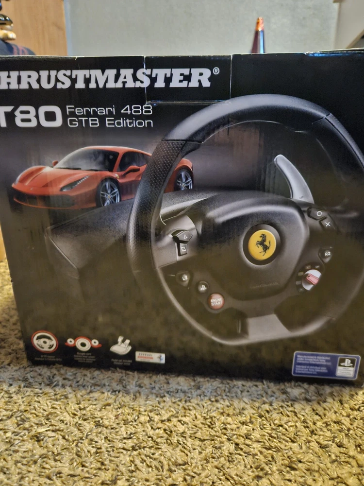 THRUSTMASTER T80 FERRARI 488 GTB EDITION IS BRAND NEW NOT BEEN OPEN AND IT IS STILL IN THE SAME BIX THAT IT CAME IN AND IT IS GOING UP FIR BIDD OR BUY IT NOW THE BOX HAS NO DENTS AND NO SCRATCHES ON THE BOX YOU ARE BUYING THIS ASNIS AND IT IS BRAND NEW STILL IN THE BOX THERE ARE NO RETURNS OR REFUNDS. IF YOU NEED MORE INFORMATION SEND ME A MASSAGE ON HEAR PLEASE AND THANK