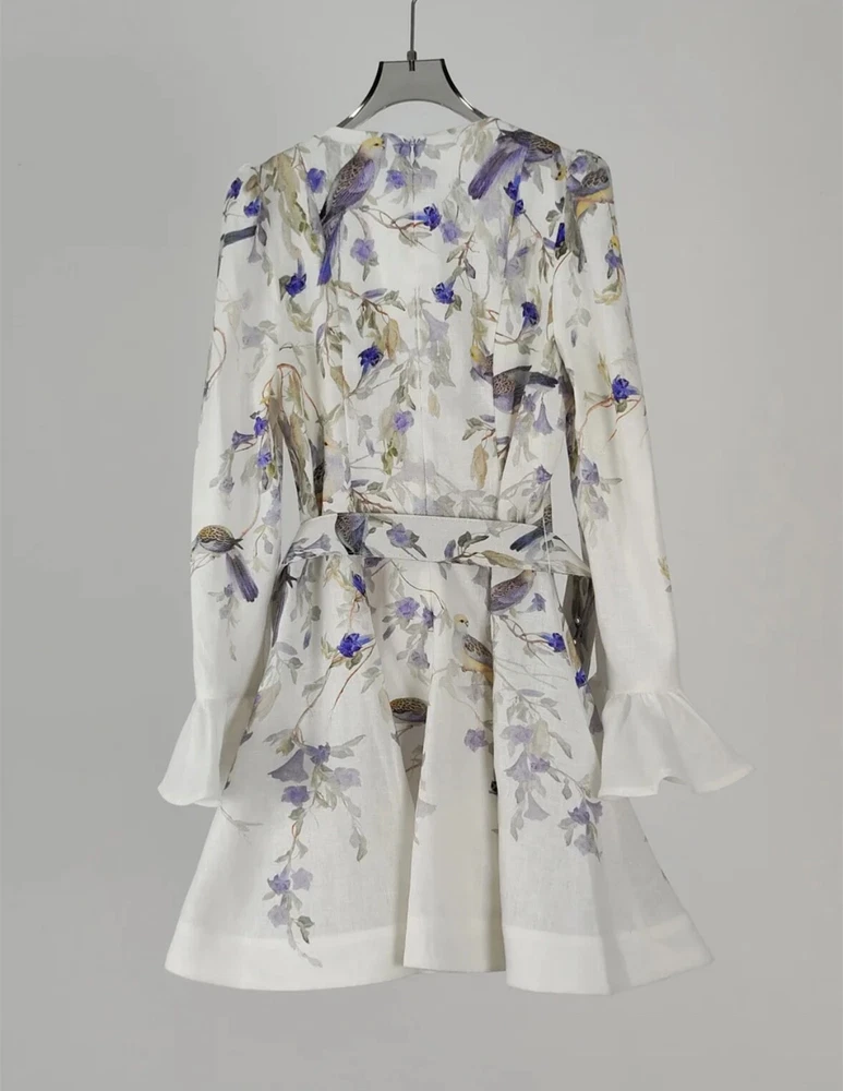 Elevate your wardrobe with the Zimmerman dress in size XL, a versatile piece that transcends occasions from a casual day out to a formal gathering. Featuring a charming floral pattern set against a crisp white backdrop, this mini dress is perfect for creating a springtime vibe, but its timeless design allows for year-round wear. The balloon sleeves and delicate ruffle accents add a touch of elegance, while the V-neckline and belted waist cinch the dress for a flattering silhouette. Crafted from high-quality linen and canvas fabric, this dress promises comfort and durability. It's a designer dress that doesn't compromise on practicality, equipped with a convenient zip closure and suitable for travel. Whether you're attending a cocktail party or enjoying a winter wedding, this dress is an enchanting choice that will carry you through in style.