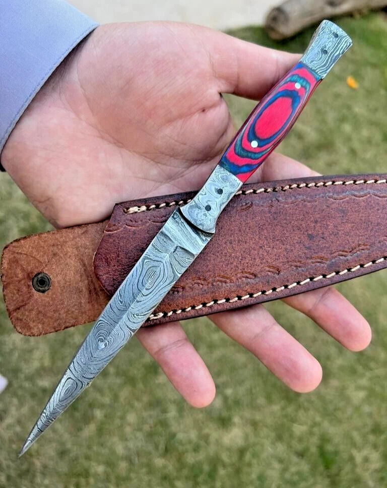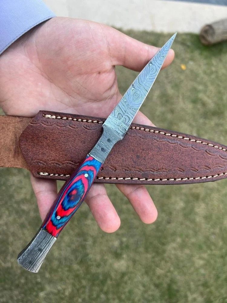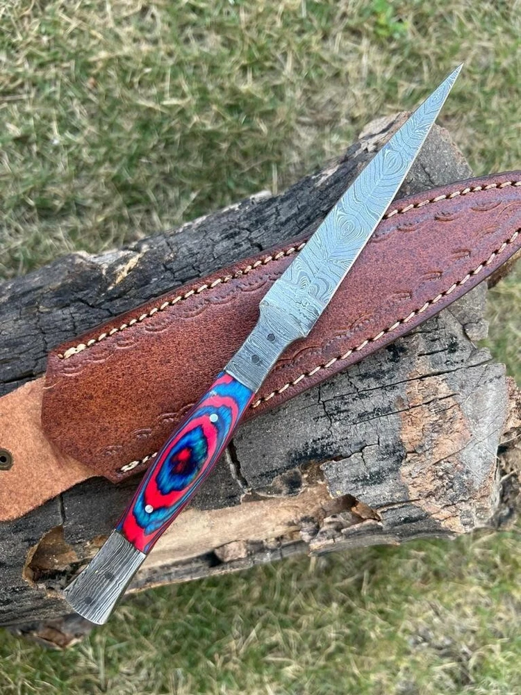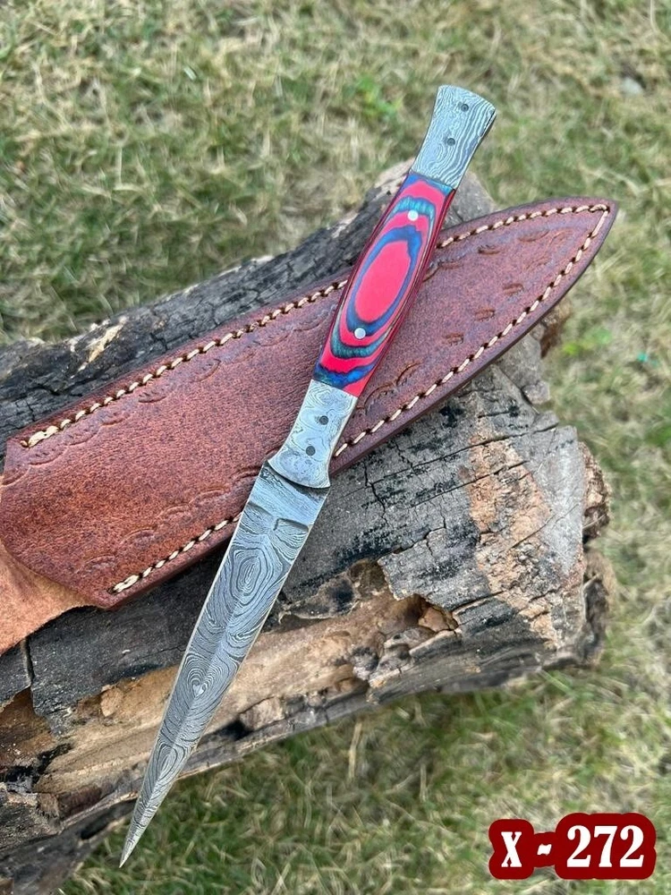 CUSTOM HAND MADE HAND FORGED DAMASCUS STEEL BOOT KNIFE DAGGER HUNTING KNIFE This superb design knife is hand forged. Blade of this knife has a nice file work and is made of 512 layers of 4340 stainless steel and 1075 high carbon steel and hardness 55-58 HRC . This robust knife is lab tested under intense conditions, the balance and shape of this knife ensures perfect grip. Overall Length: 8.5" Inches Blade Length: 4" Inches Handle Length: 4.5" Inches Damascus Design: Twist Pattern Layers: 512 Sheath: Leather Hand Forged