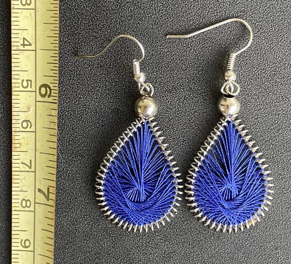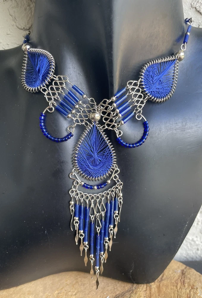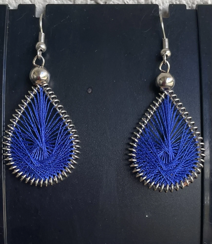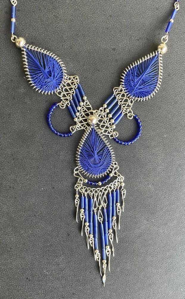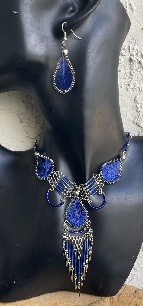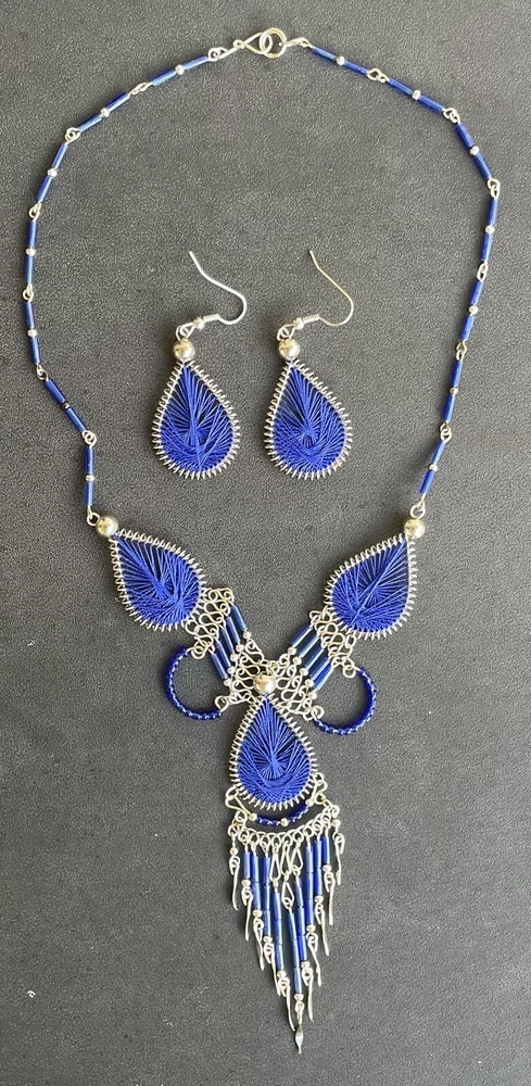 This listing is for a dark blue dream catcher style matching necklace and earrings set. You will receive a set just like the one in the picture. It is set in alpaca silver which is an alloy of zinc, iron, nickel and copper. It is extremely lightweight and it will not rust or tarnish. The set was handmade in Peru. The necklace is approximately 17" in length and the earrings are 2" long, with the ear hooks included. Please check out my Ebay store for more jewelry options. 1-se-th-dblu-2