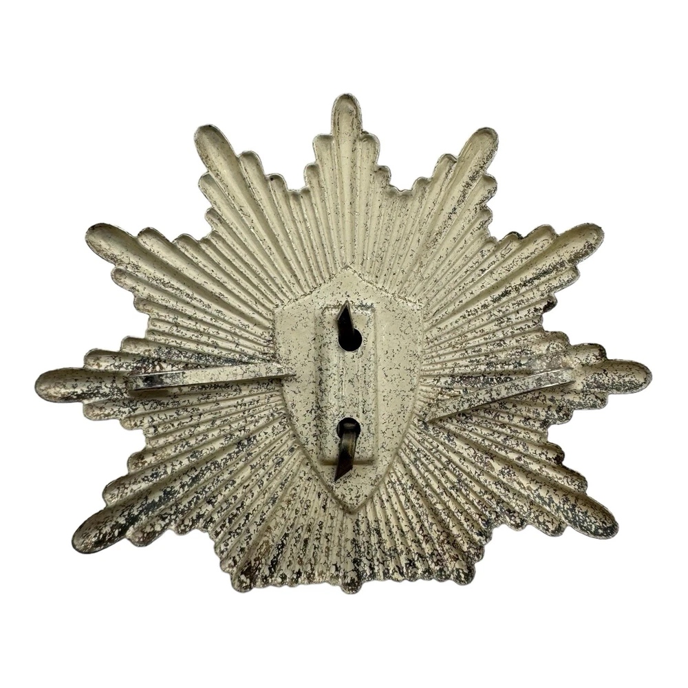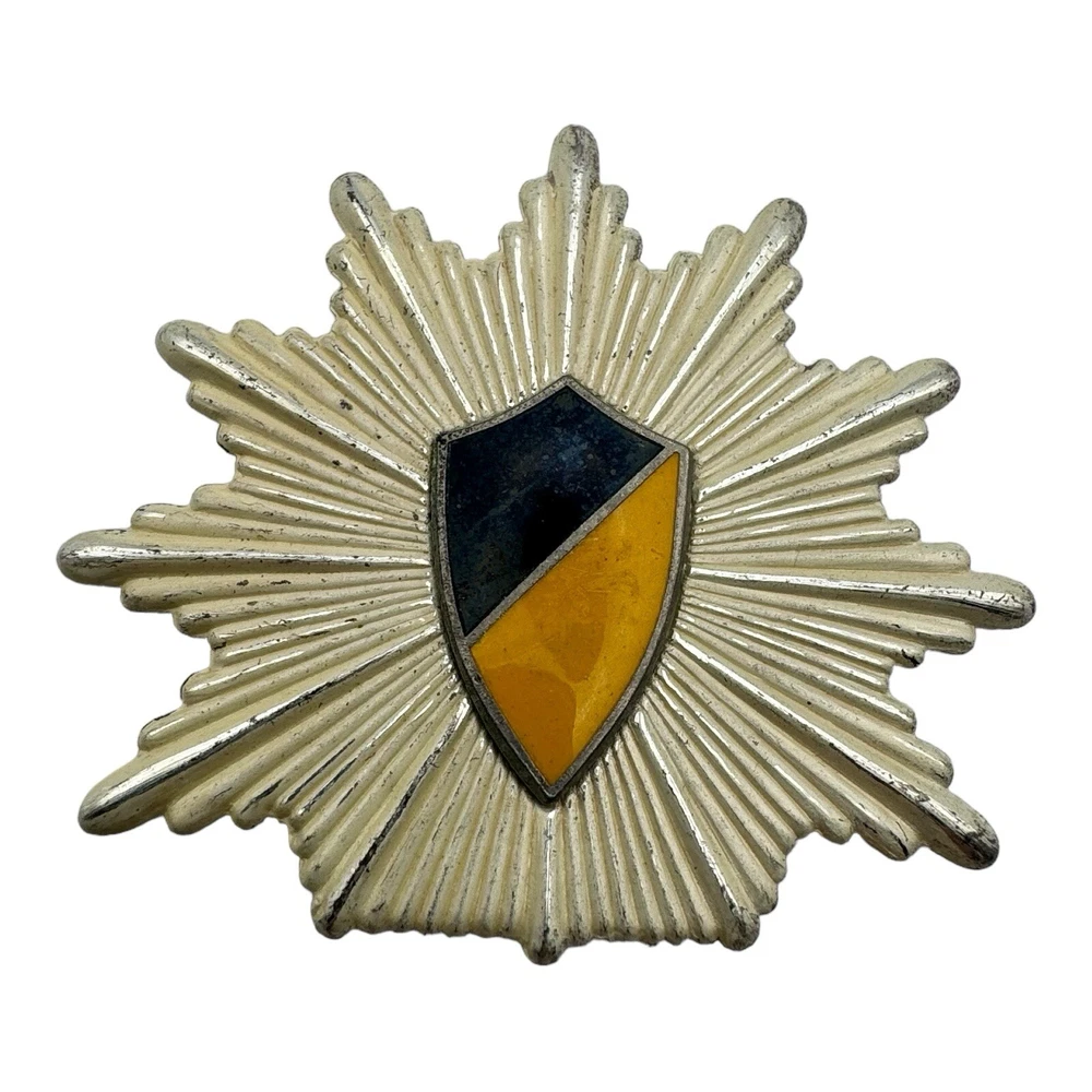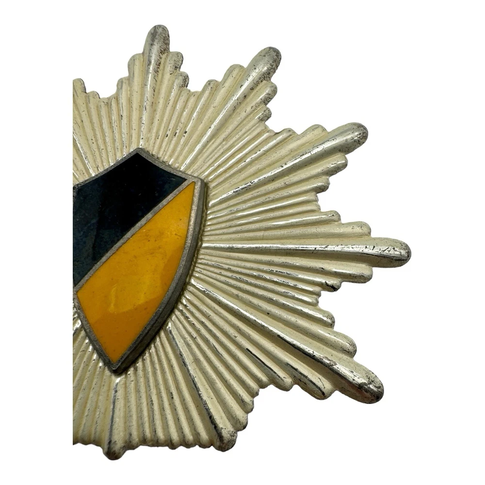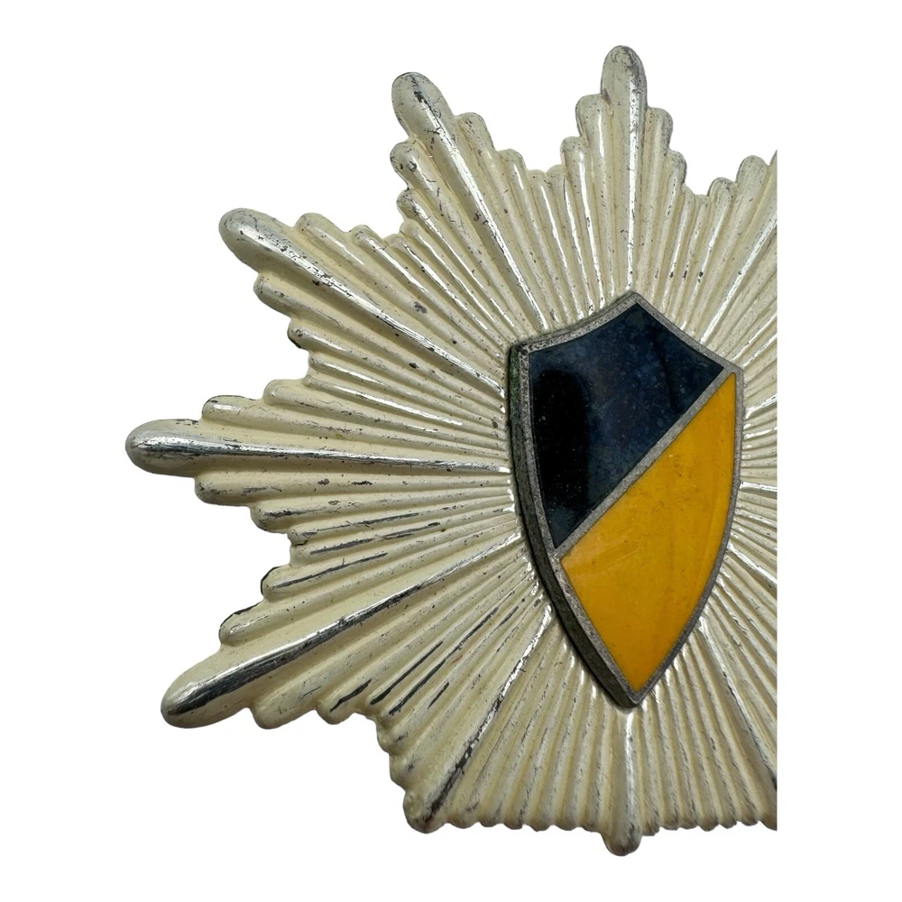 This vintage West Germany police badge features a distinctive star-shaped design with a black and yellow shield at the center. This obsolete badge is crafted from metal with intricate detailing, making it a unique collectible for those interested in historical police memorabilia. - Material: Metal - Design: Star-shaped with black and yellow shield - Condition: Good vintage condition **Key Features:** - Vintage West Germany police badge - Star-shaped design with black and yellow shield - Metal construction with detailed embossing - Ideal for collectors of police and historical memorabilia **History:** This badge, now obsolete, was once used by the police force in West Germany. The star shape and shield design are emblematic of the period and represent a piece of policing history from the mid-20th century.