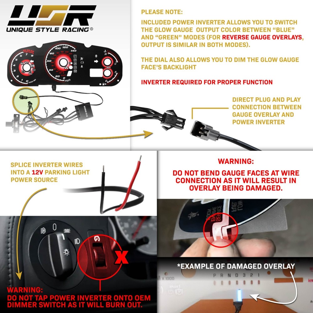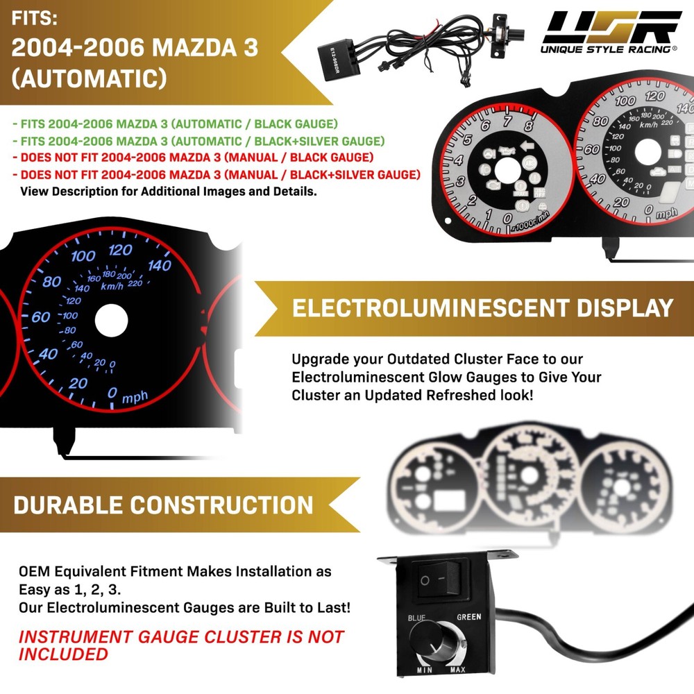 ATTENTION: For fitment and address issues, we will contact you through eBay message system first and by phone. If we are unable to get a hold of you or we cannot ship your order within 24 business hours after your order is placed, we will cancel the purchase instead. Please be sure you check product info carefully and enter your address correctly before purchase. Thank you. visit our store | View feedback | Sign up for our newsletter Please read and understand our complete description and policies/terms below prior to buy. EL-AC001-4 DESCRIPTION Product Details: This listing is for a BRAND NEW Black/Silver Gauge White/Red Glow Instrument Cluster Overlay with an Inverter Dimmer Switch Fit for: 2004-2006 Mazda 3 - Automatic only (Please always check the top speed and Redline on RPM matches between your stock instrument cluster vs. Glow Gauge set sold here) Features: * Upgrade to a more Aggressive White/Red Output Glow Gauge * Made by ISO2001 certified manufacturer, Excellent Quality! Specs: * Brand: Unique Style Racing (USR) * Type: Glow Gauge Overlay * Color: Black/Silver Gauge Face by Day / White/Red Glow by Night * Surface: Non-Glare/Scratch resistant * Install Process: These gauges do not require the removal of the gauge needles for installation. Though we provide reference installation links upon request, no installation instruction will be included. In the Package: * x1 Glow Gauge Overlay Set * x1 12V Power Inverter Switch Special Note: * Though we provide reference installation link (at buyer request), we highly suggest professional installation. * WARNING: This is the Gauge FACE overlay ONLY. The entire gauge cluster is NOT included. You lay the Overlay face on top of your existing gauge cluster, as this gauge face DOES NOT replace your STOCK cluster. The Glow Gauge Overlay Face here can only worked with the 12V power inverter supplied and the 12V power inverter dimmer should NOT be connected to stock gauge cluster's own dimmer for power. Buyer's discretion is advised, please purchase the item accordingly!! Important Notes: - Although DIY is possible, CERTIFIED & LICENSED PROFESSIONAL INSTALLATION is HIGHLY SUGGESTED . - We do not provide Installation Instruction except the manufacturer's original ones if there is any. - Direct OEM STOCK Replacement - No modification needed to fit the specified years / make / models / trims. - Our Products Are SPECIFICATION SENSITIVE and we ship DOOR to DOOR ONLY. Any package being sent to "FORWARDING COMPANY" is not our responsibility. - You, as the buyer / consumer are solely responsible for all damages and losses. - We highly recommend you to buy new gaskets prior to install the product you purchased from our company since the stock ones by now should have been worn out, therefore, it is easily allowing moisture to get in and create condensation which is NOT due to the product that has leak, but bad gaskets. - Some EXCEPTIONS For Warranty Claims: A.) No visible / physical damages to the product and / or warranty is void, B.) Alteration to the product will result in termination of warranty, C.) Be sure the stock gaskets or rubber seals are not torn and worn as you will need to reuse them when you replace your stock lights with ours. You will also be asked for photos that documents any *leaking*, *misting*, *fogging up* and *condensation* issues, as well as the condition of your stock gaskets or rubber seals. and lastly, D.) All of our lighting assemblies are NOT compatible with XENON HID and LED-type bulbs. Please use either incandescent or halogen bulbs per advertisement. - Please be sure to check the provided PHOTOS, read the DESCRIPTION and ask QUESTIONS before purchase. Thank you for your business. ABOUT US We're genuine and honest sellers and we carry great selection of the quality products to choose from, at a competitive pricing. Every order is carefully packaged and inspected by three of our staff using the latest technology to ensure safe shipment to you. We value good relationship with our customers and if you have any question or concerns regarding a sale, please do feel free to contact us first. Please do check your ebay message often for your order status, we will contact you for any delay that is caused by the payment or shipping complication arises from processing your order. We hope you enjoy your purchase! PAYMENT We accept payment by: Paypal. We accept PAYPAL only at this moment for all ebay transactions and MUST ship to paypal's listed address. 1.) If you are using eBay?s checkout system, please ensure that your registration information is current and will match what you have on PayPal. We will not be able to accommodate to change the original address we receive at the time of payment with an alternative one, once the transaction is completed via eBay and PayPal. 2.) We are required to ship to the address attached to your payment only. 3.) We will not be able to ship to an alternative address besides the original address shown on your PayPal payment detailed page. 4.) Please DO read and understand the policies / terms prior to buy to avoid any future discrepancy from occurring. Thank you for your cooperation! SHIPPING Please read and understand our complete policies/terms below or ask question if you have concerns prior to buy. 1.) Free shipping only applies to the listings that have the ?Free Shipping? icon displayed and for completed transactions. Any canceled, incomplete, refused or undeliverable packages are subjected to a 20% re-stocking fee + all shipping related fees. 2.) Shipping costs incurred are non-refundable under any circumstance. Shipping costs are incurred and paid to the shipping courier and they are not refundable. 3.) We DO NOT ship to APO / FPO, GUAM, MP, PUERTO RICO (PR) and VIRGIN ISLAND (VI) 4.) INTERNATIONAL COUNTRIES: Buyer is responsible for all Brokerage Fees, Taxes & Duties - which may be charged upon delivery. Please contact your local shipping agent to determine your estimated taxes & duties. 5.) P