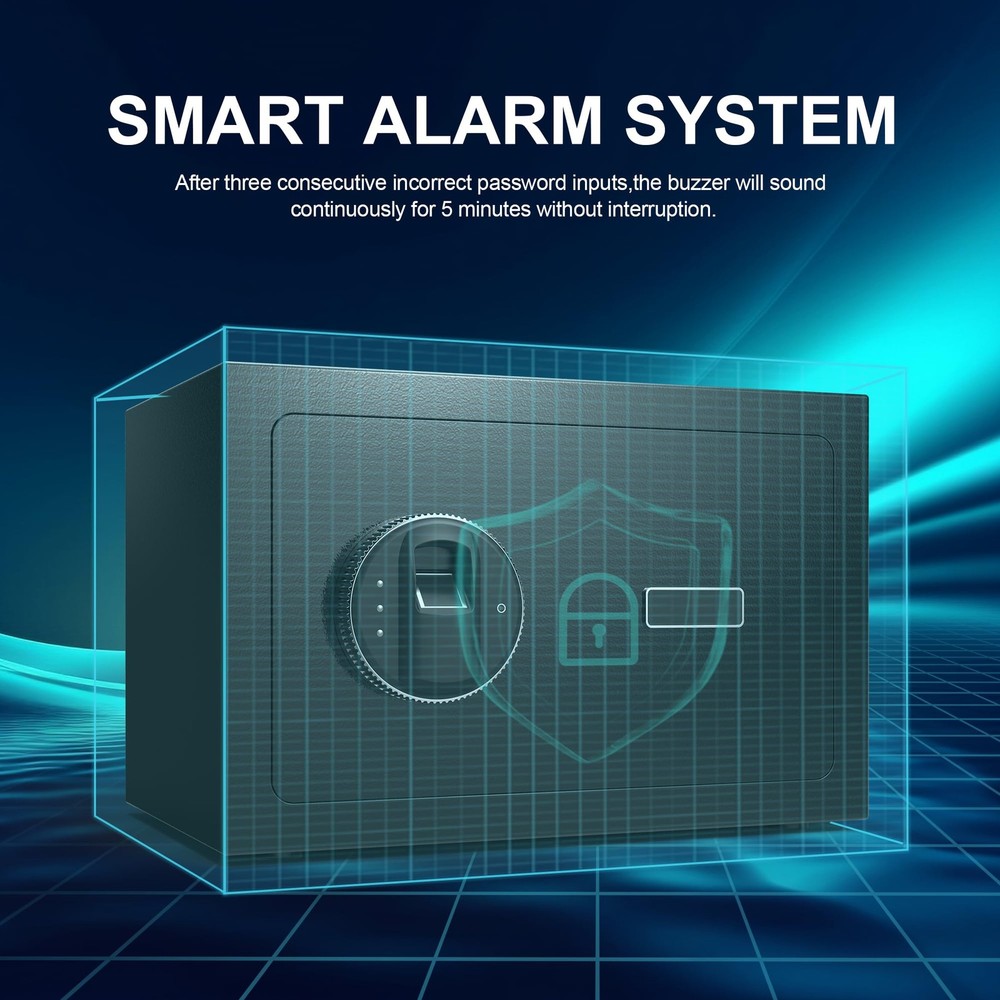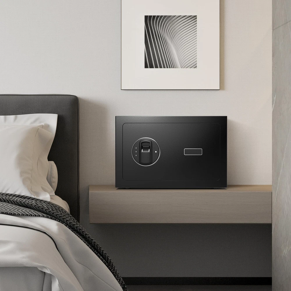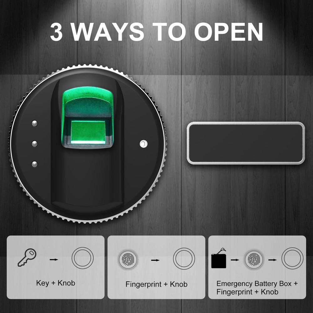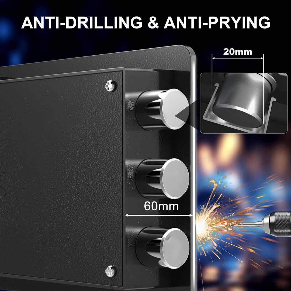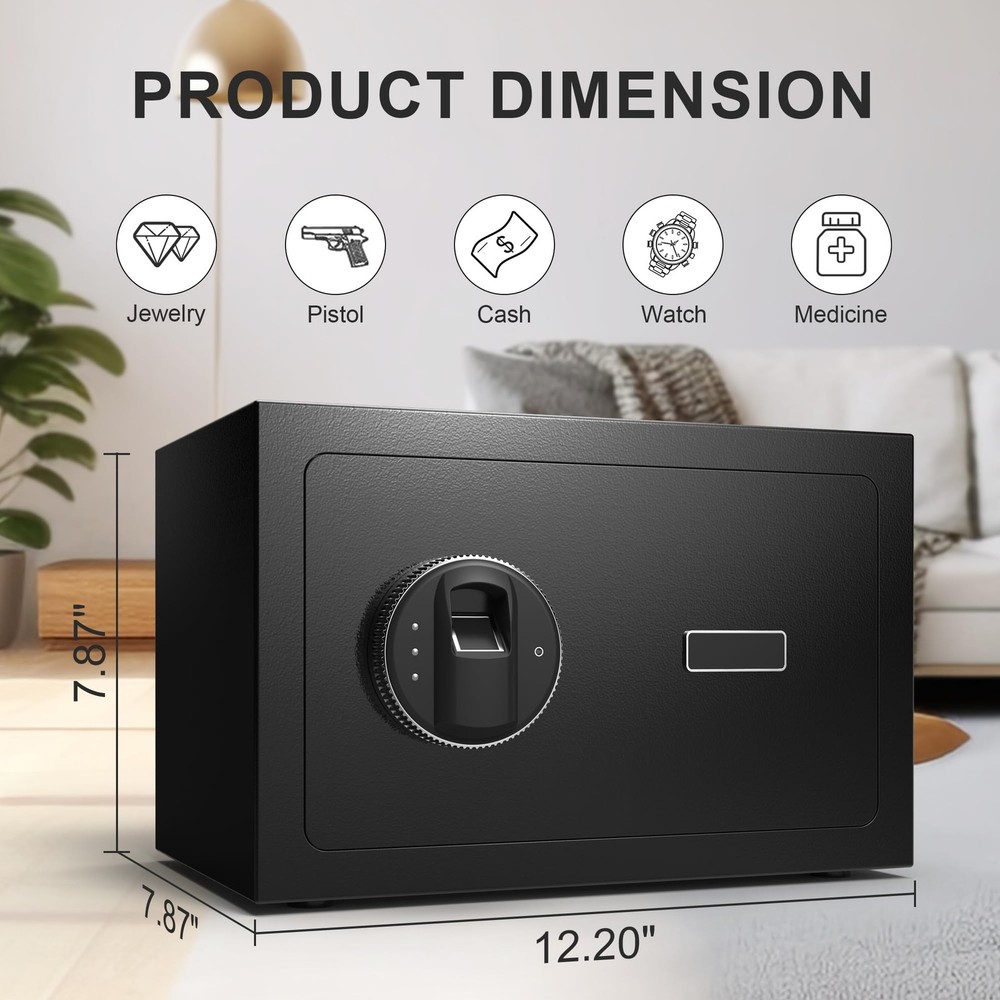 z20 【SECURE AND DURABLE】: This small safe box is made of high quality cold carbon steel, which is strong and reliable. It has three 20mm diameter locking bolts, which provides maximum for your valuables compared to the only locking latches available in the market. Meanwhile, the personal safe is rigorously tested just to bring you the perfect product. Size: 7.87 "H*12.20 "W*7.87 "D. 【FINGERPRINT LOCK SAFE】: Our safe comes with a fingerprint reader and key. Biometrics allows you to open the safe quickly and also prevents children from getting their hands on something dangerous or important, as well as from prying eyes of unsuspecting people. 【MULTIPLE UNLOCKING METHODS】: ① fingerprint + knob; ② key + knob; ③ battery box + fingerprint + knob. Note: Please DO NOT leave the key in the safe; the batteries needed in the safe and the battery box are not included in the package, you need to prepare them in advance. 【CONCEALED AND FLEXIBLE】: The bottom of the small safe is lined with egg nubs to protect stored items from scuffing. It also has 2 pre-drilled mounting holes on the back with expansion screws to securely fasten it to a closet or wall, which prevents it from tipping over when the door is opened and prevents thieves from stealing it. 【AFTER-SALES SERVICE】: If you encounter any problems in the process of use or any questions about the product, you can us at any time, we will try our best to provide you with a satisfactory answer. Tips: If the fingerprint is not set up or fails, any fingerprint can open the safe. Please set up your fingerprint immediately upon receipt !!!