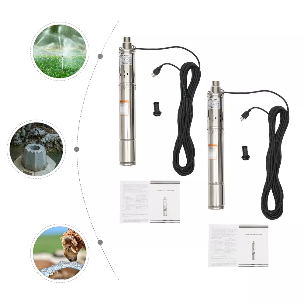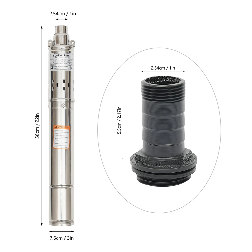 0.5HP/1.0HP Stainless Steel Deep Well Pump 3" Submersible Pump 115V 60Hz IP68 ❤Welcome❤ YLYO37-000000US 0.37KW, 0.5HP Description This deep well pump is precision cast from high-grade stainless steel, and its excellent resistance to pressure and corrosion ensures that the product remains stable and less prone to deformation in extreme environments. Once installed, simply place it in the water for fast pumping. Whether it is to meet the demand for pure water in daily life, or to help the irrigation project of vast farmland, it can be free and easy. Key Features Sturdy and Durable : High-quality stainless steel shell, copper motor, and polishing process make this product corrosion-resistant, wear-resistant , not easy to deform, and can ensure long-term use. Safety Guard : The IP68 waterproof rating ensures that the unit works completely submerged in water. It also features effective overheating protection to extend the product's lifespan. Powerful Pumping Tool : Whether you're looking for a solution to your industrial, farm, or home water supply, this deep well pump is one you can count on. It is good for a garden water source and a sprinkler for kids. You can use this pump to pump water from deep wells, reservoirs, canals, rivers, and other water-lifting projects. High Efficiency : It uses precision bearings and a high-quality motor to enable the pump to reach a speed of 3450r/min, which can lift water to 262.47ft, so a large amount of water( 1.8m³/h ) can be pumped quickly and efficiently. High Applicability : This product has no special requirements for wells and water pipes, which means that the pump can be used in steel tube wells, grey tube wells or earth wells. Where pressure permits, it can also be used with steel pipe, hose or plastic pipe as water mains. Low Noise : It uses a high-quality copper motor that generates only 30 dB of noise during operation. In addition, the submersible operation mechanism cleverly absorbs and reduces noise transmission by immersing the machine in the medium, creating a quiet and harmonious operating atmosphere. Simple Operation : This well pump comes with a 49.21ft cable that combines the motor and the pump into one. All you need to do is put the deep water pump into the well water and plug it in to pump out the water, which is very easy to operate. Small Footprint : This deep well pump is designed to resemble a carefully crafted underground gushing artifact thanks to its delicate and compact dimensions(3*22in). A great alternative to traditional, bulky deep-water well pumps, it is an efficient and portable way to dive into deep wells and harness the veins of underground water. Effortless Cleaning: Thanks to the smooth surface and simple structure, you can easily wipe off the dirt on it with a soft cloth. Details Double Lifting Eye Hole : It adopts the design of a double-lifting eye hole position, which is convenient to use with steel wire rope or nylon rope(not included) when going down the well. Long Power Cord : The 49.21 ft power cord makes you more convenient and flexible when connecting to the power source. Water Outlet : A 1-inch outlet makes it easy for you to connect the pumping head and hose, saving you time and effort. Application It is suitable for extracting groundwater from deep wells and can supply water to septic tanks, villages, homes, farms, camper vans, etc. It can also be used in rivers, reservoirs, canals, and other water-lifting projects. It is used for both farmland irrigation and mountainous areas for water supply for people and animals, and also for drainage of cities, factories, railways, and mines. Specification Type: 3QGD1.2-50-0.37 Color: Silver Material: Stainless Steel, Copper Process: Polishing Power Source: Electric Powered Voltage: 115V Frequency: 60Hz Plug Type: US Standard Power: 0.37KW,0.5HP Max. Flow Rate: 1.8m³/h Max. Lift: 80m/262.47ft Speed: 3450r/min Noise: 30dB Protection Class: IP68 Number of Impellers: 1 Pumping Head (D*H): 2.54*5.5cm/1*2.17inch Product Size(D*H): 7.5*56cm/3*22in Water Outlet Size: 2.54cm/1in Cable Wire Length: 15m/49.21ft Gross Weight: 7.3kg/16.09lbs Package Size: 63*15*8cm/24.8*5.9*3.15in Package Included 1*Deep Well Pump 1* Pumping Head 1*English Manual Notes Please do not use without water or with a low water level to avoid idling. Deep well pumps need to be installed vertically. Please install an additional check valve (not included) at the outlet to prevent backflow. Please read the user manual carefully before use and pay special attention to the safety precautions included. Please allow the slight color difference caused by the shooting light and 1-3cm error due to manual measurement, and make sure you do not mind before you place the order. YLYO37-000100US 0.75KW, 1.0HP Description This deep well pump is precision cast from high-grade stainless steel, and its excellent resistance to pressure and corrosion ensures that the product remains stable and less prone to deformation in extreme environments. Once installed, simply place it in the water for fast pumping. Whether it is to meet the demand for pure water in daily life, or to help the irrigation project of vast farmland, it can be free and easy. Key Features Sturdy and Durable : High-quality stainless steel shell, copper motor, and polishing process make this product corrosion-resistant, wear-resistant , not easy to deform, and can ensure long-term use. Safety Guard : The IP68 waterproof rating ensures that the unit works completely submerged in water. It also features effective overheating protection to extend the product's lifespan. Powerful Pumping Tool : Whether you're looking for a solution to your industrial, farm, or home water supply, this deep well pump is one you can count on. It is good for a garden water source and a sprinkler for kids. You can use this pump to pump water from deep wells, reservoirs, canals, rivers, and other water-lifting projects. High Efficiency : It uses precision bearings and a high-qualit