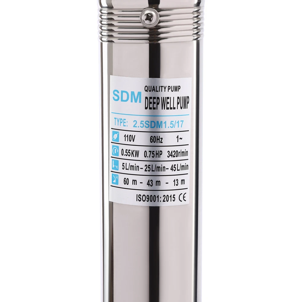 Specifications Material: Stainless Steel, Copper, Plastic, Rubber Color: Silver and Blue Process: Polishing Assembly Required: Yes Power Source: Corded Electric Plug Type: US Standard Type: 2.5SDB1.5/17 Voltage: 110V, 60Hz Power: 0.55KW(0.75HP) Speed: 3420rpm Delivery Lift: 13m/42.65ft, 43m/141ft, 60m/196.85ft Flow Rate: 5L/1.32gal/min, 25L/6.6gal/min, 45L/11.89gal/min Number of Impellers: 17 Outlet Diameter: 2.54cm/1in Cable Length: 20m/65.62ft Control Box Size: 18.5*15*6.8cm/7.28*5.91*2.68in Water Outlet Size(D*H): 2.54*5.5cm/1*2.17in Gross Weight: 12.5kg/27.56lbs Package Size: 96.5*26.5*11cm/37.99*10.43*4.33inch Product Size(D*H): 6.6*107.2cm/2.6*42.2in Package Included 1* Submersible Pump 1* Water Outlet 1* Control Box 1* English Manual 0.75HP Deep Well Submersible Pump 1" Outlet 110V Stainless Steel w/ Control Box Description If you're looking for an efficient and simple irrigation solution, take a look at our submersible pump, a jewel in the world of irrigation technology for its performance and ease of operation. This submersible pump's unique design of deep water and silent operation quietly provide your farmland with a constant supply of living water, making every inch of soil come alive, which is undoubtedly the ideal choice for scientific irrigation and improved agricultural efficiency. Key Features Build to Last : It is made of high-quality stainless steel, copper, plastic, and rubber, and adopts a polishing process, making it solid, and not prone to rust and corrosion, so it can remain beautiful and practical for a long time. High Efficiency: The 0.55KW submersible motor, 3420rpm speed, maximum 11.89gal flow rate with 17 impellers as well as a diffuser and intake screen make your pumping and watering work faster and easier. Large Delivery Lift: The maximum lift of the pump is 196.85ft, which allows you to irrigate farmland, fish ponds, and orchards for a long distance, saving the time and cost of manual transportation. Easy to Clean: Thanks to its smooth surface and simple structure, and it is used to work in water, so it is very easy to clean. Space-saving: Vertical construction and compact dimensions ( 2.6*42.2 inches ) allow it to be used or stored in the trunk of a car without taking up too much space. Simple Installation: Simple construction and a detailed English manual make it easy to put together and get up and running quickly. Protective Package: Our product is packaged with a sponge to maximize protection from damage during shipping. Customer Service: We aim to provide quality products and services. If you have any problems, please feel free to contact us. We will reply and solve the problem for you as soon as possible. Details Standard Water Outlet: The pump adopts a 1-inch large diameter water outlet, which can be matched with different types of water pipes and is very practical. Long Cable: The 65.62ft long cable increases safety and convenience for you. Application This product is suitable for extracting groundwater from deep wells, and can also be used in water-lifting projects of rivers, reservoirs, canals, and so on. It can be used for farmland irrigation, and water for humans in mountainous areas, villages, homes, farms, campervans, cities, factories, and railways. Specifications Material: Stainless Steel, Copper, Plastic, Rubber Color: Silver and Blue Process: Polishing Assembly Required: Yes Power Source: Corded Electric Plug Type: US Standard Type: 2.5SDB1.5/17 Voltage: 110V, 60Hz Power: 0.55KW(0.75HP) Speed: 3420rpm Delivery Lift: 13m/42.65ft, 43m/141ft, 60m/ 196.85ft Flow Rate: 5L/1.32gal/min, 25L/6.6gal/min, 45L/11.89gal/min Number of Impellers: 17 Outlet Diameter : 2.54cm/1in Cable Length: 20m/65.62ft Control Box Size: 18.5*15*6.8cm/7.28*5.91*2.68in Water Outlet Size(D*H): 2.54*5.5cm/1*2.17in Gross Weight: 12.5kg /27.56lbs Package Size: 96.5*26.5*11cm/37.99*10.43*4.33inch Product Size(D*H): 6.6*107.2cm/2.6*42.2in Package Included 1* Submersible Pump 1* Water Outlet 1* Control Box 1* English Manual Notes Please check that the voltage and frequency correspond to local standards before ordering. Please do not use it without water. Please note that the pump needs to be installed vertically. Please note that the pumping speed is related to the depth at which the water pump enters the water, and the deeper the depth, the lower the speed. Please note that this product is only suitable for pumping clear water, not oil, chemical raw materials, and other liquids. Please read the operating manual and label completely before use, and pay particular attention to the safety instructions included. Please allow the slight color difference caused by the shooting light and 1-3cm error due to manual measurement, and make sure you do not mind before ordering. Payment Delivery details Terms of sales About us Contact us Payment We accept ebay payment 。 Fees such as import duties, taxes are not included in the item price or shipping costs. These charges are the buyer's responsibility. Delivery details Shipping: 2-9 working days to: USA Terms of sales We maintain high standards of excellence and strive for hundred percent customer satisfaction. Feedback is very important to us. We hope that you contact us immediately before you give neutral or negative feedback, so that we can address your concerns. It is impossible to address issues if we do not know about them! About us Your satis faction is our ultimate goal. We work hard to earn your trust and future business. Our certified technicians have tested each item before shipping. The unit comes with 1 year limited warranty on all manufacturing defects. a) If you receive a defective item, you may return it or ask for a discount. Please contact us within 14 days after you receive the package. b) What you returned must be intact and in its original packaging as re? u. Customer is responsible for shipping costs of the returned item. c) We will cover the cost of shipping back t with the shipping rate indicated in the registratio