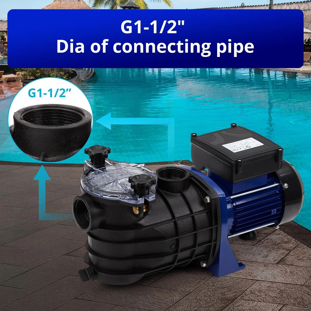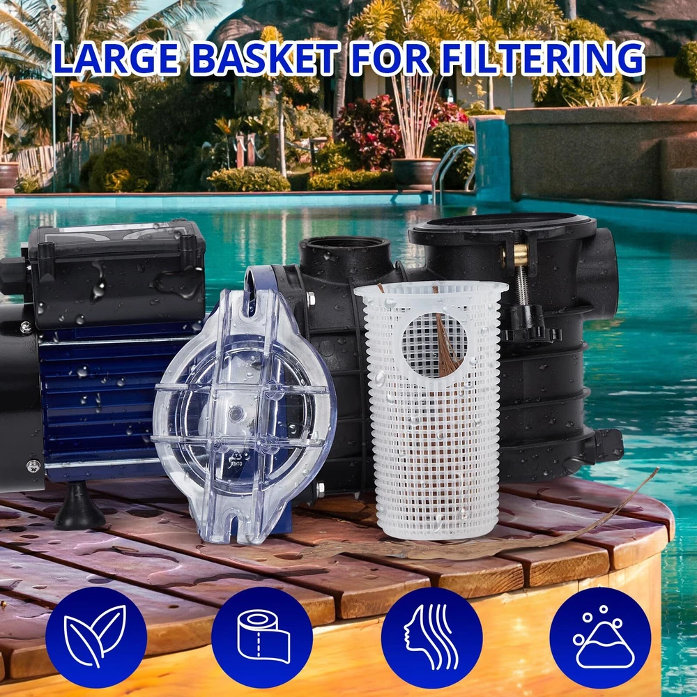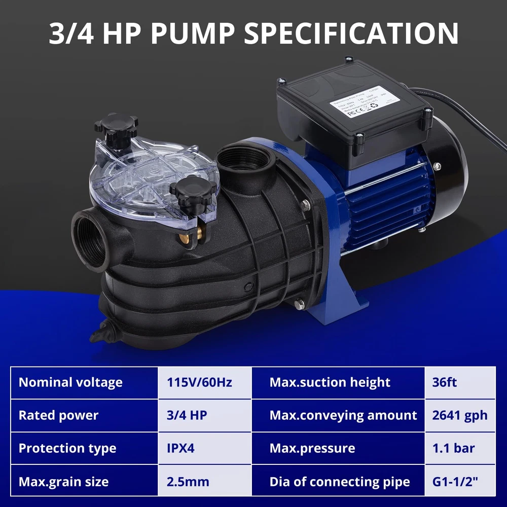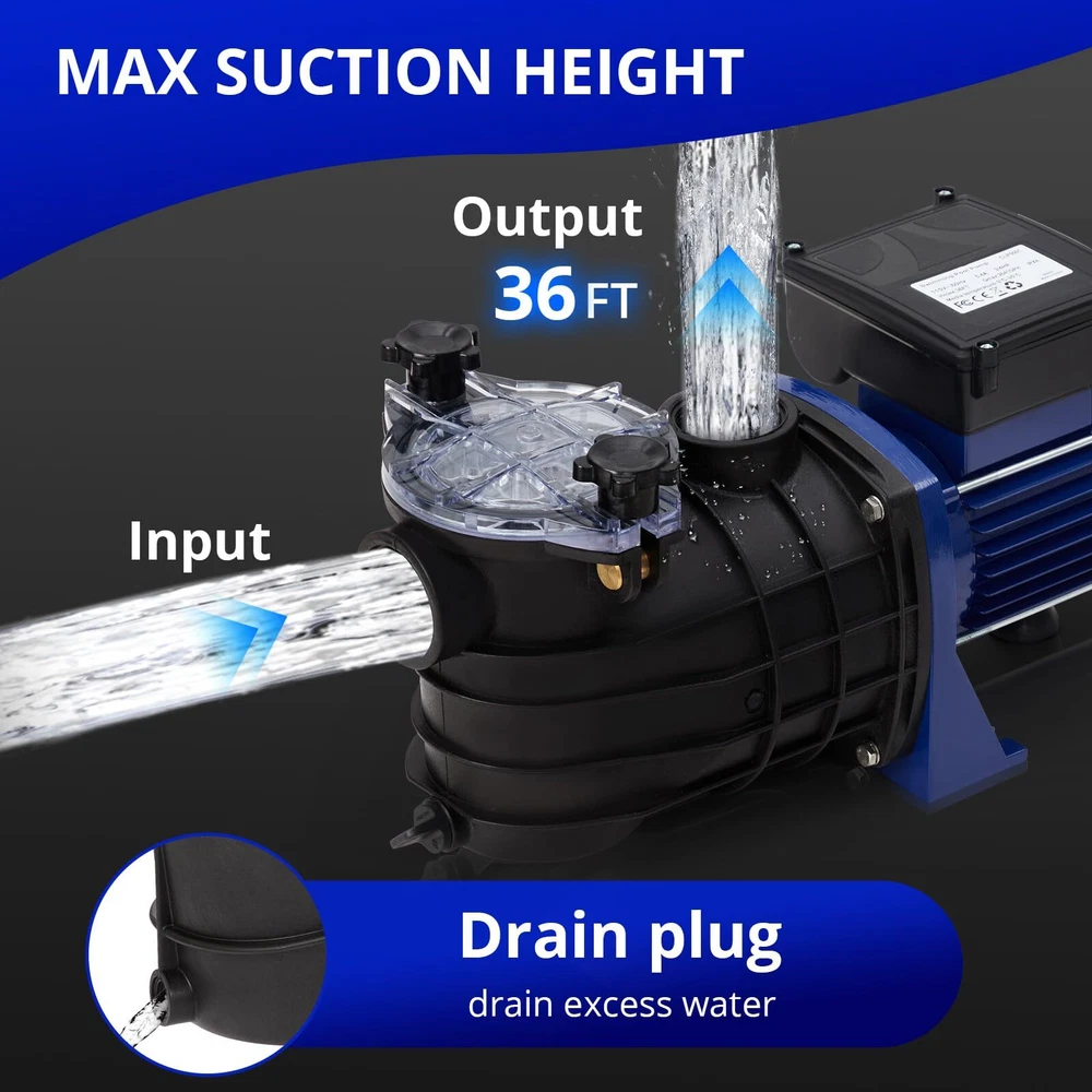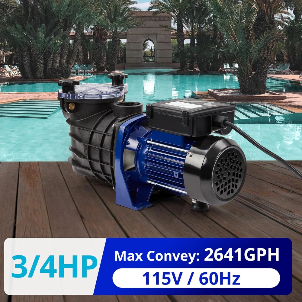 【Efficient Performance】The 550W 3/4HP pool pump has built-in thermal overload protection and provides pressure and the powerful flow can achieve 2641GPH and the maximum suction height can reach 36ft. 【Long-Lasting and Durable】The Swimming Pool Pump with Pure copper motor with stainless-steel motor shell provides not only an efficient, stable and safe running, but also long service life. It's specifically designed as a circulating water filtration for constantly keep your swimming pool crystal clear and sanitary 【Humanized Design】This swimming pool pump equipped with a drain plug on the bottom which is easy for drainage and avoids water accumulation during winter, provides easy maintenance of pump. Extra-large filter basket with clear cover keeps pool maintenance to a minimum.Transparent cover helps to judge if the basket needs clean or not. 【Wide Applications】The pool pump is ideal for all types of above-ground pools, hot tubs, thermal springs, spas, and irrigation systems. Our pool pump will bring you a clean and clear water environment to enjoy your leisure time. Note: During extreme weather conditions, do not keep electrical components operating 【Secure Design】The housing of the pump is made of sturdy ABS and aluminum material, durable and corrosion-proof, preventing the motor and internal device from damage.** BEFORE YOU BUY - Please be aware that this item is not available for use or sale in the state of California due to motor limitation required by CEC**