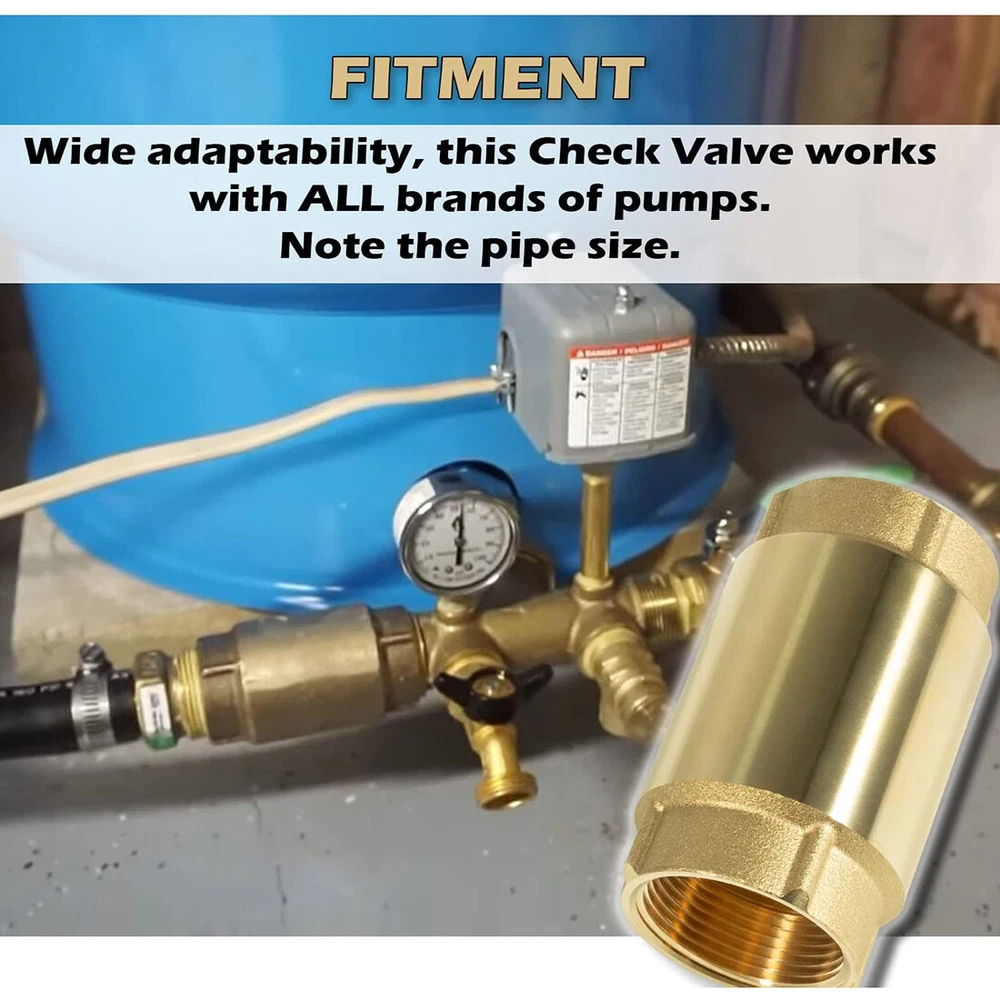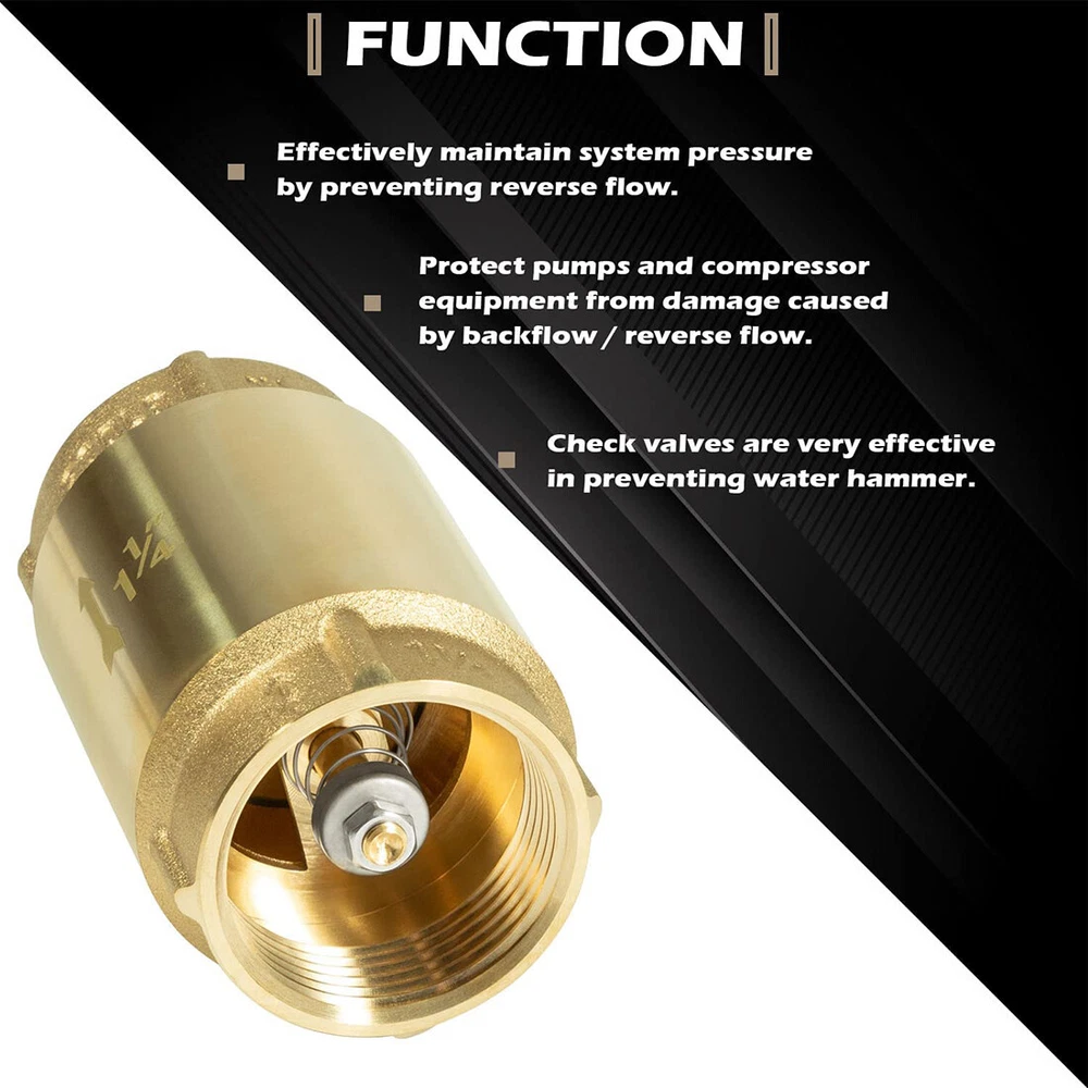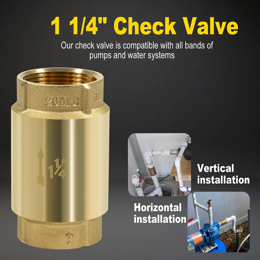 Fitment: Wide adaptability, this Check Valve works with ALL brands of pumps. Note the pipe size Features: 1) It’ unnecessary to run around searching for check valve applications. Our check valve is compatible with all bands of pumps and water systems. Both vertical and horizontal installations are available 2) 1-1/4" Check Valves effectively maintain system pressure by preventing reverse flow. Protect pumps and compressor equipment from damage caused by backflow / reverse flow. Check valves are very effective in preventing water hammer 3) Can be installed in both horizontally and vertically. Stainless Steel Spring and Fasteners. Spring-loaded poppet and O-ring assures reliable operation. Max Pressure: 200 PSI. Max Temperature: 180 F (80 C) 4) Abrasion resistant O-Ring is precision fitted to the poppet for a positive seal into a tapered self-cleaning valve seat. Spring check valve will help minimize effects of water hammer 5) Arrow on the valve this is important as the side from which the fluid enters and exits must be correct when installed Package included: Check Valve 1 1/4"