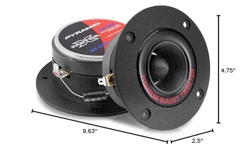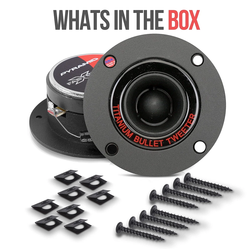 Model : TW18BK 300 Watt Super Titanium Tweeter 3.25'' 300 Watt Aluminum Die-Cast Super Titanium Tweeter 3.25'' Aluminum Bullet Horn w/1'' Super Tweeter 20 oz. Magnet Structure 300 Watts Rated Power Ferro Fluid Enhanced Frequency Response: 2k-25kHz SPL: 96dB 4/8 Ohms Impedance Complete to Any Woofer Enclosure Complete Pair w/Capacitor Crossover Network & Hardware 2k-25kHz FREQUENCY RESPONSE: ’s 1'' car tweeter speaker has enhanced Ferrofluid and 2k-25kHz frequency response that will complete a sound system of a car or woofer enclosure 300 WATT POWER: This bullet horn super tweeter speaker provides up to 300 watts peak power because it is equipped with 20 oz magnet structure. It's all housed in heavy duty aluminum housings 4-8 OHM IMPEDANCE: This car tweeter has 4 to 8 ohm impedance rating that compensates the undersized wire found in many of today’s cars. It ultimately reduces distortion so you can enjoy a crisp and clear sound STANDARD SIZE: follows the standard size for most car stereo systems and created this set with a 1” audio tweeter plus a 3.25” bullet horn aluminum die-cast titanium dome. The heavy duty housing and structure provides a strong foundation acr 1 PAIR: This set of tweeters come in a pair with all necessary which are very to install with a capacitor crossover network and hardware. The SPL is 96cB and weighs 2.71 lbs