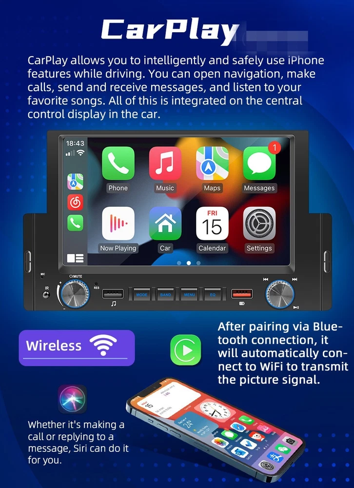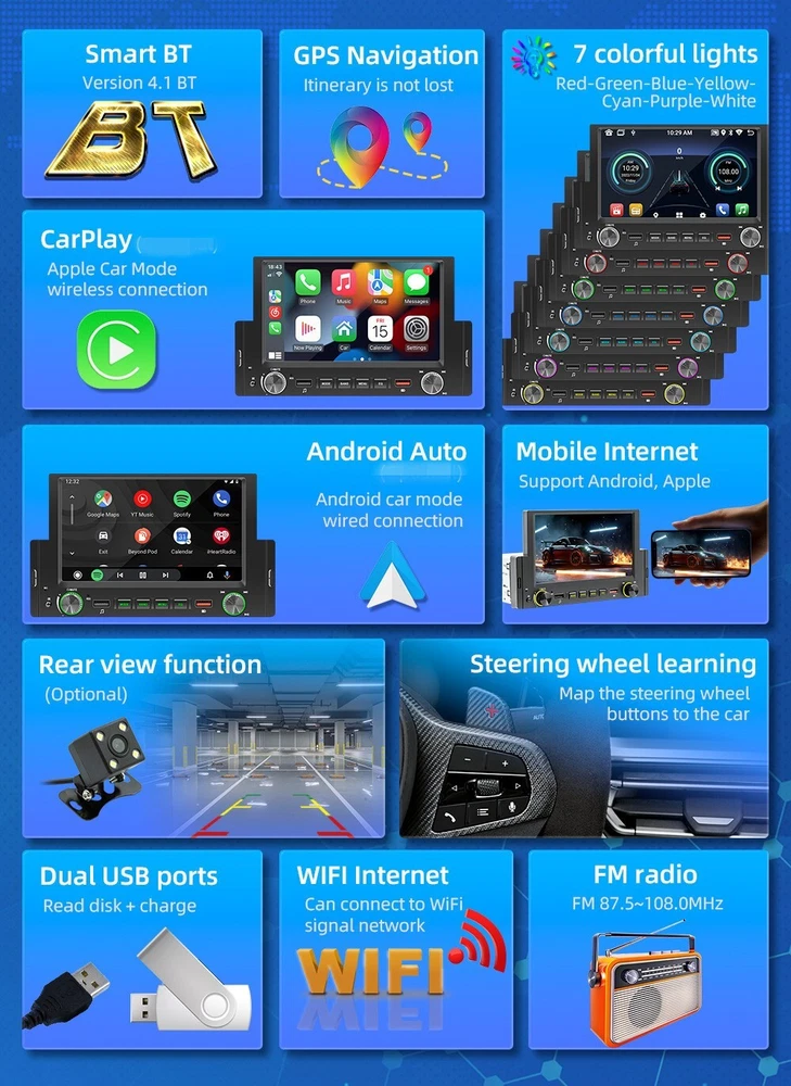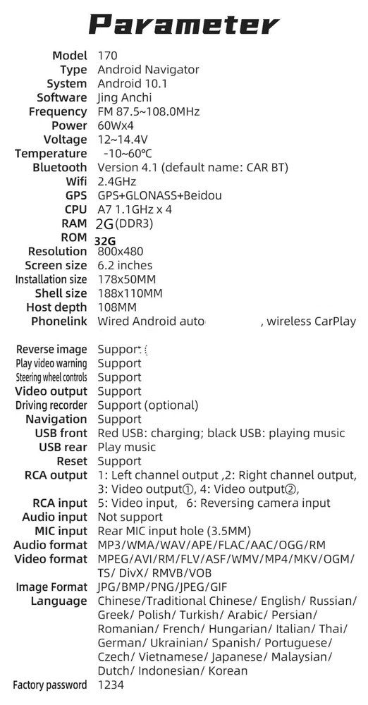 Product Description 1 Din Car Radio W/12LED Camera Android 10.1 Bluetooth Handsfree Wifi GPS USB Mirror Link 6.2in Multimedia Player 2+32G Head Unit Support CarPlay Android-Auto Add our listing to Watchlist Or Add to Cart , you will get more discount Performance parameters Type: Android navigation machine System: Android 10.1 Software solution: Jing Anchi Radio IC: FM 87.5~108.0MHz Power amplifier IC: YD7388 Output power: 60Wx4 Working voltage: 12~14.4V Working temperature: - 10~60 ℃ Bluetooth version: 4.0 (default name: Car BT) Wifi frequency:2.4GHz GPS signal:GPS+GLONASS+Beidou CPU:A7 1.1GHz x 4 Operating memory 2G (DDR3) Memory:32G Display resolution: 800x480 Screen size: 6.2 inches Installation size:178x50MM Face shell size: 188x110MM Host depth: 108MM Functional parameters Mobile internet: support Reverse camera:support (camera optional) Play video warning: support Steering wheel control: supports key learning Video output: support Offline map: is not supported DASH CAM: support (optional) GPS navigation: support USB: front USB charging (red)+front USB2.0 reading (black)+rear USB2.0 reading TF card: does not support Reset button: support Audio output: 2 channels (left channel+right channel) Video output: 2 channels Audio input: is not supported Rear external microphone input: support (optional) Video input: 1 channel Reverse video input: 1 channel Audio format: MP3/WMA/WAV/APE/FLAC/AAC/OGG/RM Video format: MPEG/AVI/RM/FLV/ASF/WMV/MP4/MKV/OGM/TS/DivX/RMVB/VOB Picture format: JPG/BMP/PNG/JPEG/GIF Language parameters Chinese/Chinese Traditional/English/Russian/Greek/Polish/Turkish/Arabic/Persian/Romania/French/Hungarian/Italian/Thai/German/Ukrainian/Spanish/Portuguese/Czech/Vietnamese/Japanese/Malaysia/Dutch/Indonesian/Korea Factory setting password: 1234 Basic functions 1. Radio (FM) 2. Read USB flash disk (audio/video/pictures) 3. Audio input function 4. Bluetooth function 6. Rear view function (camera optional) 7. Video input 8. Original vehicle steering wheel learning function 9. Android recorder can be installed 10. WIFI internet access 11. GPS navigation 12. Mobile Internet (Android/Apple) 13. APP can be installed 14. Wired/wireless android auto, wireless carplay Accessories 1. Host 2. Instruction 3. Power cord 4. Remove the key 5. 12LED Rear Camera Payment Returns Contact Us Shipping We accept payment by PayPal only ! Payment should be completed within 5 days after buyer places the order,or else an unpaid case will be opened in order to cancel the transaction. If you can not pay in time, please contact us. e-check from PayPal will only be processed once the payment clears. All of the items will be shipped to buyer's EBAY address,please confirm your address on Ebay before you buy.Your order will be usually shipped out the same or next business days once the payment is made and cleared. 30-day Warranty with Exchange for defective, malfunctioned, incorrect or parts-missing items. Please notify us and return the item with all parts and accessories packed and marked "FOR EXCHANGE" within 14 days of receipt. If defective, malfunctioned or parts-missing items are no longer available, a refund may be issued. All returning postage costs will be the responsibility of the buyers under all circumstances. If you encounter any problems about anything, please feel free to contact us and we will do our best to assist you solve the issue. If you are not satisfied in anyway, please feel free to let us know and give us a second chance to correct it before you decide to leave any neutral or negative feedback. Please contact us through eBay link if you have any questions. We will reply you within 24- 48 hours. Please check you spam mail if no response for 48 hours. All items will be checked before packing. All items are new and of high quality. Item will be shipped within 1 business days upon receipt of payment, excluding weekends and public holidays. If to USA,we will ship your order by USPS,it will take about 8-12 working days to you,and you can track it on line. If to other country,we will ship your order by China Post or Singapore Registered Air Mail,it will take about 14-21 working days to you,you aslo can track it on line. Delivery time is about 14-28 business days and it may take up to 8 weeks . Payment We accept payment by PayPal only ! Payment should be completed within 7 days after buyer places the order,or else an unpaid case will be opened in order to cancel the transaction. If you can not pay in time, please contact us. eCHECK from PayPal will only be processed once the payment clears. All of the items will be shipped to buyer's EBAY address,please confirm your address on Ebay before you buy.Your order will be usually shipped out the same or next business days once the payment is made and cleared. Returns 30-day Warranty with Exchange for defective, malfunctioned, incorrect or parts-missing items. Please notify us and return the item with all parts and accessories packed and marked "FOR EXCHANGE" within 14 days of receipt. If defective, malfunctioned or parts-missing items are no longer available, a refund may be issued. All returning postage costs will be the responsibility of the buyers under all circumstances. Contact Us If you encounter any problems about anything, please feel free to contact us and we will do our best to assist you solve the issue. If you are not satisfied in anyway, please feel free to let us know and give us a second chance to correct it before you decide to leave any neutral or negative feedback. Please contact us through eBay link if you have any questions. We will reply you within 24- 48 hours. Please check you spam mail if no response for 48 hours. Shipping All items will be checked before packing. All items are new and of high quality. Item will be shipped within 1 business days upon receipt of payment, excluding weekends and public holidays. If to USA,we will ship your order by USPS,it will take about 7-10 working days to you,and you can track it on line.