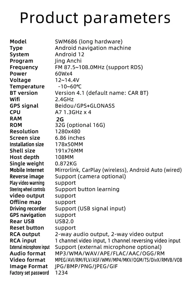 Product Description Android 12 Multimedia Player 6.86in 1 Din GPS Navigation WiFi FM Bluetooth Radio Car Video Player 2+32G CarPlay Android Auto Mirror Link With Free Rearview Camera Kit Add our listing to Watchlist Or Add to Cart , you will get more discount Basic parameters Type: Android Navigator System: Android 12 Radio frequency: FM 87.5~108.0MHz Radio IC: 6625 Power amplifier IC: YD7388 Output power: 60Wx4 Working voltage: 12-14.4V Working temperature: -10~60 ℃ Bluetooth version: 4.1 (default name: CAR BT) WiFi frequency: 2.4GHz GPS signal: Beidou/GPS+GLONASS CPU: A7 1.3GHz x 4 Running memory:2G (DDR3) Storage memory:32G Display resolution: 1280x480 Screen size: 6.86 inches Installation size: 178x50MM Shell size: 191x76MM Host depth: 108MM Functional parameters Mobile Mirror Link: support Reverse camera:support (camera optional) Play video warning: support Steering wheel control: supports key learning Video output: support Offline map: support Dash cam: support (USB signal input) GPS navigation: support Rear USB: USB 2.0 Reset button: support Audio output: 2 channels (left channel+right channel) Video output: 2 channels Video input: 1 channel Reverse video input: 1 channel External microphone input: support (optional external microphone configuration) Audio format: MP3/WMA/WAV/APE/FLAC/AAC/OGG/RM Video format: MPEG/AVI/RM/FLV/ASF/WMV/MP4/MKV/OGM/TS/DivX/RMVB/VOB Image Format: JPG/BMP/PNG/JPEG/GIF Language parameters:Chinese/Chinese Traditional/English/Russian/Greek/Polish/Turkish/Arabic/Persian/Romania/French/Hungarian/Italian/Thai/German/Ukrainian/Spanish/Portuguese/Czech/Vietnamese/Japanese/Malaysia/Dutch/Indonesian/Korean Accessories 1. Host 2. GPS antenna 3. ISO power cord 4. USB cable 5. Instructions 6. Disassembly key 7. 4LED Rear Camera Kit Basic functions 1. Radio 2. Reading USB flash drives (audio/video/images) 3. Bluetooth function 4. Rear view function in reverse (camera not included) 5. Video input function 6. Original car steering wheel learning function 7. Can install Android recorder 8. WIFI internet access 9. GPS navigation 10. Mobile Internet (Android/Apple) 11. APP can be installed 12. External microphone (optional external microphone) 13. Wireless CARPLAY, wired Android AUTO 14. Recorder functions 15. RDS function, which can receive real-time traffic radio stations Payment Returns Contact Us Shipping We accept payment by PayPal only ! Payment should be completed within 5 days after buyer places the order,or else an unpaid case will be opened in order to cancel the transaction. If you can not pay in time, please contact us. e-check from PayPal will only be processed once the payment clears. All of the items will be shipped to buyer's EBAY address,please confirm your address on Ebay before you buy.Your order will be usually shipped out the same or next business days once the payment is made and cleared. 30-day Warranty with Exchange for defective, malfunctioned, incorrect or parts-missing items. Please notify us and return the item with all parts and accessories packed and marked "FOR EXCHANGE" within 14 days of receipt. If defective, malfunctioned or parts-missing items are no longer available, a refund may be issued. All returning postage costs will be the responsibility of the buyers under all circumstances. If you encounter any problems about anything, please feel free to contact us and we will do our best to assist you solve the issue. If you are not satisfied in anyway, please feel free to let us know and give us a second chance to correct it before you decide to leave any neutral or negative feedback. Please contact us through eBay link if you have any questions. We will reply you within 24- 48 hours. Please check you spam mail if no response for 48 hours. All items will be checked before packing. All items are new and of high quality. Item will be shipped within 1 business days upon receipt of payment, excluding weekends and public holidays. If to USA,we will ship your order by USPS,it will take about 8-12 working days to you,and you can track it on line. If to other country,we will ship your order by China Post or Singapore Registered Air Mail,it will take about 14-21 working days to you,you aslo can track it on line. Delivery time is about 14-28 business days and it may take up to 8 weeks . Payment We accept payment by PayPal only ! Payment should be completed within 7 days after buyer places the order,or else an unpaid case will be opened in order to cancel the transaction. If you can not pay in time, please contact us. eCHECK from PayPal will only be processed once the payment clears. All of the items will be shipped to buyer's EBAY address,please confirm your address on Ebay before you buy.Your order will be usually shipped out the same or next business days once the payment is made and cleared. Returns 30-day Warranty with Exchange for defective, malfunctioned, incorrect or parts-missing items. Please notify us and return the item with all parts and accessories packed and marked "FOR EXCHANGE" within 14 days of receipt. If defective, malfunctioned or parts-missing items are no longer available, a refund may be issued. All returning postage costs will be the responsibility of the buyers under all circumstances. Contact Us If you encounter any problems about anything, please feel free to contact us and we will do our best to assist you solve the issue. If you are not satisfied in anyway, please feel free to let us know and give us a second chance to correct it before you decide to leave any neutral or negative feedback. Please contact us through eBay link if you have any questions. We will reply you within 24- 48 hours. Please check you spam mail if no response for 48 hours. Shipping All items will be checked before packing. All items are new and of high quality. Item will be shipped within 1 business days upon receipt of payment, excluding weekends and public holidays. If to USA,we will ship your order by USPS,it will take about 7-10 working days to 