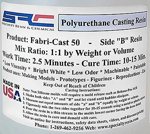 Fabri-Cast 50 1 Gal (0.5-Gal Part A + 0.5-Gal Part B) Polyurethane Casting Resin for Models, Figurines, and Sculptures, Silicone Hand Molding Set, Ultra Low Viscosity Liquid and Fast Curing Detail Capturing Resin - Our Fabri-Cast 50's low viscosity epoxy resin is perfect for capturing the most intricate details of your resin molds, making it ideal for complex craft and art projects. Quick Curing Time - This fast-curing polyurethane resin kit is perfect for resin mold and resin accessories projects, curing in just 10-15 minutes, making it more convenient than other resin products. Durable Casting Resin - Our casting resin has excellent impact resistance and strength, ensuring your resin creations last longer. This clear resin kit is perfect for both beginners and veterans. Silicone Mold Compatibility - This dependable resin kit is compatible with any silicone resin molds, whether store-bought or homemade, making it a versatile tool for your crafting needs. User-Friendly Resin - This 2-part polyurethane resin for adult crafts is easy to use, featuring a 1:1 mix ratio that's simple to follow. Ideal for both beginners and experienced crafters. Beginners' Go-To Casting Resin! Our Fabri-Cast 50 is a polyurethane casting resin that's great for first-timers. It's a 2-part compound that has a 1:1 ratio. This simple mix is super convenient and easy to follow, especially for beginners. This casting resin also cures quickly. Your resin projects will harden in just 15 minutes, which makes it perfect for projects that need a shorter window for curing. Ideal addition to your resin jewelry making kit, silicone mold making kit, and more. You can use this craft resin kit on a lot of different projects. This casting resin's applications include jewelry, reproductions, models, figurines, prototypes, and trinkets. So if you're a beginner who wants to try various types of crafts, our Fabri-Cast 50 is a great place to start. You can also add pigment dyes to this resin craft kit to give it some color. If it's your first time adding resin dye to your resin, you can check out our blogs or videos to get an idea of how to do it. A LOW VISCOSITY CRAFT RESIN This casting resin also has ultra-low viscosity. This helps in capturing even the most intricate details of complicated resin art. It also helps in releasing air and reducing bubbles. This improves your craft's surface quality. A BRAND COMMITTED TO YOU We at Specialty Resin & Chemical always put you first. We are committed to producing high-quality products that meet your different needs. We also provide superior customer service for any assistance you might require while you're making your masterpieces. At any point of the craft process, we got your back! Our casting resin is a great addition to any resin craft kit. Grab our Fabri-Cast 50 now! Shipping We offer FREE shipping on all orders! We ship within Three business days of payment, usually sooner. We use a selection of shipping services such as UPS, FedEx, USPS etc. We only ship to the lower 48 states, no APO/FPO addresses or PO Boxes allowed. Local pickups and combined shipping options are not provided at this time. Return You can return a product for up to 30 days from the date you purchased it. Any product you return must be in the same condition you received it and in the original packaging. Please keep the receipt. Payment We accept payment by any of the following methods: PayPal Please pay as soon as possible after winning an auction, as that will allow us to post your item to you sooner! Feedback Customer satisfaction is very important to us. If you have any problem with your order, please contact us and we will do our best to make you satisfied. Contact Us If you have any queries, please contact us via ebay. We usually respond within 24 hours on weekdays. Please visit our eBay store to check out other items for sale! Thank you for shopping at our store.