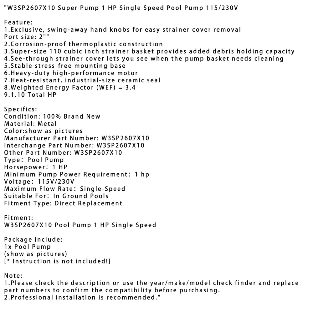Product Description W3SP2607X10 Super Pump 1 HP Single Speed Pool Pump 115/230V Feature: 1.Exclusive, swing-away hand knobs for easy strainer cover removal Port size: 2" 2.Corrosion-proof thermoplastic construction 3.Super-size 110 cubic inch strainer basket provides added debris holding capacity 4.See-through strainer cover lets you see when the pump basket needs cleaning 5.Stable stress-free mounting base 6.Heavy-duty high-performance motor 7.Heat-resistant, industrial-size ceramic seal 8.Weighted Energy Factor (WEF) = 3.4 9.1.10 Total HP Specifics: Condition: 100% Brand New Material: Metal Color:show as pictures Manufacturer Part Number: W3SP2607X10 Interchange Part Number: W3SP2607X10 Other Part Number: W3SP2607X10 Type:Pool Pump Horsepower:1 HP Minimum Pump Power Requirement:1 hp Voltage:115V/230V Maximum Flow Rate:Single-Speed Suitable For:In Ground Pools Fitment Type: Direct Replacement Fitment: W3SP2607X10 Pool Pump 1 HP Single Speed Package Include: 1x Pool Pump (show as pictures) [* Instruction is not included!] Note: 1.Please check the description or use the year/make/model check finder and replace part numbers to confirm the compatibility before purchasing. 2.Professional installation is recommended. Shipping Returns Warranty Feedback About US ✔ Same business day free shipping within United States ✔ Delivery Time: 3-5 business days (continental U.S.). ✔ Order Processing: Ships within 3 business day (Mon-Fri, excludes holidays). ✔ Tracking Info: Provided automatically via eBay. ✔ All orders will be shipped through USPS First Class, UPS and Fedex depends on the weight of the items. ✔ Shipping notification will be emailed to you once package has been shipped Fast & Reliable Shipping – Your order is our priority! We package all items with care to ensure safe arrival! Tracking number emailed as soon as your order ships! 🌍 Ships from U.S. Warehouse – No long waits! 📦 Standard Shipping (Free): 3-5 business days (U.S. only). ULTRA-FAST SHIPPING – Because you shouldn't wait! We guarantee on-time delivery or your shipping fee back! 60-Day Hassle-Free Return Policy We offer 60-day free returns for your peace of mind. To ensure a smooth process, please contact us first before opening a return request—we'll gladly help resolve any issues! ⭐ Return Requirements: ✅ Unused & in original packaging ✅ Contact us immediately if the item is defective/damaged (photos/video required) ✅ Repack securely to prevent shipping damage ⚠️ Important Notes: • If returning due to change of mind, please select: "Changed mind" or "Didn't like item" Defective/damaged items? Contact us immediately with photos/video proof • Incorrect return reasons (e.g., falsely claiming "defective") may result in a refused refun d. ⭐ Return Process: • Contact us → We'll provide return instructions. • Ship the item back with tracking (recommended). • We inspect returns within 3-5 business days. Approved refunds are issued to your original payment method (processing time varies by bank). ⭐ Need Help? Message Us First! We're happy to offer alternative solutions, including replacements or discounts, before you proceed with a return. Your satisfaction is our top priority! No-Questions-Asked Warranty ⭐ HASSLE-FREE WARRANTY • 90-365 Day Coverage (varies by product - see listing details) • No Return Required for claims under $50 - we ship replacements immediately ✖ Exclusions: • Physical damage (drops/accidents) • Installation errors (YouTube tutorial links provided) • Modified/tuned vehicles Professional Installer Warranty ⭐ CERTIFIED INSTALLATION WARRANTY ✔ installed by licensed mechanics ✔ Free Technical Consultation before installation ⭐ Feedback & Satisfaction Policy Your 5-Star Reviews Help Us Grow! We're committed to your complete satisfaction. When you receive your item and are happy : ✅ Please consider leaving positive feedback about your experience ✅ Share what you loved (fast shipping? great packaging? accurate description?) Our Promise to You: ✔ 100% satisfaction guarantee - we stand behind our products ✔ Open, honest, and timely communication ✔ Always respond within 24 hours to any concerns Before Leaving Feedback: ⭐ Contact us first if anything is less than perfect ⭐ Allow us to make it right (replacement/refund/store credit) ⭐ Negative feedback won't solve issues - but we will! Important Notes: • Feedback about shipping carriers should go to their official channels • eBay cases opened without contacting us first void satisfaction guarantees We value your voice - let's work together for a great eBay experience! Our company [Amotopart] begins our business in ebay since 2006. We Mainly sell Bike, Sport goods, Home & Garden products, Computer Accessories, Consumer Electronics, Industrial and more to meet your needs. Our Advantage: [High Quality] - We focus on R&D, cooperating with professional manufacturers, ensuring that we provide our customers with top quality and innovative products. [Great Price] - We try our best to offer you the best price in all markets. [Excellent Customer Service] - We try our best to service our customers all time, professionally and sincerely solve your problem and reply quickly within 24 hours(excluding weekends). [International Warehouse] - We have many warehouses around the world, such as in USA, UK, AU and so on, ensuring the fastest shipping for your orders. We value honest and fair business with our customers. We welcome you to contact us and look forward to working with you! Shipping ✔ Same business day free shipping within United States ✔ Delivery Time: 3-5 business days (continental U.S.). ✔ Order Processing: Ships within 3 business day (Mon-Fri, excludes holidays). ✔ Tracking Info: Provided automatically via eBay. ✔ All orders will be shipped through USPS First Class, UPS and Fedex depends on the weight of the items. ✔ Shipping notification will be emailed to you once package has b