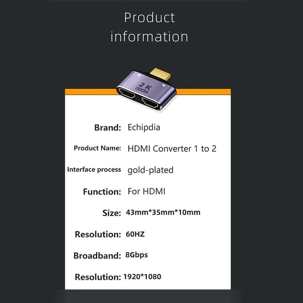 Product View Detail Features: Multiple benefits: The dual monitor adapter is ideal for connecting one HD compatible device to two visual output devices with a wide range of features, receiving signals from one device and directing them to one of the two output devices plugged into it. High quality material: Made of high quality durable aluminum alloy material, it is lightweight, durable and portable. User-friendly: HD dual adapter is easy for anyone to use, equipped with HD HD connector, ready to use after connecting HD cable, plug and play, no driver required. 2K HD resolution: The laptop dual HD adapter with 2K HD resolution allows you to easily enjoy HDTV display with 720p, 1080p and 2K HD picture resolutions. Widespread use: No driver is required and can be used after connecting the HD cable to HD devices with built-in HD ports, such as HDTVs, players, LCD monitors and projectors. Specifications Name: HDMI adapter one minute two Resolution: 2K/1920*1080 Process: gold-plated Function: For HDMI compatible transmission Frequency: 60Hz Size: about 4.3 * 3.5 * 1.0cm / 1.69 * 1.38 * 0.39 inches Weight: 5g Material: metal Package Included 1* HDMI adapter Shipping Policy Payment Method Returns Policy Shipping Policy We only accept your Ebay Address ,Please Make sure it's 100% right. The items you ordered will be shipped out in 1 business day by Hong Kong Air Mail when your payment is clear. The arrival time is 5-20 business days to United States usually. We maintain high standards of excellence and strive for 100% customer satisfaction! Feedback is very important to us. We request that you contact us immediately BEFORE you give us neutralor or negative feedback, so that we can satisfactorily address your concerns. Payment Method Returns Policy Copyright © 2017 DataCaciques 1 Input 2 Output 1080P HDMI Splitter Male to Female Cable Adapter Converter HDTV Home Payment Shipping About us Contact us Store Categories Store Categories Consumer Electronics PC&Tablet Accessories Mobile Phone Accessories Sound&Vision Headphones Watches Camera Led Lights Others Auto Car Accessories Lights Others Motorcycle Motor Accessories Lights Others Headlamp&Torch Others Other Product View Detail Features: Multiple benefits: The dual monitor adapter is ideal for connecting one HD compatible device to two visual output devices with a wide range of features, receiving signals from one device and directing them to one of the two output devices plugged into it. High quality material: Made of high quality durable aluminum alloy material, it is lightweight, durable and portable. User-friendly: HD dual adapter is easy for anyone to use, equipped with HD HD connector, ready to use after connecting HD cable, plug and play, no driver required. 2K HD resolution: The laptop dual HD adapter with 2K HD resolution allows you to easily enjoy HDTV display with 720p, 1080p and 2K HD picture resolutions. Widespread use: No driver is required and can be used after connecting the HD cable to HD devices with built-in HD ports, such as HDTVs, players, LCD monitors and projectors. Specifications Name: HDMI adapter one minute two Resolution: 2K/1920*1080 Process: gold-plated Function: For HDMI compatible transmission Frequency: 60Hz Size: about 4.3 * 3.5 * 1.0cm / 1.69 * 1.38 * 0.39 inches Weight: 5g Material: metal Package Included 1* HDMI adapter Shipping Policy Payment Method Returns Policy Shipping Policy We only accept your Ebay Address ,Please Make sure it's 100% right. The items you ordered will be shipped out in 1 business day by Hong Kong Air Mail when your payment is clear. The arrival time is 5-20 business days to United States usually. We maintain high standards of excellence and strive for 100% customer satisfaction! Feedback is very important to us. We request that you contact us immediately BEFORE you give us neutralor or negative feedback, so that we can satisfactorily address your concerns. Payment Method Returns Policy Home Payment Shipping About us Contact us