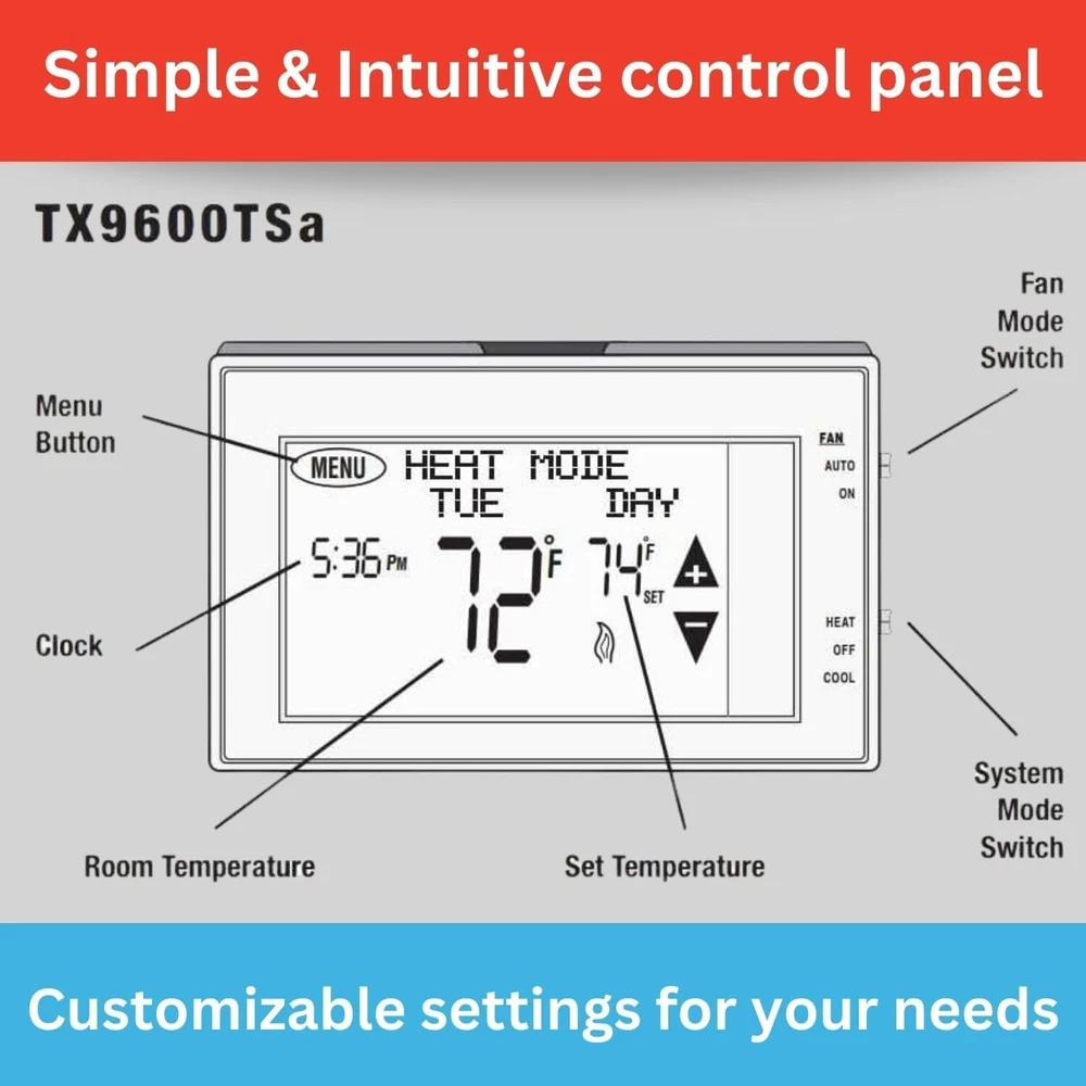 Product Description Lux LTX9600TS 7 Day Digital Programmable Thermostat for Home Use; 2 Heat, 1 Cool Easily adjust your temperature and create weekly schedules with the large touchscreen display, offering intuitive control powered by technology Set energy-saving home & away temps; use hold settings for extended absences, maximizing efficiency & comfort Personalize your week with 7-day menu-driven programming, featuring 4 periods per day for tailored comfort and efficiency Easy to install and use, making temperature control simple and straightforward for anyone Backlit touchscreen display shows current and set point temperatures simultaneously, providing clear visibility day or night About Us We are a reputable seller with many years of experience selling on eBay. Our goal is to provide high-quality products and excellent customer service. Shipping Items will be shipped within 1-3 business days when we received payment. (Orders are not processed on weekends & holidays) Tracking information will be sent once item is shipped. Delivery time depends on destination and other factors Item is shipped to ebay address. Leaving correct address can minimize delay. For international shipping and shipping to Guam, Hawaii and Alaska, Please contact us before placing the order. International buyers please note: Import duties, taxes and charges are not included in the item price or shipping charges. These charges are buyer’s responsibility. We will try our best to reduce the risk of the custom duties. Local pick-up is unavailable at the moment. Contact Us We reply any email messages within 1 business / working days(off-duty at weekend). If you do not get a response from us, then please check your junk or spam mailbox. Our Business hours: Mon-Fri 9:00-18:00, UTC/GMT +8 hours. Please contact us either by clicking "contact seller" in the "purchase history" section or simply click "ask a question" at the bottom of this page. If you are unsatisfied with our item or service, please contact us before leaving any feedback. We are committed to resolve all issues in a friendly and satisfactory manner.