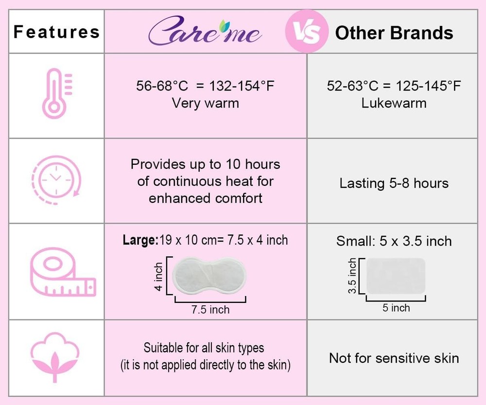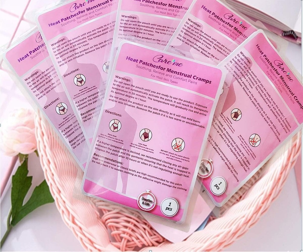 ✅ 【Fast & Effective Pain Relief】– Air-Activated Self- Heating pad features an innovative ultra-heat technology to provide up to 10 hours of continuous heat and warming comfort to relieve the menstrual cramps and associated abdominal pain or backache. Stick on the Clothing. For All Skin Types. This new packaging contains 1 pack of 5 pads. ✅ 【Largest, Warmest Patch for Max Pain Relief】– Long & Wide enough (19 x 10 cm = 7.5 x 4 inch) to cover the uterus fully in the temperature of 131-154°F or 55-68°C for maximum pain relief. The ultraheat deeply penetrates to the inner lower abdomen to help the blood flow and relax the uterine muscles. Great for abdominal cramps or lower back pain. ✅ 【Comfy, Cozy & Safe】- An ultra-thin design conforms to your lower abdomen so that you can hide it under clothes. They are comfortable to wear, self adhesive and stay in place on clothing. 👉 Do NOT ATTACH ON THE SKIN. STICK ON THE CLOTHING instead. Must remain attentive while using and check the application area every 2 hours to prevent burns. ✅ 【Natural Remedy for Menstrual Cramps】– Non-medicated, Air-Activated, Odor-Free heating patch is formulated with iron powder, carbon and ginger. Just open the pouch; the wrap starts to warm on its own then peel & stick it on clothing. Stop taking pills or medication for menstrual pain relief, try the hot patches instead. 👩👧【Make Your life Easier】–These period heating pads are Comfortable, Disposable, Discreet, & Portable. Great for working, travelling or on the go. Don't let menstrual cramps hold you back. Care me Menstrual Patches are Must-Have for Your Special Days of the Month.