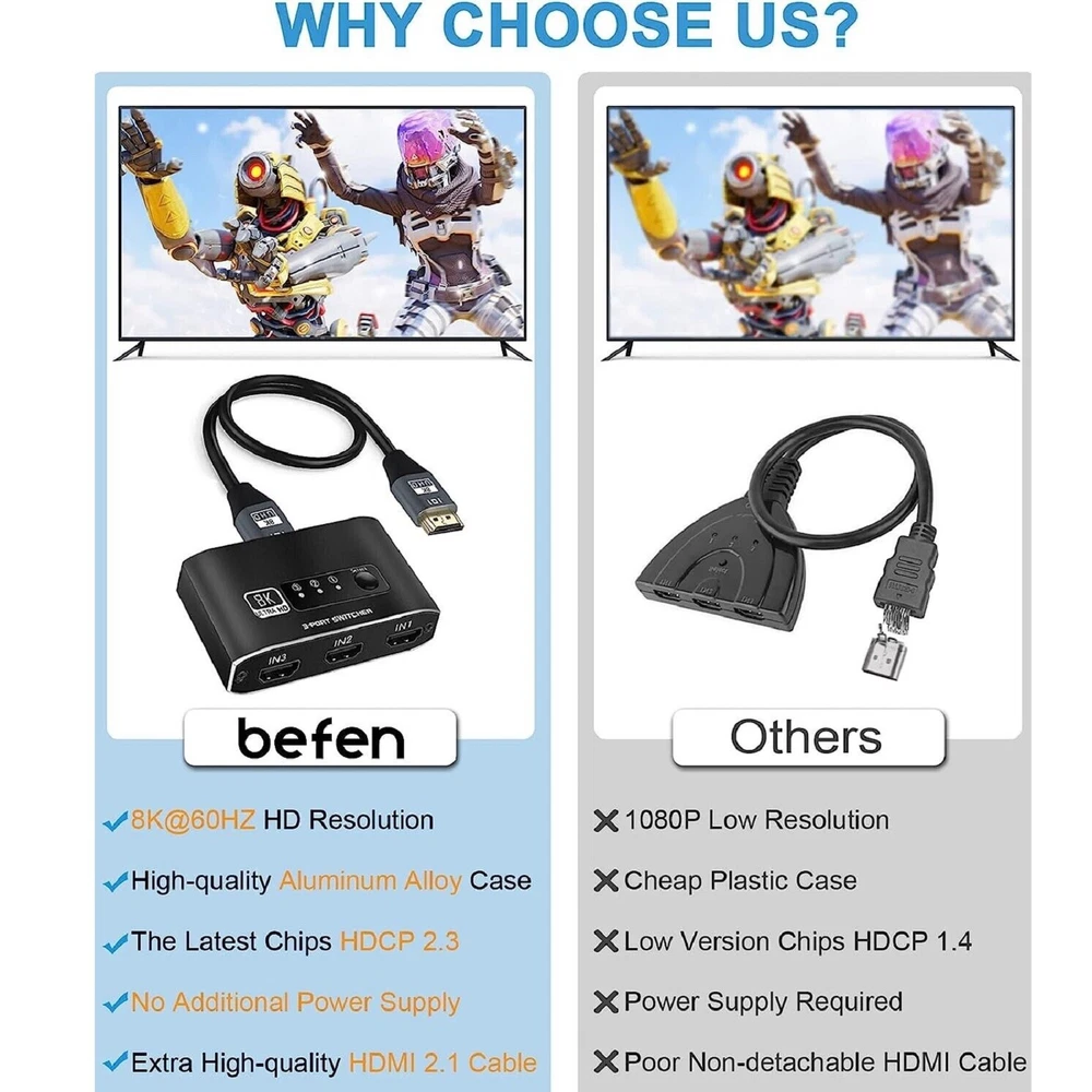 You may also like 60pcs Dial Feet Stickers Watch Movement Repairment Spare Parts Watchmaker Tool g 20.99 USD Free shipping 16Sides Optical Fiber For Fujikura CT06 CT20 CT30 CT05 Fiber Cleaver Blade Cut C 12.99 USD Free shipping A380 Qantas Australian Civil Airliner Aircraft Plane Aviation Model With Stand j 12.99 USD Free shipping HPA1820 Battery Adapter For Black & Decker 20V Li-ion To 18V NiCad & NiMh Tool q 18.99 USD Free shipping 1/24 15cm WWII German Army For BMW R75 1939-1945 Motorcycle Finished Model Toy 28.99 USD Free shipping 4Pcs/Lot Universal Ceiling Fan Light Wall light Replacement Pull Chain Switch 11.39 USD Free shipping Product Description 1 Pcs 3x1 HDMI Switcher With 8K HDMI Cable HDMI Switcher Support HDCP2.3 HDR10 A Specifications: HDMI Version: HDMI2.1, HDCP2.3 HDMI Resolution up to 8K60Hz Supports resolution: 4K@120Hz,1080P@240Hz etc. Support Video Format: 12 bit deep color Support Audio Format: DTS-HD/Dolby Max Bandwidth: 600MHZ Max Baud Rate: 48Gbps Color: Black Features: 1. 8K HDMI 2.1 Switch 3x1: Made of premium Aluminum alloy material,can resist overheat or break.The HDMI switcher 3 in 1 out easily shares video from 3 different HDMI source to 1 HDMI display, Release you from the plugging and unplugging HDMI cables, easily enjoy work time and playtime via switching between 3 devices with one button 2. Crystal Clear 8K Ultra HD: This 3 port HDMI selector support 8K@60Hz, 4K@120Hz, 1080P@240Hz, VRR, HDCP 2.3, HDR10 and Dolby Vision.Brings you smoother, more responsive gameplay experience with a sharper and more realistic picture (Note: For 8K resolution,the length of the HDMI cables connected to both ends of the switch should not exceed 1.5m/5ft respectively) 3. Wide compatibility: HDMI switch 3 ports are compatible with all HDMI 2.1 devices. Input: For PS5, For PS4, For Roku, For Fire TV, For Blu ray, For DVD, For Xbox 360, For Xbox One, For Beamer, Fit For Apple TV laptop. Output: high-definition TV, projector, monitor 4. Plug and Play: No additional power is required, and the 8K HDMI switch box automatically obtains power from the source device through the HDMI port. (Note: Please maintain the power supply of 2-3 input sources.) This HDMI switch has a button switching function, and you can press the button to change the input source you want to use Product List: 1x 3x1 HDMI Switcher 1x 8K HDMI Cable 1x User manual Note: This is HDMI Switch 3 in 1 out , NOT support 1 in 3 out! Shipping Contact Us We ship most of our orders within 24 hours, and may up to 48 hours from US Warehouse. In 2-5 working days, you will receive your items. Sometimes due to problems with our transportation company system, your shipping information may be delayed to update. We recommend that you try again after 3-4 days. If you still haven't checked the shipping information, you can contact us by ebay message. If you have any questions, our Customer Service staffs welcome you to email us. We strive to answer all questions and resolve any problems as quickly as possible. You can contact us 7*24, we will reply at the first time, and we will surely solve your problems. Note: 1.We try our best to reply to your emails as soon as possible, however, due to high volume of daily incoming emails and time zone difference, we may not be able to reply your emails immediately. Please allow 1 business days for us to response. If you do not receive any reply from us, please check your email ensuring your mailbox has not reached full size. 2.Due to some ISP SPAM filter settings, you may not be able to receive our replies; if you have problems receiving our emails, you may need to use a different email account to contact us. 3.Please give us the opportunity to resolve any problem. We understand the concerns and frustrations you might have, and will try our best to resolve the issues. Please email us before leaving any negative feedback or open any dispute on PayPal. 4.We care about our valued customers, and will always try to help you. So if you have any problems, please e-mail us immediately. Shipping We ship most of our orders within 24 hours, and may up to 48 hours from US Warehouse. In 2-5 working days, you will receive your items. Sometimes due to problems with our transportation company system, your shipping information may be delayed to update. We recommend that you try again after 3-4 days. If you still haven't checked the shipping information, you can contact us by ebay message. Contact Us If you have any questions, our Customer Service staffs welcome you to email us. We strive to answer all questions and resolve any problems as quickly as possible. You can contact us 7*24, we will reply at the first time, and we will surely solve your problems. Note: 1.We try our best to reply to your emails as soon as possible, however, due to high volume of daily incoming emails and time zone difference, we may not be able to reply your emails immediately. Please allow 1 business days for us to response. If you do not receive any reply from us, please check your email ensuring your mailbox has not reached full size. 2.Due to some ISP SPAM filter settings, you may not be able to receive our replies; if you have problems receiving our emails, you may need to use a different email account to contact us. 3.Please give us the opportunity to resolve any problem. We understand the concerns and frustrations you might have, and will try our best to resolve the issues. Please email us before leaving any negative feedback or open any dispute on PayPal. 4.We care about our valued customers, and will always try to help you. So if you have any problems, please e-mail us immediately. powered by Metal Screwdriver Hobby Hardware Philip Flat Kit For RC Car Drone Plane Hex F 19.99 USD Free shipping Memory Foam S M L Eartips Buds with Filters For Airpods Pro Headphones Earbuds f 17.99 USD Free shipping Stable Motorcycle Helmet Chin Mount Holder For GoPro Hero 8/7/6/5 Black Camera a 10.99 USD Free shipping DIY Unassemble 1:24 German V1