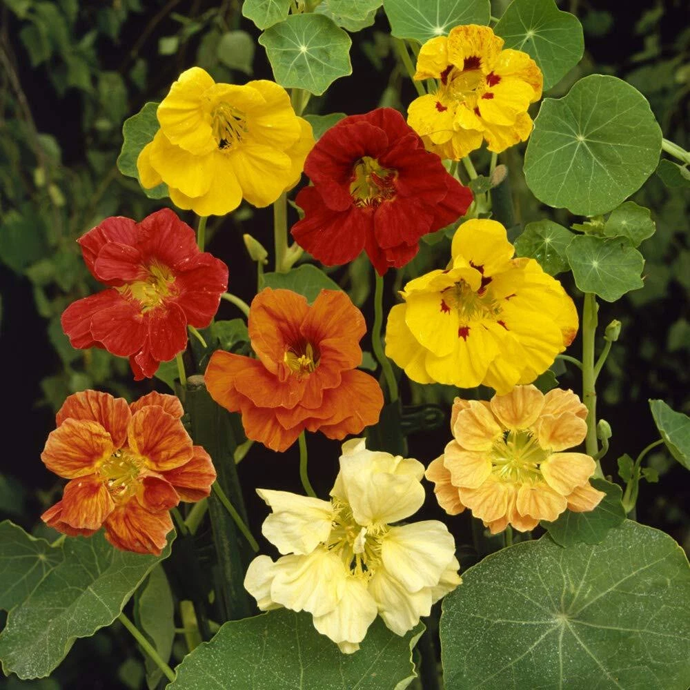 Tropaeolum majus is commonly referred to as Nasturtium. This mix, Jewel Mix, has 2 - 3 inch, blooms that range in color from red to orange to yellow. The grayish green leaves are rounded or kidney-shaped and can be 2 – 5 inches across. It’s a spectacular sight climbing up an arbor or trellis! Nasturtium is not picky; it will climb anything close by even fences, out buildings or tall shrubs! Nasturtium will flower in 8 – 12 weeks after starter the seeds. It will grow quickly and have blooms from summer through fall. Nasturtium seed is large and it has a hard seed coat. It requires a 24 hour soak in water or to file the seed gently to break the coat open. Nasturtium does not always transplant well, so many gardeners start the seed directly outdoors in spring. Prepare a seedbed by loosening and weeding the soil. Keep seed moist until germination. With a temperature of 68F, germination normally occurs within 10 days. Space the plants 8 - 12 inches apart. Grow in full sun and in well-drained soil. Nasturtium is usually resistant to deer. This nasturtium seed mix grows as an annual vining, flowering plant in USDA zones 3 - 10 Nasturtiums, also known as Tropaeolum Majus, bloom profusely all summer long and are considered deer resistant. This seed mix will products 2 to 3 inch wide unique flowers in wonderful shades of red, yellow, and orange. These climbing, vining plants will reach a mature height of 18 inches and spread approximately 12 inches wide. Sow 1 to 2 seeds per plant or 3 to 4 pounds per 1,000 square feet for a dense display of these trailing annual heirloom flowers.
