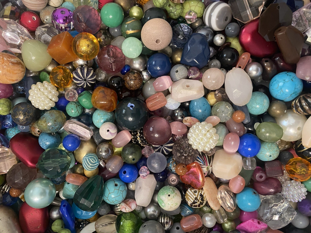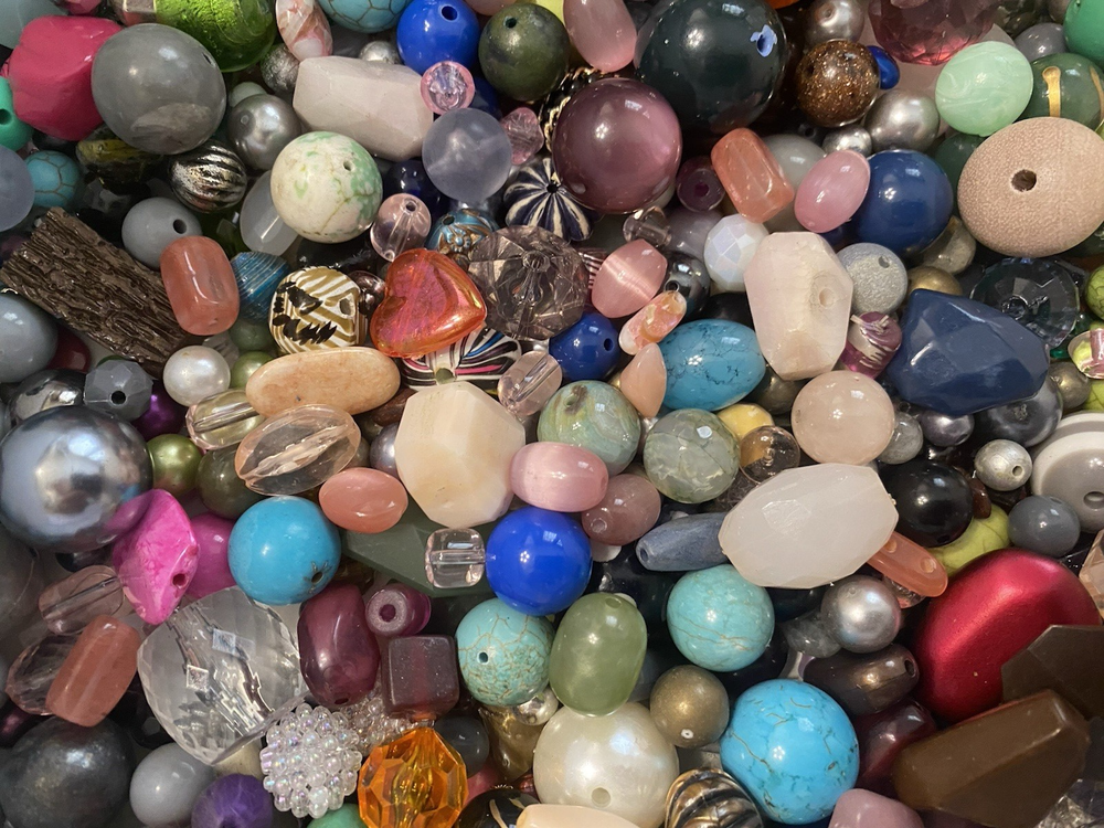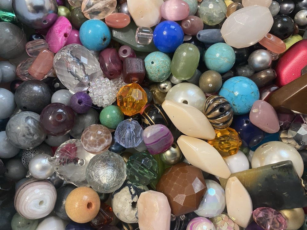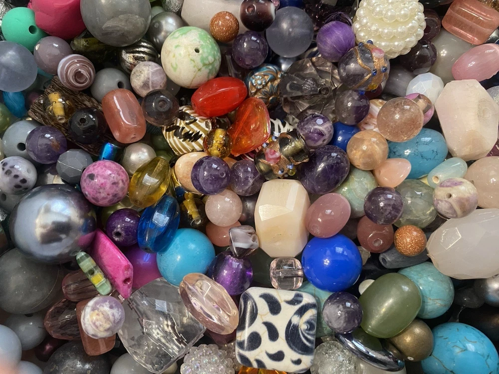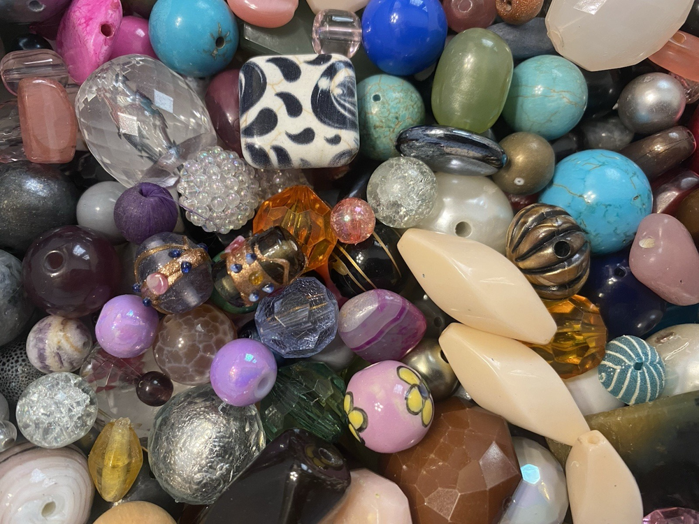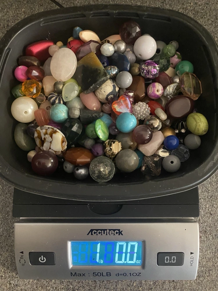 A variety of mixed used and new beads. All in excellent condition. Pictures are stock and will not be the exact beads you receive. Most 1 pound lots fit in a Ziploc sandwich bag. Size range varies from small to large. I'll try to get a good mix of all sizes in each lot. Materials are mostly glass, plastic, metal, wood, ceramic, stone, and more. 16 ounces (1 pound) of beads. About 450 grams Super Fun Lot!