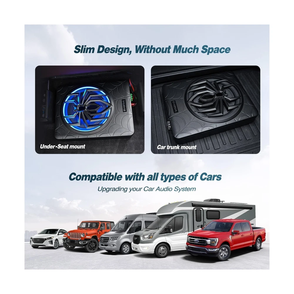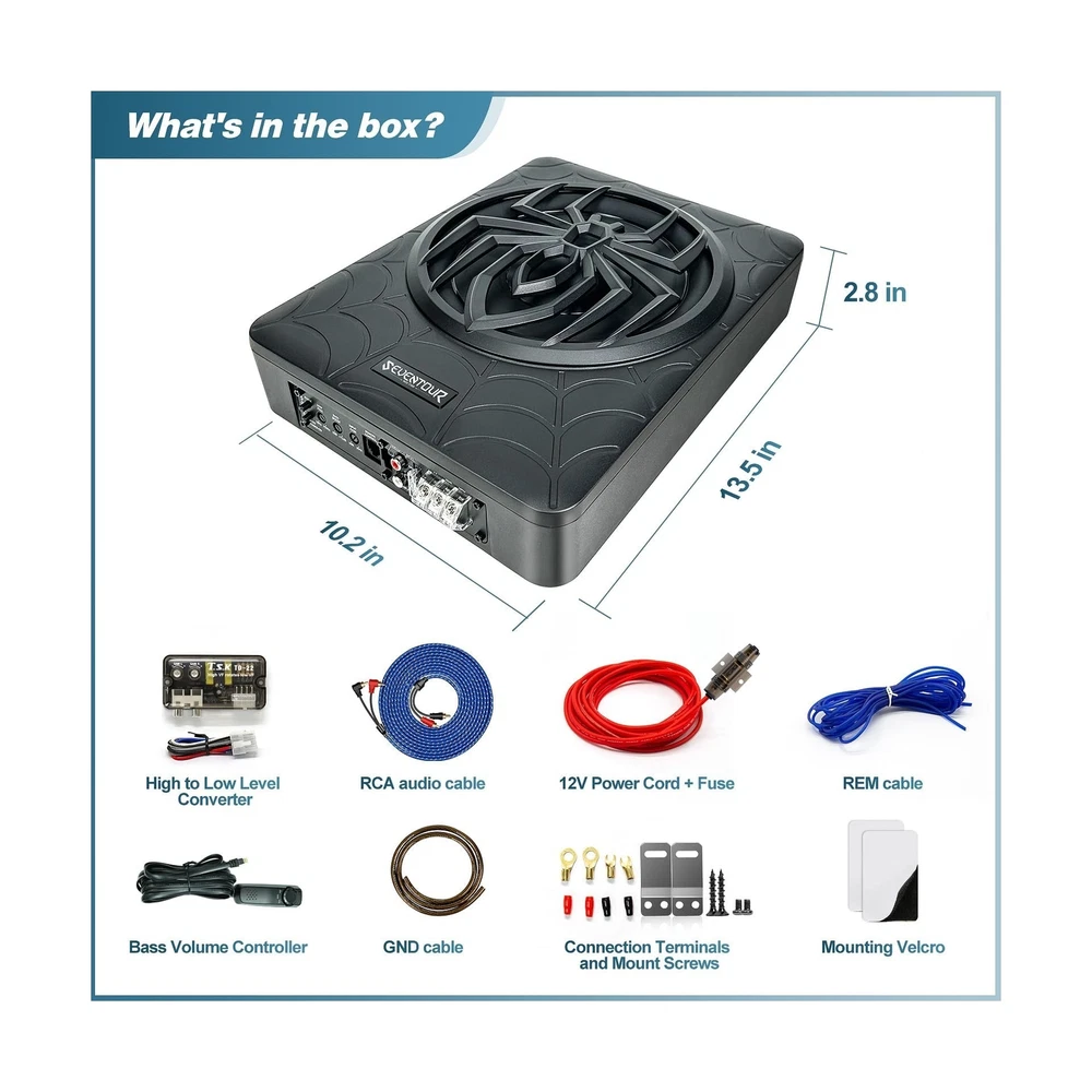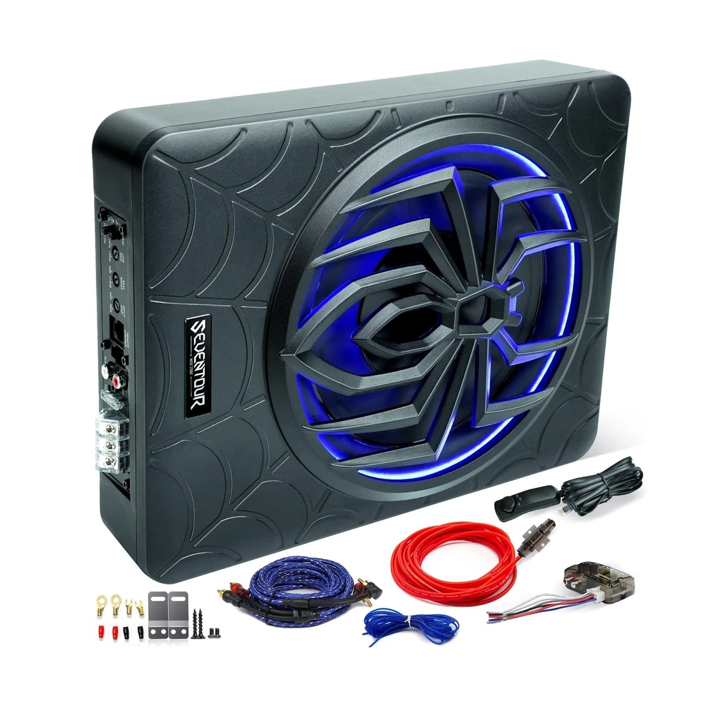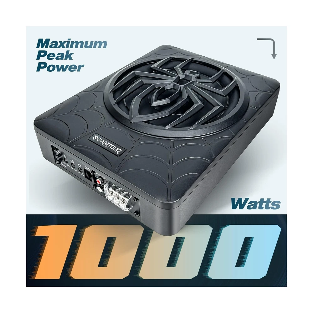 10" 1000W Slim Under Seat Powered Car Subwoofer, Car/Truck Audio Sub Built in Amplifier amp Combo, with Blue LED Light (Subwoofer + Mounting Wire Kit) Description Features: Seventour ST-1000 10 inch Ultra Slim Under Seat Active Powered Car/Truck Subwoofer with Built-In Amplifier, Enclosure made of cast aluminum for excellent heat dissipation and reliable performance. This is a new 2024 upgraded car subwoofer audio that features a personalized spider speaker protector as well as a speaker LED ambient light ring design. When the car is started, the subwoofer lights up with blue LED lights. Make your car look more cool and dynamic. This ST-1000 car subwoofer includes wired bass volume remote control. With gain, bass boost and crossover controls, peak power: 1000 watts, giving you a stunning bass experience. The Car Sub supports low level RCA inputs. It is also compatible with high level inputs, adjustable input sensitivity, thermal protection circuitry, short circuit protection circuitry, overload protection circuitry, green power/red protection LED. Low Pass Filter: 50Hz - 150Hz, Bass Boost: 0 - 12dB @ 45Hz, Built-in Sub-Acoustic Filter Load @ 20Hz, Total Harmonic Distortion (THD): < 0.4%, Rated Fuse: 25A, Peak Power: 1000 Watts, RMS Power Handling: 300 Watts, Impedance: 4 Ohms Frequency Response 20Hz - 500Hz, Signal to Noise Ratio: >90dB , Low Level: 300mV, Input Sensitivity, High Level: 0.9V, Dimensions (inches): 13.5"(L) x 10.2"(W).Thickness: 3.1" Customer Service Support : We promise to replace the product with a new one if there is any product quality issue within 6 months, and repair the product without any charge within 1 year. Seventour provides professional after-sales support, and we will reply to every customer's email within 12 hours. Product Details: Brand: Seventour Speaker Maximum Output Power: 1000 Watts Frequency Response: 500 Hz Connectivity Technology: RCA, Auxiliary, USB Audio Output Mode: Mono Mounting Type: Floor Standing Model Name: ST1000 Speaker Type: Subwoofer Special Feature: Bass Boost, LED Light, Noise Cancelling Recommended Uses For Product: For Surround Sound Systems Unit Count: 1.0 Count Controller Type: Remote Control Included Components: Volume controller, RCA input/output cables, High to Low Level Converter, Power Cables, 10-inch subwoofer main unit Product Dimensions: 2.7"D x 13.5"W x 10.2"H Number of Items: 1 Subwoofer Connectivity Technology: Wired UPC: 717206335361 Manufacturer: Seventour Item Weight: 10.8 pounds Item model number: Subwoofer + Mounting Wire Kit Date First Available: July 11, 2024 Country of Origin: China Shipping Most orders will be shipped within 1 business days once we receive your payment. Except on weekend or public holidays. A shipping notification will be emailed to you once your order has been shipped. International shipping via eBay Global Shipping Program. No shipping to AK, HI, PR, APO/FPO, US Protectorates and PO Box. Payment We Accept Payment Via PayPal and All Major Credit Cards. Return We stand behind our products. Items can be returned for exchange or full refund within 30 days from the date you receive your merchandise. Return shipping is the responsibility of buyer unless the return is a result of our mistake (i.e., your receive the wrong item). We will pay for shipping replacement back to you if an exchange of the same product is requested. Contact us If you have any questions please contact us. We respond within 1 business day or less.