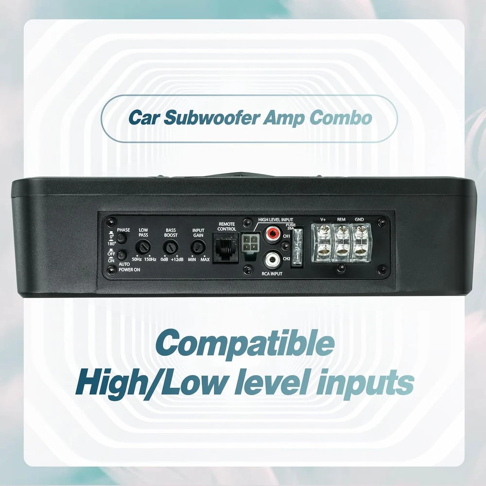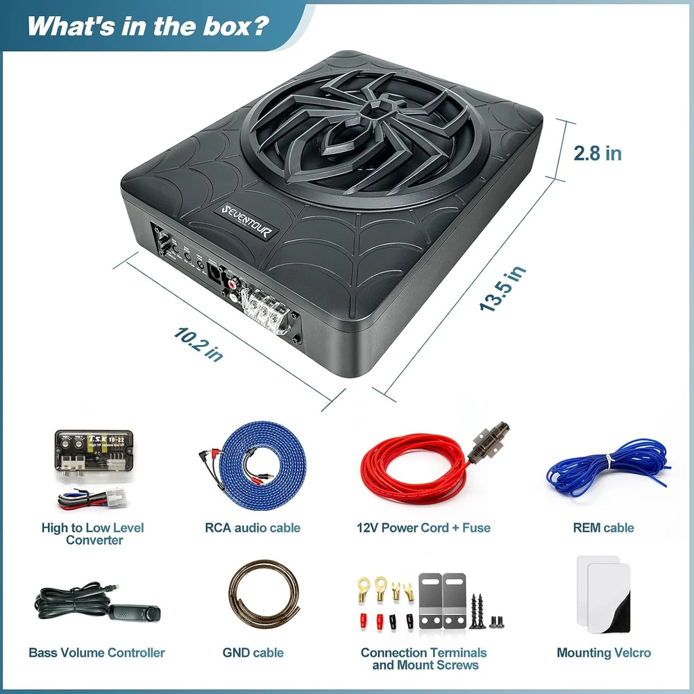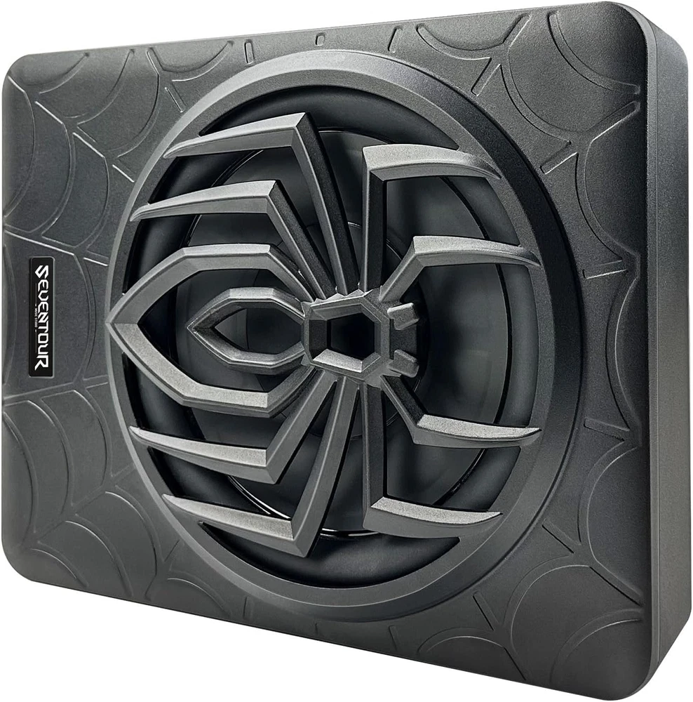 Seventour ST-1000 10 inch Ultra Slim Under Seat Active Powered Car/Truck Subwoofer with Built-In Amplifier, Enclosure made of cast aluminum for excellent heat dissipation and reliable performance. This is a new 2024 upgraded car subwoofer audio that features a personalized spider speaker protector as well as a speaker LED ambient light ring design. When the car is started, the subwoofer lights up with blue LED lights. Make your car look more cool and dynamic. This ST-1000 car subwoofer includes wired bass volume remote control. With gain, bass boost and crossover controls, peak power: 1000 watts, giving you a stunning bass experience. The Car Sub supports low level RCA inputs. It is also compatible with high level inputs, adjustable input sensitivity, thermal protection circuitry, short circuit protection circuitry, overload protection circuitry, green power/red protection LED. Low Pass Filter: 50Hz - 150Hz, Bass Boost: 0 - 12dB @ 45Hz, Built-in Sub-Acoustic Filter Load @ 20Hz, Total Harmonic Distortion (THD): < 0.4%, Rated Fuse: 25A, Peak Power: 1000 Watts, RMS Power Handling: 300 Watts, Impedance: 4 Ohms Frequency Response 20Hz - 500Hz, Signal to Noise Ratio: >90dB , Low Level: 300mV, Input Sensitivity, High Level: 0.9V, Dimensions (inches): 13.5"(L) x 10.2"(W).Thickness: 3.1" Customer Service Support : We promise to replace the product with a new one if there is any product quality issue within 6 months, and repair the product without any charge within 1 year. Seventour provides professional after-sales support, and we will reply to every customer's email within 12 hours. Product Description Seventour 2024 NEW 10-inch 1000w Slim Under-Seat Active Powered Car/Truck Subwoofer Sub ST-1000 ST-1000 Car Subwoofer Main Features: Featuring a personalized spider speaker protector and speaker LED ambient light ring design. Gain, bass boost, and crossover controls. Low Level RCA Input. High Level Inputs. Adjustable Input Sensitivity. Thermal Protection Circuit, Short Protection Circuit. Overload Protection Circuit. Green Power/Red Protect LED. Dynamic LED Ambient Lighting Design A dynamic blue LED ambient halo has been added around the speakers. The LEDs also light up when the car is started. This makes your car subwoofer even cooler and more exciting at night! car subwoofer Amp combo ST-1000 car subwoofer with built in Class-D amplifier, Peak power of 1000W, Rated power of 300W, install it, immediately enhance the car audio system bass effect, so that your journey to enjoy more dynamic music! Supports High + Low Level inputs ST-1000 Car Subwoofer Supports High + Low Level inputs, Compatible with a variety of car stereo audio systems and car head unit equipment. Product Parameters Model ST-1000 Speaker Size 10-inch Peak Power 1000 Watts RMS Power 300 Watts Low Pass Filter 50Hz - 150Hz Bass Boost 0 - 12dB Frequency Response 20Hz - 500Hz Signal to Noise Ratio >90dB THD total harmonic distortion < 0.4% Input sensitivity, Low level 300mV Input sensitivity, High level 0.9V Dimensions (Inches) 13.5" L x 10.2" W x 2.8" H