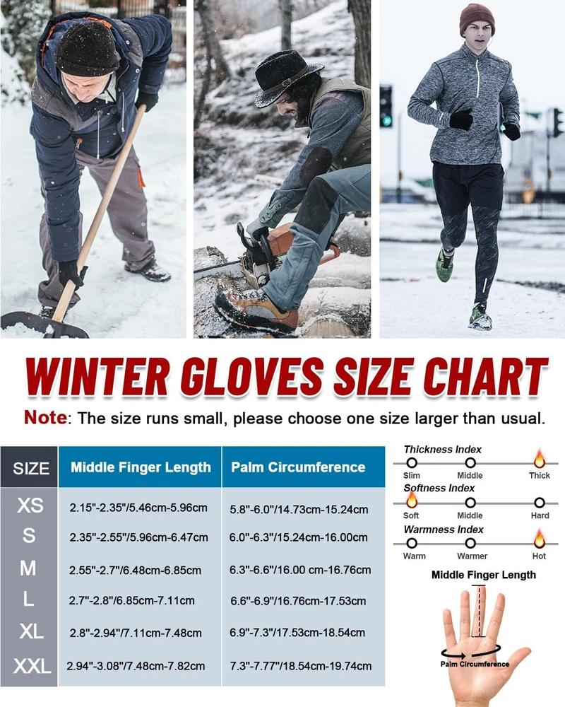 7-layer Thermal Fabric with 3M Thinsulate: 7-layer insulation makes these thinsulate gloves men women the ultimate choice against extreme cold( Above -10℉). Add more 3M materials compared to other gloves for cold weather, significantly enhancing insulation. The insulation performance of 3M is 1.5 times that of down and twice that of other insulation materials. Even in damp conditions, it continues to effectively insulate without causing sensitivities Three-layer Waterproof Design, 100% Waterproof and Windproof: Mens winter gloves waterproof insulated built-in a premium waterproof bag! Palm and back crafted from waterproof leather and high-quality nylon for true wind and waterproof performance. Even when immersed, heated gloves won't leak, ensuring you stay protected from the elements while fishing, cycling in the rain, shoveling snow, or working. No more worries about wind penetration or cold, damp hands Highly Sensitive Leather Gloves with Ten Touchscreen Fingers: Each finger of our winter motorcycle glove is designed with touch-sensitive materials, providing a sensitivity 5 times greater than regular gloves. Never worry about sensitivity fading over time! Additionally, the leather fabric is not only stylish and sophisticated but also boasts outstanding non-slip and wear-resistant features, no need to worry about silicone peeling off like other winter cycling gloves Ultra-comfortable Ergonomic Design: Utilizing advanced pre-curved design to ensure a perfect fit with your hands, providing an outstanding sense of comfort. Unlike other thermal gloves men and women, our gloves lining have undergone careful material selection and multiple modifications to prevent discomfort caused by lining from sliding and protruding seams. Choose our ski gloves to experience both super warmth and a non-bulky feel Super Elastic Wrist + Outstanding After-sales Service: The wrist section is made with an extra-large elastic ribbed material, increasing elasticity by 40% and effectively preventing the invasion of cold winds when paired with the wrist's flexibility. Whatever the issue, please reach out to us first, and we assure you a satisfactory resolution with returns and exchanges