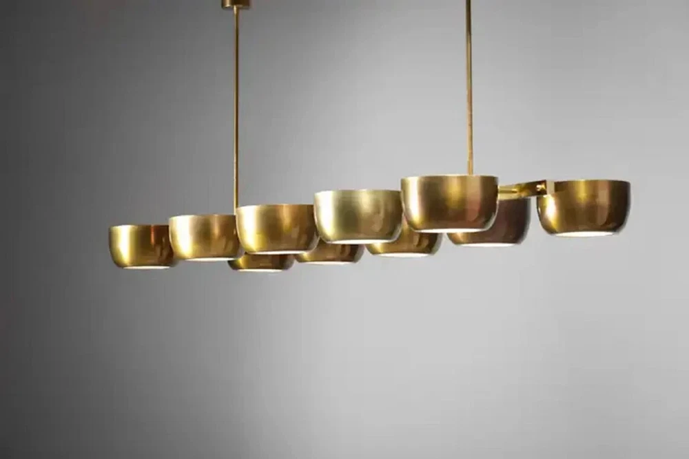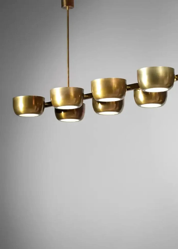 About this item 10 Arms Mid century Italian Modern Chandelier in Solid Brass Scale 10 Cups ceiling Light. Sculptural modern Italian chandelier, handcrafted in the taste of the 60s design. "Ladder" structure with a central bar on which rest 10 solid brass cups with a white Frosted. Recommended LED bulbs type E14. Brass finish and customized sizes available on request. -Made with heavy brass material - 21" Width x 50" depth x 29" total height itself - Total Length : Custom drop lengths are available. - 5 inches mounting canopy. custom canopy available. - Required 4 x E12 120 voltage standard base bulbs. - Required 4 x E14 240 voltage standard base bulbs for European countries. - UL listed material and components. - Bulbs not included with the purchase - Compatible with all medium base bulbs including LED, Edison and CFL.