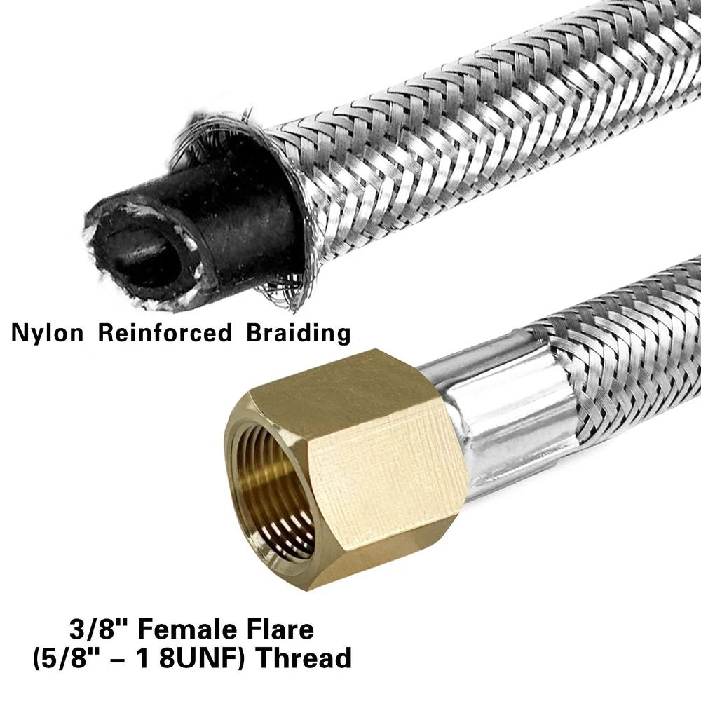350Psi High Pressure Propane Hose Extension: Both ends of the hose are brass 3/8 inch female flare swivel Nut fittings, Conversion connection of an outdoor appliance to your natural or LP gas line for extending, giving more flexibility moving grill .fire pit. gas heater Brass Conversion Coupling : come powerful 5 different brass adapter couplings fitting; 3/8" NPT Male to 3/8" NPT Male,3/8" NPT Male to 3/8" Flare Male, 3/8" Flare Male to 3/8" Flare Male,1/2" Female NPT to 3/8" Flare Male, 1/4" NPT Male to 3/8" Flare Male; 100% brass union connector gas adapter for corrosion resistance, ductility at high temperatures, and low magnetic permeability Compatible & Wide Application: this 3/8" braided propane hose adapter kit hose has female 3/8" ends on both sides, connect an appliance equipped with a 3/8" male flare fitting; suitable for use extending the propane tank line on your fire pits, gas grills, propane heaters, stoves, propane smokers, portable generators, burners,propane generators High Quality: 10 feet stainless steel braided high pressure propane hose extension assembly passed quality and safety certification, Compared with an ordinary high-pressure rubber pipe, its outer layer is protected by stainless steel braiding, Had Durability, extends the longer service life Standard Propane Hose Connector: 3/8” Female flare propane hose with 5 different types of brass adapter fittings; Great conversion assistance, easy installation, convenient storage, and carrying, flexible use of space, relieve all your worries; Perfect for use can be used for travel trailers or RVs. LP propane stoves. heaters.firepit .fireplace