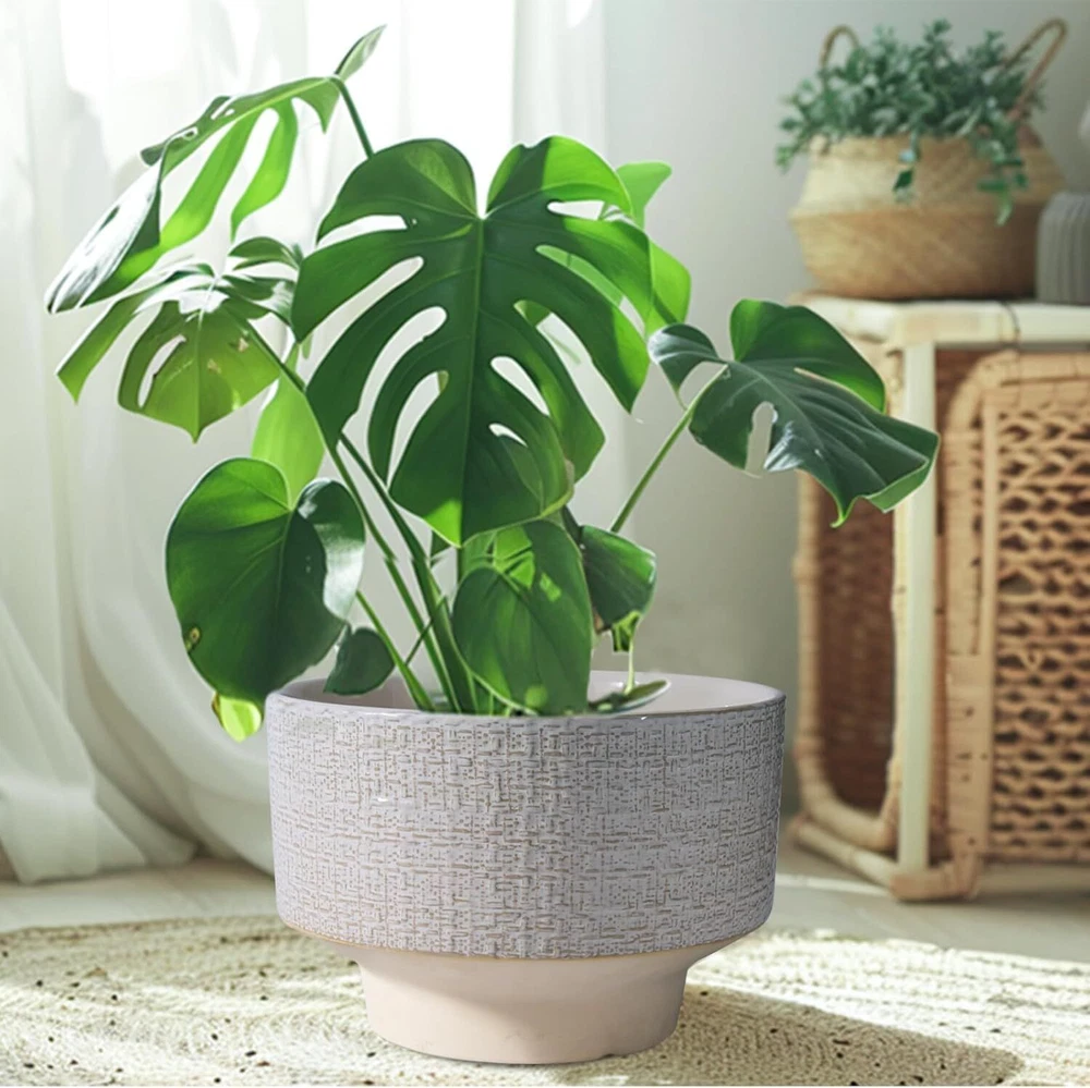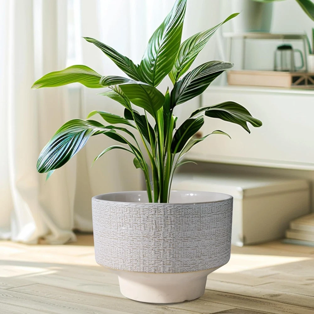 10 Inch Ceramic Planter Pot Round Plant for Indoor Plants 10 Inch, White Product Details Material: Ceramic Color: White Special Feature: Drainage Hole, Weather Resistant Style: Modern Planter Form: Plant Pot 【Decorate Your Home】Our ceramic planter pot is designed with beautiful fabric texture and flowing glaze, blending vintage charm with modern flavor, adding a distinctive visual enjoyment to your garden, bedroom, living room, and office. 【Durable Ceramic Material】The ceramic pots for plants is made of high temperature firing, not easy to break and can be used for a long time. With good air permeability, it helps plant roots breathe and promotes healthy plant growth. 【Plant Pot with Drainage Hole】The drainage hole can effectively remove excess water from the planter pot to prevent root rot. 【Gift for Plant Lover】This planter is suitable for bonsai, monstera, money tree, ficus lyrata, olive tree, palm trees, cactus, aloe, snake plant and other plants, a great holiday gift for plant lovers, family and friends. 【10 Inch Large Planter】10” D x 7.2” H, plant not included. 【After-sales】 If you have any questions after receiving the indoor plant pot or during use, please tell us and we will solve them for you.
