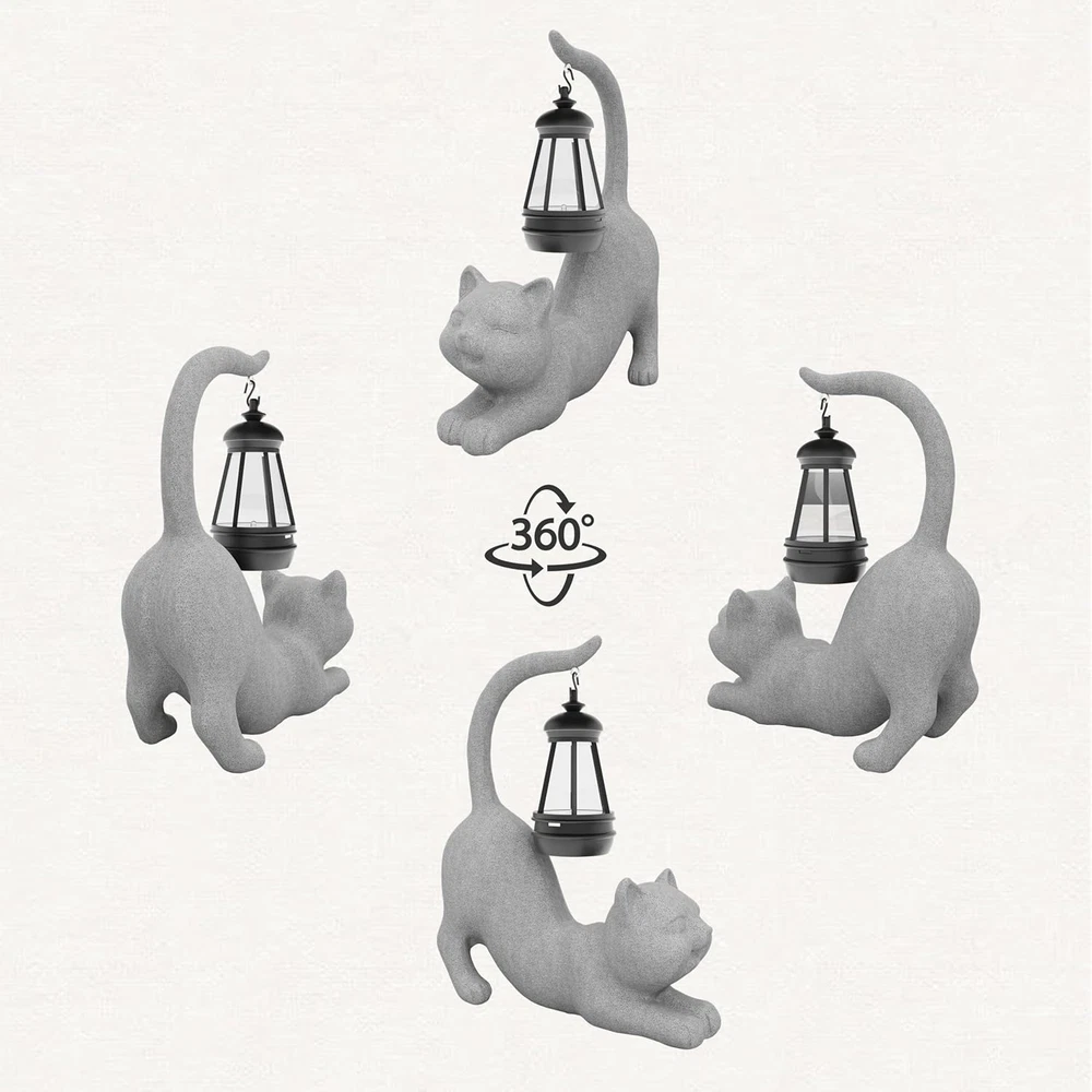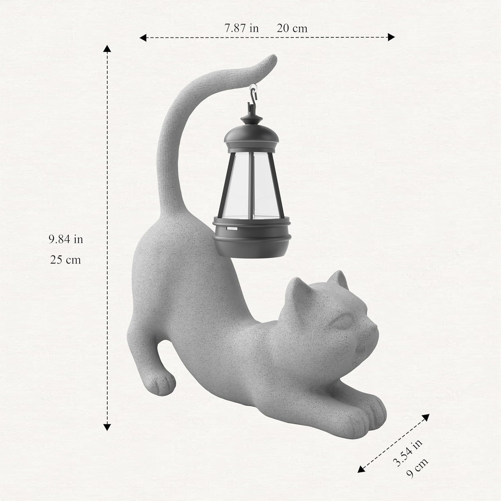 Diverse Modeling: The design is diverse and interesting, with playful and lively postures and expressions; three models (holding a pole/tail-up/lying) are all available in three colors to meet different preferences Durable Material: Be made of high-quality resin to withstand sunny, rainy and other weather conditions without cracking or fading, thus ensuring long-lasting beauty and functionality Addition to the House: A perfect addition to the decor in the garden, outdoors, patio, lawn, yard, front porch, balcony, backyard, walkway, and many inside areas, together with illumination, making your home adorable and charming Ideal Gift: Ideal choice of memorable gifts for many occasions and people - presents for children, friends, father, mother, families, colleagues etc. at birthdays, anniversaries, Christmas, housewarming and so on Portable Size & Easy Operation: 8.1"×3.5"×9.8". For the first use, turn the switch to “ON”, simply leave it charging in the sun (in case the energy runs out after a long period of time out of the sun during transportation), and it will automatically light up at dusk Product Description Solar Garden Statue Lights 10 Inch Outdoor Cat Resin Figurine Lights Crafting Joy - Light up your home and life Outdoor Figurine Light Instructions Open the package, take out the product, and hang the light on the figurine. Set the light switch to “ON” (it must be "ON" when charging) . Leave it in the sun to charge for about 8 hours. When night falls, the light will automatically light up. Long-distance transportation may lead to power depletion, so it is recommended to charge first. The intensity of the sunlight will affect the length of time it takes to be fully charged. Three Styles of Cat Series Cat standing up A standing cat holding a pole with a solar LED light Cat stretching A comfortably stretched cat with a solar light dangling from its own tail Cat lying A lying cat playing with a solar light hanging from its own upturned tail Available colors ● Grey ● White ● Beige Available colors ● White ● Grey ● Beige Available colors ● Beige ● Grey ● White Cats Show There will be one of the three styles appealing to you 1 Style Display 2 Details 3 Weather Resistance 4 Solar Powered 5 Warm Glow Gift-giving SPECIAL GIFT FOR YOUR LOVE With fluid lines, plain & elegant color and diverse designed styles, the lovely and interesting outdoor figurine lights are suitable for many gift-giving occasions, such as birthdays, Mother's Day, Valentine's Day, anniversaries, celebrations and so on. Add a Fun Touch to Your Outdoor Space This outdoor craft decoration is suitable for any place with direct sunlight and will create a fantastic atmosphere to the garden, patio, porch, backyard, lawn or pathway at night, making it a delightful gift for garden enthusiasts.