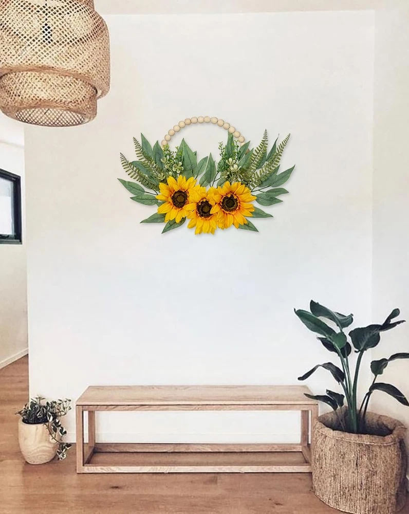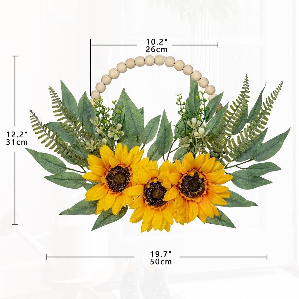 2Pack Floral Wreaths with Wood Bead Flower Wreaths for Front Door Decor These 10" boho wooden bead wreaths suitable for front door porch decor, indoor or outdoor decoration, baby shower.Natural color always adding fresh and natural atmosphere to your home. They can be easy to hang for wedding, party, stages, fireplace, office, dining rooms, celebration, etc Product Specification Style: Rose Hydrangea/Peony Hydrangea/Sunflower Quality: 2pcs Wood Bead Wreath Size: 10.0" Total Size: 19.7" Meterial: High-quality silk/Wood/Wire/Plastic Color: Yellow/White/Pink/Orange Why Choose Us ✔Premium Material ✔Exquisite Craftsmanship ✔Versatile Decor ✔Low Maintenance ✔Long-lasting Floral Door Wreaths: You will receive two artificial floral greenary wreaths. The flower wreaths will be the unique wall/window decor ornaments for farmhouse/living room/bedroom/nursery. Natural color always adding fresh and natural atmosphere to your home Unique Design: Consists of three sunflowers and some eucalyptus leaves and fern leaves as accents. Delightful and vibrant color, vivid natural form, giving artistic romantic feelings. The exquisite and unique design is perfect for modern farmhouse decoration style Premium Material: These wreaths are made of wooden beads into a circle and trimmed with silk flowers and polyethylene green leaves to make the decoration look more lifelike and elegant. Note: The flower might bend a bit due to shipping and packing, please adjust it if needed Lovely Size: Wooden bead wreath diameter: 10.2". Wreath after adjustment measures approximately: 19.7"W x 12.2"L. Please allow differences due to manual measurement. Easy to hang for wedding, party, stages, fireplace, office, dining rooms, celebration, etc Widely Used: These boho wooden bead wreaths suitable for front door porch decor, indoor or outdoor decoration, baby shower. If you have any questions about the product, please feel free to contact us, we will reply within 24 hours
