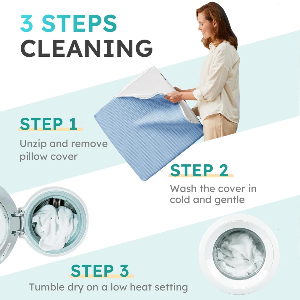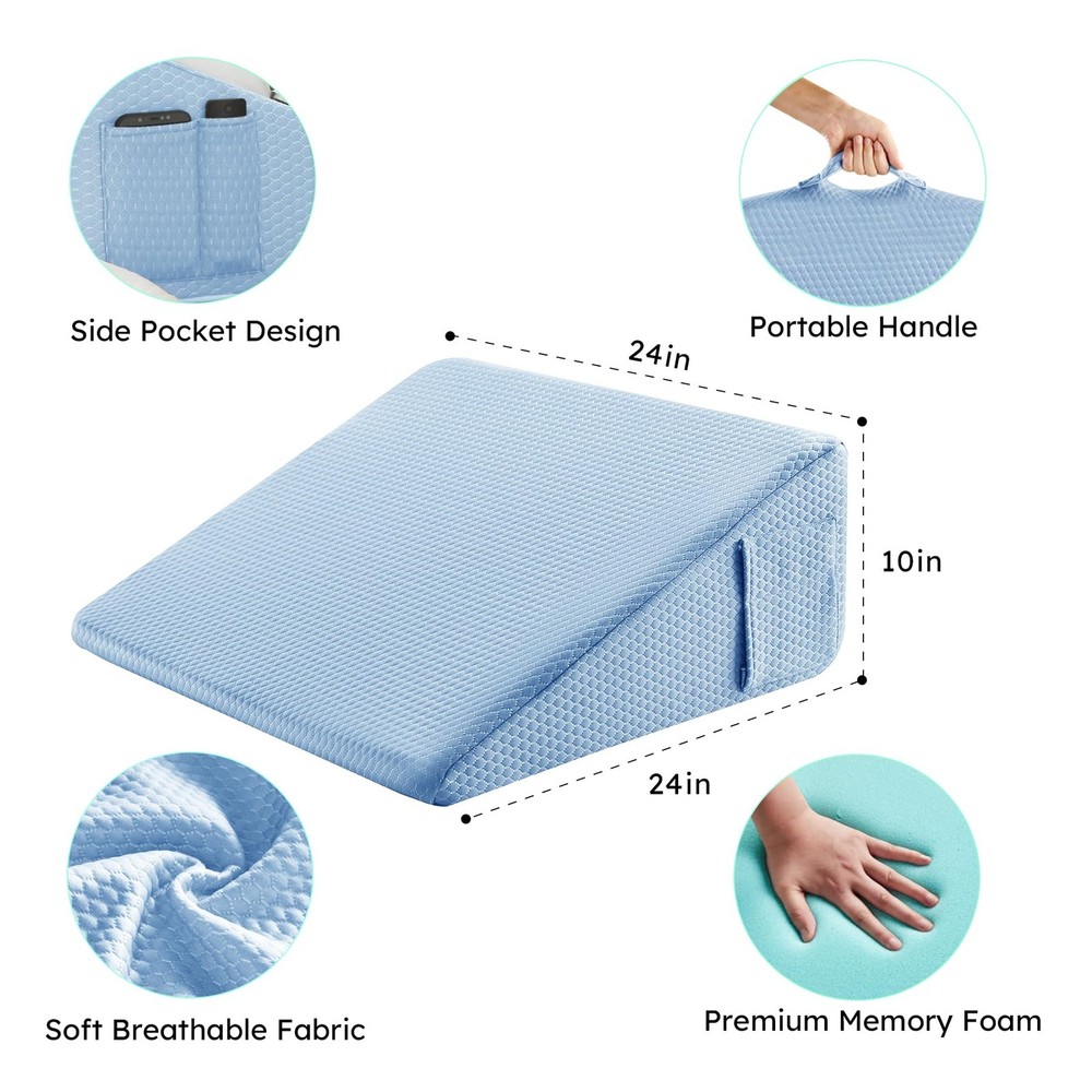 Wedge Pillow for Sleeping, Bed Wedge Pillow, Body Pillow for Back Support, Leg Elevation, Gerd Acid Reflux, Neck Pain, Snoring, Triangle Pillow Wedge - Cooling Memory Foam Top, Removable Washable Cover Versatile wedge pillow design provides superior comfort and support for sleeping, reading, sitting up in bed Features cooling gel-infused memory foam top layer and high-density premium foam base for comfort and support Breathable, removable and machine washable cover allows airflow and easy cleaning Built-in pockets to store items; Portable handle for easy transport. Upgraded foam meets CertiPUR-US and Oeko-Tex standards for durability and safety