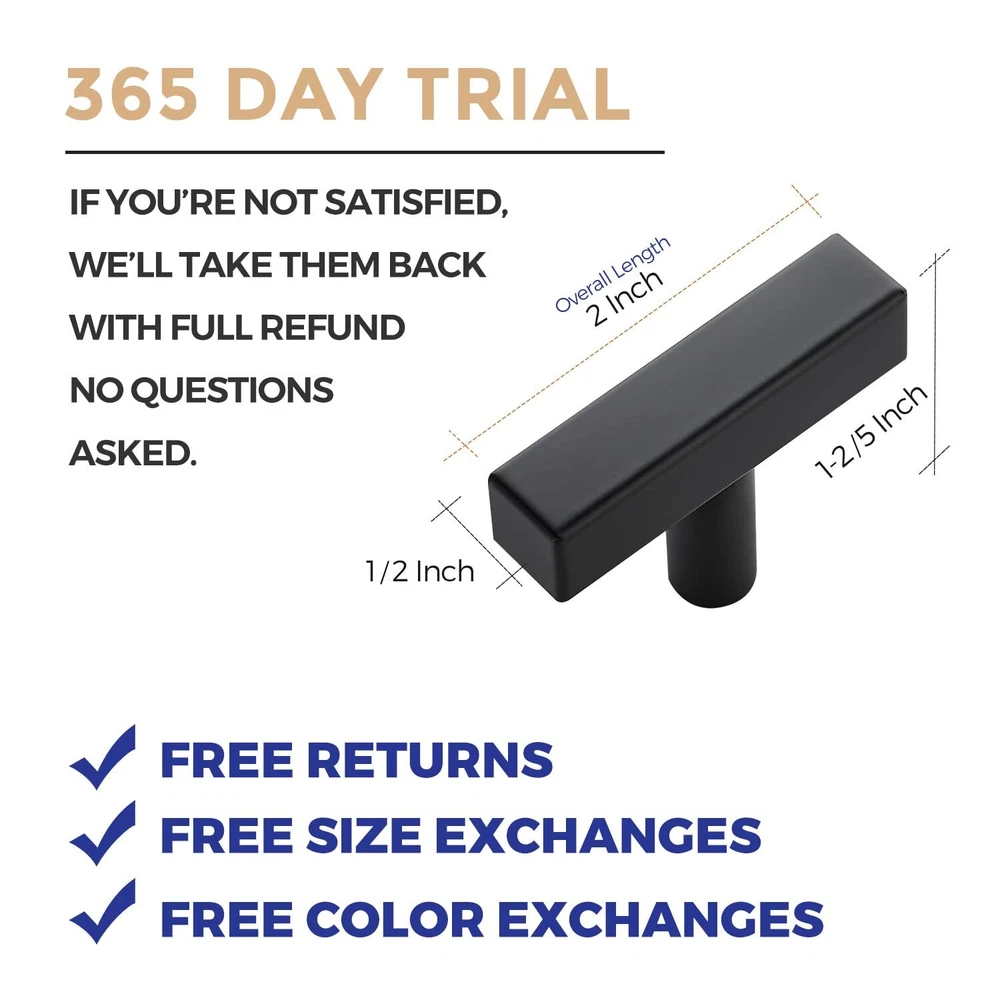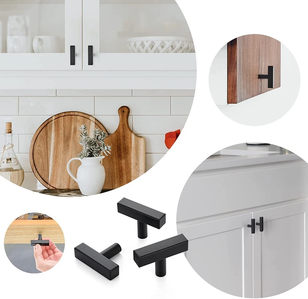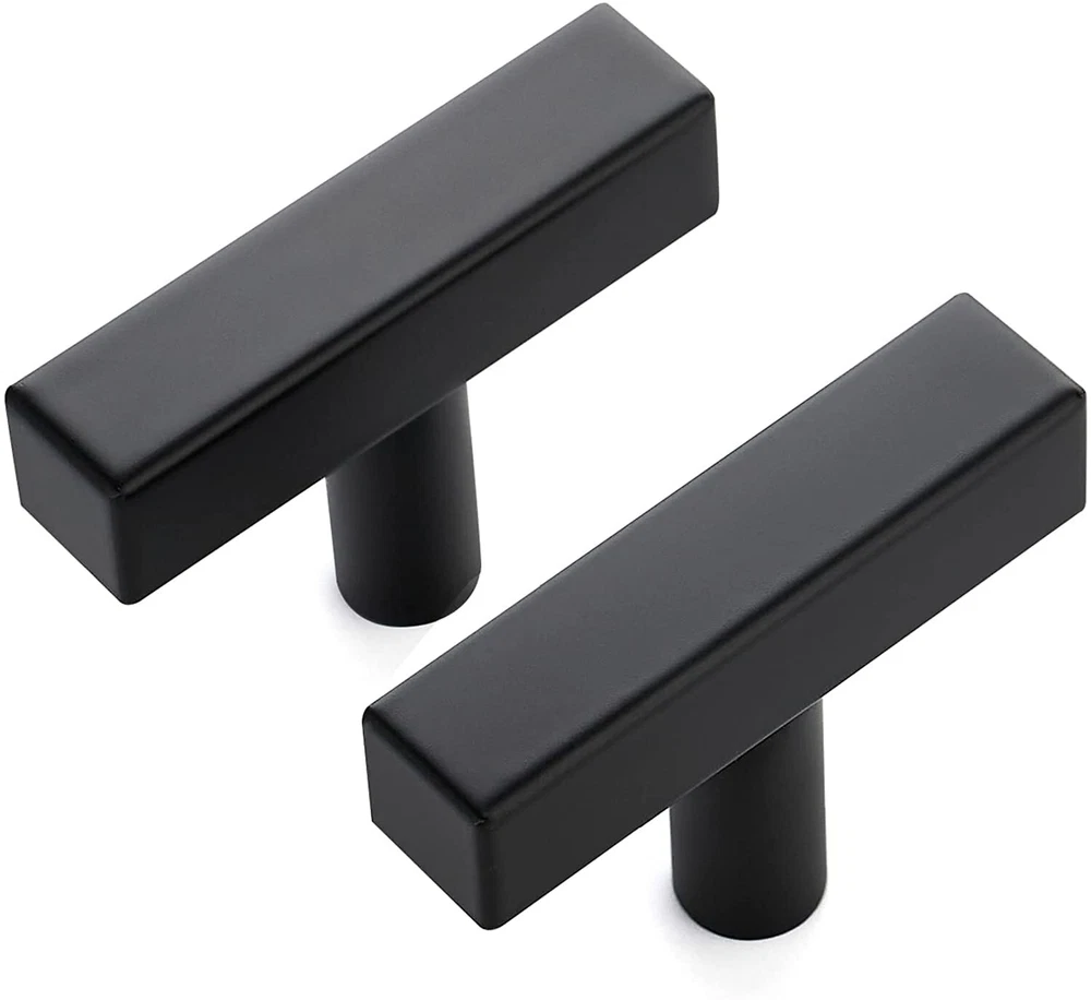 STURDY MATERIAL: Our matte black T bar pulls knobs are made of premium stainless steel which will not chip or wear off. By using cabinet hardware, you will find it will stand up to the daily wear and tear, lasting for years to come MODERN DESIGH: Add a single knob or pull for a more streamlined look. These single hole cabinet pulls are ideal for a more updated, contemporary feel-simple lines pair beautifully with modern cabinets EASY TO INSTALL: Drill a hole at the position you want and then tight to the knob. Also, our drawer knobs come with 2 different sets of screws of different lengths (set has notches to easily cut to different lengths) MEASUREMENT: Total Length: 2 inch(50mm); Diameter: 1/2 inch(12mm); Height: 1-2/5 inch(35mm) Top-notch Customer Care: If you have any inquiries about our black pulls before or after your purchase, feel at ease to reach out to us. We will address your concerns within 24 hours