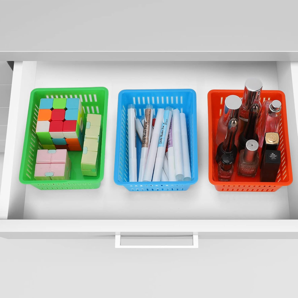 Optimal solution: Organize your space more efficiently by storing your favorite items in the practical storage baskets. Resilient, and helpful, the home school and office organizers are a must-have for any modern places. Made to last: Our small baskets are made of ultimate quality ABS plastic, a material that will resist intensive use over time. The storage baskets for shelves are small, portable, and ideal for an efficient, neat, and time-winning organizing experience. Practical and versatile: The organizing bins are perfect for organizing your essential daily items like make-up, stationery, food, or medicine. The water-resistant plastic material will ensure that your items will be ideally stored without creating a mess on your desk, shelf or closet. Compact and space-saving: One of the best parts about our organizing baskets is that they perfectly fit any narrow space. Ideal for any bathroom, office, bedroom, classroom, cabinet, drawer. Convenient set: Order the office organizer for yourself or as a thoughtful housewarming present for a friend or loved one, and you can be sure they will be appreciated! Our set includes 10 beautifully colored small storage baskets, ideal for your efficient storage needs! Product Description Say goodbye to clutter and chaos with our foldable storage baskets—the ultimate choice for your home organization needs. Designed to bring order and simplicity to your space, these compact yet durable baskets make organizing effortless and efficient. Whether it's your kitchen, bathroom, office, or bedroom, these versatile baskets help you maximize every corner while keeping your essentials neatly stored. Their foldable design ensures they’re easy to store when not in use, making them perfect for any modern home. Choose practicality, style, and a clutter-free lifestyle today! Our versatile storage baskets are designed to adapt to any space and meet your organizing needs across various settings. Use them in the kitchen for spices and snacks, in the bathroom for toiletries, or in the office for stationery. They’re perfect for keeping closets, drawers, and shelves neat and tidy, and they work great in classrooms for organizing supplies. Whether it’s storing toys in the kids’ room or keeping essentials handy in your car, these baskets provide a practical, stylish solution for every scenario. Simplify your life with storage that fits anywhere! Our foldable storage basket is the perfect space-saving solution for any home. When not in use, it folds flat, making it easy to store without taking up valuable space. Despite its compact design, it provides ample room for organizing your essentials. Measuring 5.9 x 3.8 x 2.2 inches, it’s ideal for fitting into tight spaces like drawers, shelves, or cabinets. Whether you need a quick storage option or something that stows away effortlessly, this basket offers convenience without compromise. Be sure to check the dimensions to ensure it’s the right fit for your needs! Add a pop of color and functionality to your organization with our multi-colored storage basket set! This 2-pack includes vibrant, beautifully coordinated colors that not only brighten your space but also make it easier to categorize and identify your stored items. Perfect for matching your home décor or creating a playful, organized look in any room, these baskets are as stylish as they are practical. Whether used in the kitchen, bathroom, office, or classroom, their cheerful design brings a fresh touch to your storage solutions. Organize with style and ease today! Our storage baskets are designed with thoughtful features to enhance both convenience and durability. The clasp design ensures the baskets stay securely closed when in use, preventing your items from spilling out. The side handles make them easy to carry and transport, whether you're moving them from room to room or taking them off the shelf. Additionally, the thickened bottom provides extra strength and stability, allowing the baskets to hold heavier items without losing their shape. These carefully crafted details make our baskets the perfect blend of practicality and reliability for your home organization.