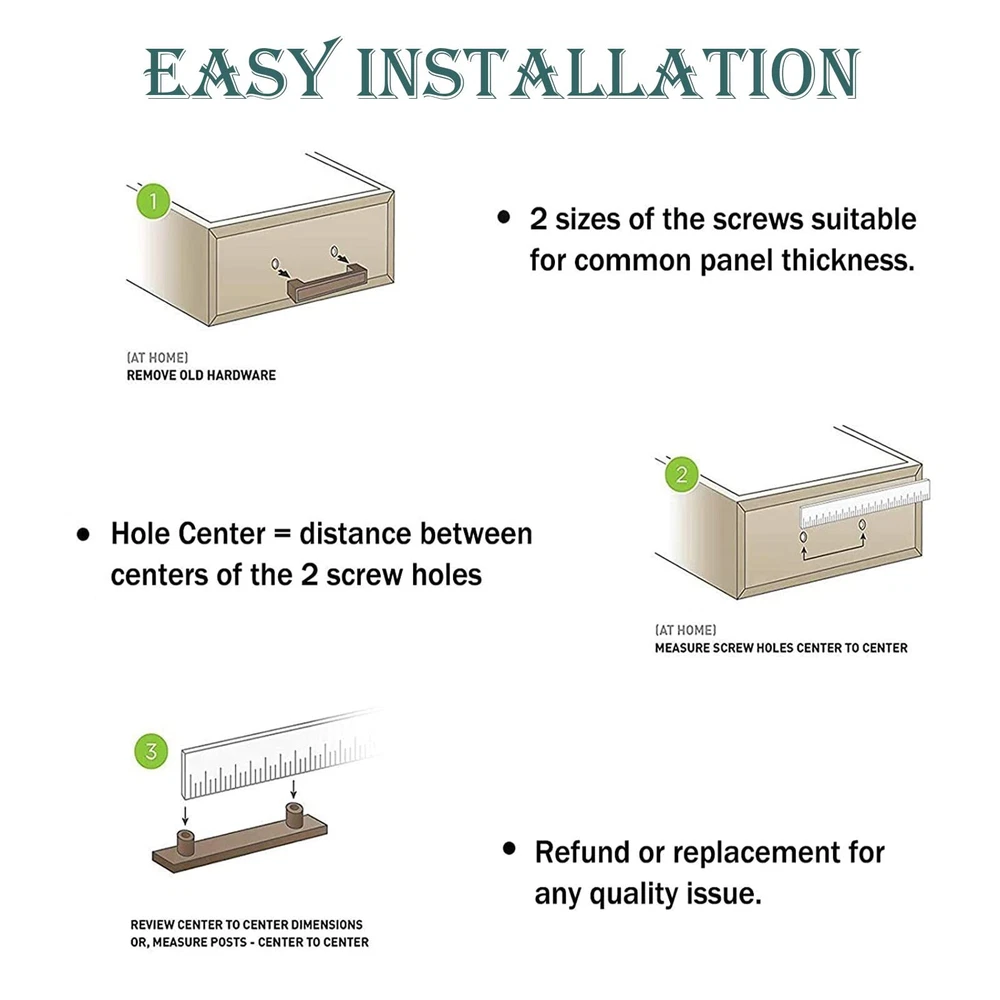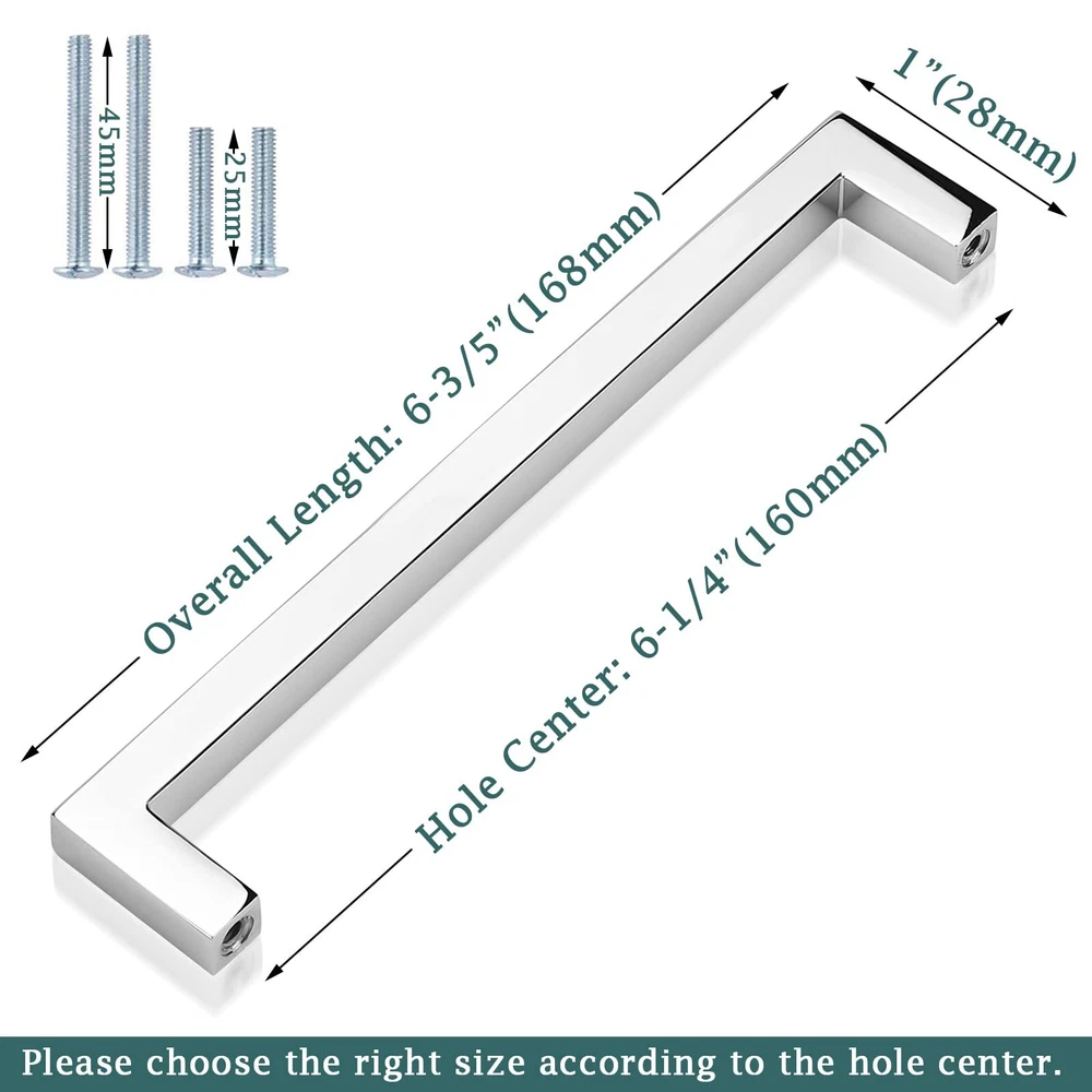 High Quality Polished Chrome Kitchen Cabinet Handles Hardware The cabinet pull is ideal for different styles of cabinets, dressers, drawers, cupboard and other furniture decorated. Apply to the kitchen, bedroom, bathroom, office and other rooms. It can make your home and furniture more elegant and modern. Product Info: * Finished: Polished Chrome * Material: Solid Zinc Alloy * Type: Square Bar Cabinet Handles * Hole Center: 6-1/4"(160mm) * Overall Length: 6-3/5"(168mm) * Height: 1"(28mm) * Width: 0.35"(9mm) Package Included: - Cabinet Pulls - Mounting Screws(M4*25mm & M4*45mm) Product Features: ·Smooth surface makes you feel comfortable to grip. ·Polished chrome finish looks charming, elegant and fashionable. ·Solid construction of superior material, sturdy and durable. ·Mutiple sizes of cabinet handles can meet your need (4 sizes in total). ·Each pull comes individually wrapped and bagged to avoid the scratch. ·Easy and quick installation, just one-person project. ·or replacement for any quality problem. Product Dimensions - Overall Length: 6-3/5inch(168mm); Hole Center: 6-1/4inch(160mm); Height: 1inch(28mm); Width: 9mm. Please choose the right size according to the hole center. Premium quality & Beautiful finish - The material of the cabinet handle is high quality solid zinc alloy, sturdy and durable. Gorgeous polished chrome finish can make your furniture and rooms more elegant and modern. Widely Use - The contemporary cabinet pull is suitable for different styles of furniture and rooms. It creates an excllent upgrade to your cabinets, drawers, cupboard, wardrobe, etc. Carefully Packaged - Each pull is individually wrapped and bagged to avoid the scratch and protect the beautiful finish. Three sizes of screws for each handle(8-32*25mm & 8-32*35mm & 8-32*40mm). Reliable Service - We will answer your questions about our products patiently. If you are not satisfied with the quality of the item, please message us. or REPLACEMENT for any quality problem.