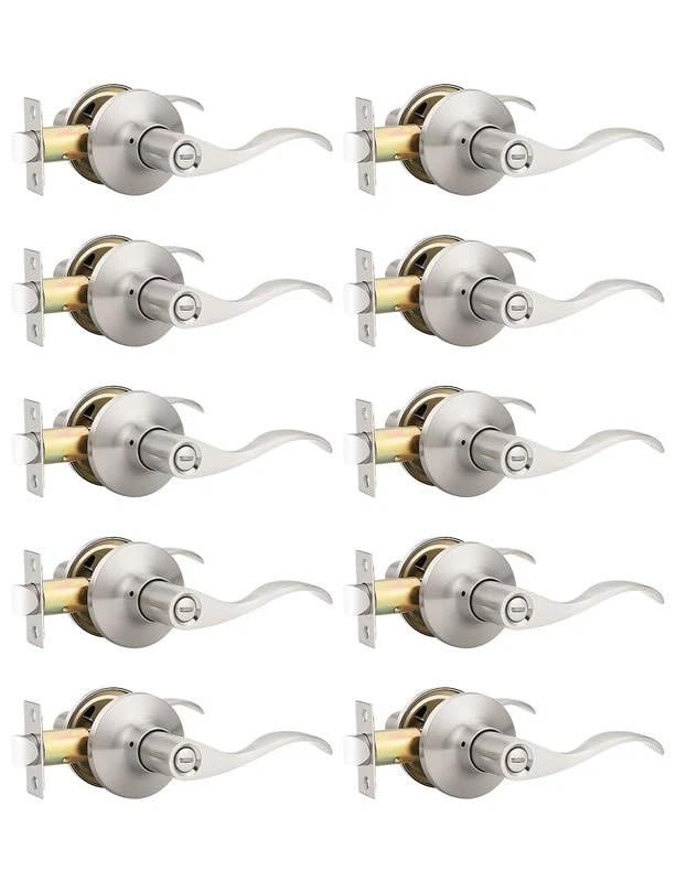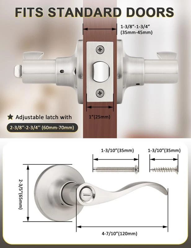 ◆PRIVACY FUNCTION◆: Door Handle Included latch and without keys. Privacy door lever suit for interior door, mostly for bedroom/bathroom; where security is needed. Emergency released by coin from exterior, the latch bolt can be locked by thumb turn button from interior. ◆DETAILED SIZE◆: Reversible contemporary Handle. Adjustable Backset: 2-3/8" or 2-3/4" (60mm or 70mm); fit for door thickness: 1-3/8" or 1-3/4" (35-45mm); Rosette Diameter: 2-3/5"(65mm); Lever Length: 4-7/10"(120mm). You can easily change direction by tool inside the box. ◆DURABLE QUALITY◆: Confirm with ANSI Grade 3, Cost-effective, Low profile, Modern Style. They're designed, crafted, tested, packed to ensure durability and Security. We maintain good balance in style, cost and quality. Perfect addition for interior door or anywhere security is needed. ◆EASY INSTALLATION◆: All the mounting accessories are included for installation, with Installation instructions in the box. Nice industrial design make it easy to operate, it can totally be a one-person project; suit for home DIY, All you need is screwdriver, tape measure, goggles. ◆SATISFIED SERVICE ◆: Contact us if there is any question, refund or resend as you wish. We are willing to improving our products and listening to our customers' voices. Also is a professional home hardware manufacturer for over 10 years, We are committed to improving our products.