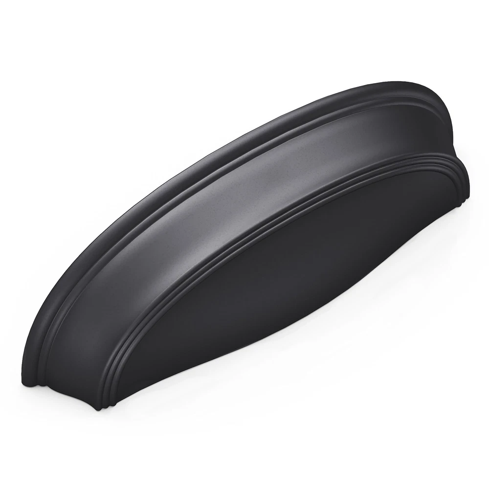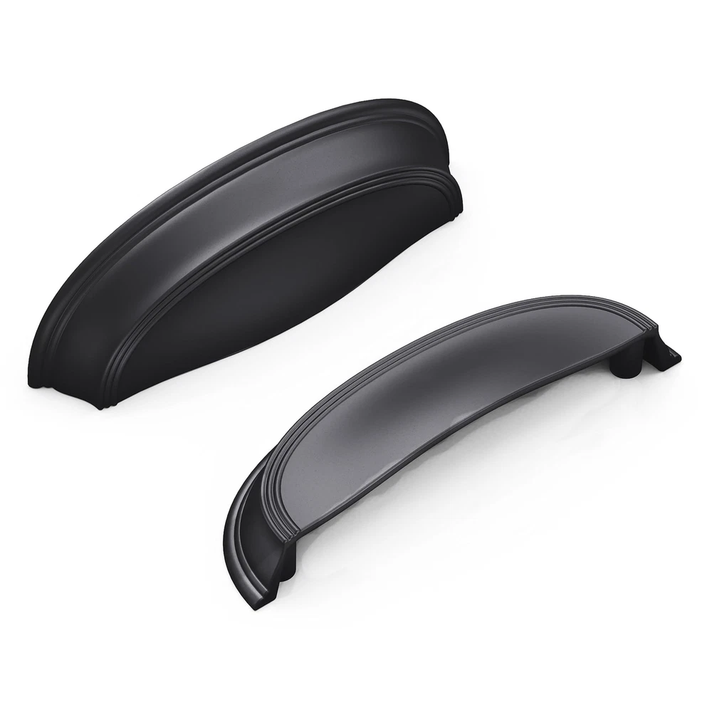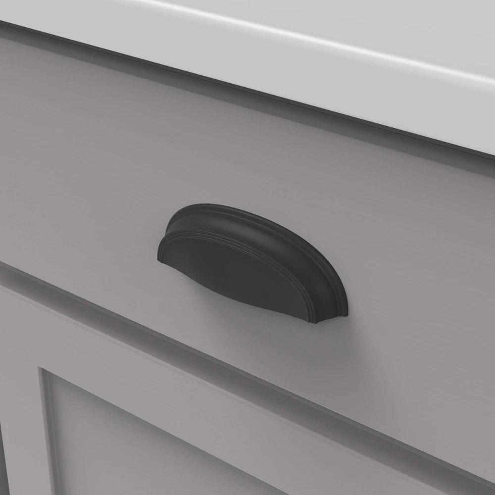 The graceful arc of the American Diner pulls is combined with details reminiscent of 50's diner tables and stools to create a classic look that pairs well with most spaces. Shiny silver tones highlight the inspiration and darker tones showcase the elegant and timeless forms. , well-known for our decorative hardware designs and a company that's been around for more than 120 years, has been Setting the Trends Since 1893. As a division of Belwith Products, we're an industry-leading brand in decorative and functional products. Style, quality, and details are important to us at Hickory. We have in-house designers, master craftsmen, and engineers integrating both design and technology to craft complete home solutions. 3 Inch Center to Center; Projection: 1 Inch; Length: 4-5/8 Inch; Width: 1-1/2 Inch The Matte Black finish coordinates with most black interior elements. The true black color is sealed with a low sheen lacquer. The graceful arc of the American Diner pulls is combined with details reminiscent of a 50's diner to create a classic look that pairs well with most spaces. Shiny silver tones highlight the inspiration and darker tones showcase the elegant and timeless forms. The gentle arc of the pulls gives the collection a soft elegance. Darker finishes make this collection a great option for the "Modern Farmhouse" look.