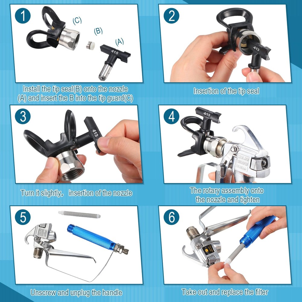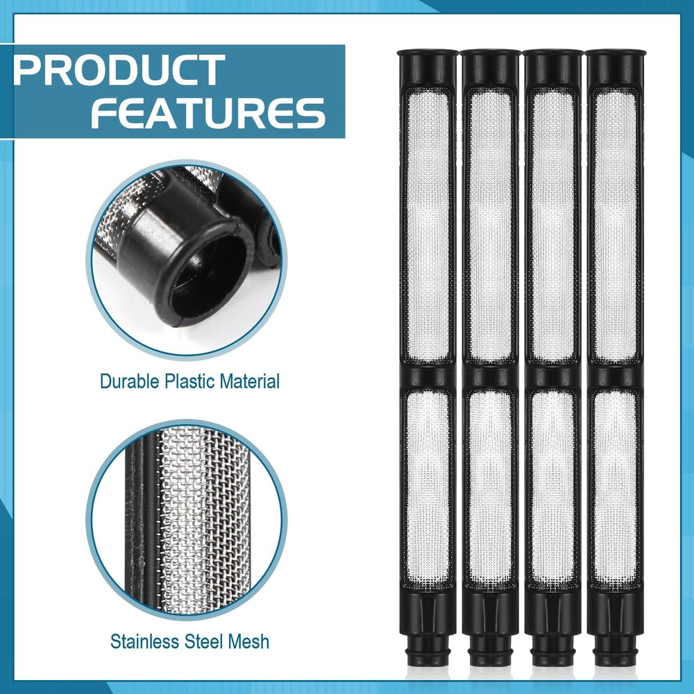 Features: Reversible nozzle: The airless paint sprayer tips fit easily on most spray devices without tools. You can press it in a reversible position to avoid clogging. Multi sizes: Reliable and easy to operate, these paint sprayer accessories are made of strong and lightweight aluminum that you can use with confidence. Specifications: Material: metal and plastic Main color: black Size: Airless paint sprayer nozzles: about 2.01 x 1.69 inches/ 5.1 x 4.3 cm Nozzle gasket: about 0.39 inches/ 1 cm (diameter), about 0.35 inches/ 0.9 cm (height) Spray gun filter tube: about 4.33 inches/ 11 cm long Diameter of filter tube: about 0.39 inches/ 1 cm (large port), about 0.3 inches/ 0.75 cm (small part) Package includes: 10 x Airless paint sprayer nozzles 10 x Airless spray gun filter tubes Notes: Manual measurement, please allow slight errors on size. The color may exist a slight difference due to different screen displays. Sufficient Quantity: there are 20 pieces of airless paint sprayer accessories, including 10 black nozzles and 10 airless spray gun filters, suitable for most airless sprayer products, and the abundant quantity can easily meet the daily use and replacement requirements High Applicability: airless paint sprayer nozzle is compatible with most airless sprayers, and there are many types to choose; The length of spray gun filter is about 4.33 inches/ 11 cm, the diameter of large port is about 0.39 inches/ 1 cm, and the diameter of small port is about 0.3 inches/ 0.75 cm Reliable to Use: reversible airless paint nozzle is made of metal and plastic, and its tip seal is made of stainless steel gasket and nylon; The mesh of the filter is uniform, and it is not easy to deform, suitable to replace the airless spray gun filter parts Simple Installation: the spray paint nozzle does not need tools to install; First, insert the nozzle into the protective seat, then insert the nozzle into the protective seat and rotate it to complete the installation; The installation of the filter tube only needs to take out and replace the old filter of the airless sprayer Widely Applicable: there are many types of paint sprayer tips that can be applied for home decoration, paint, industrial fine paint decoration, etc.; Replacing the spray gun filter can remove the dirt on the coating that protects the pump, reduce nozzle blockage, and create a clear wall spraying effect