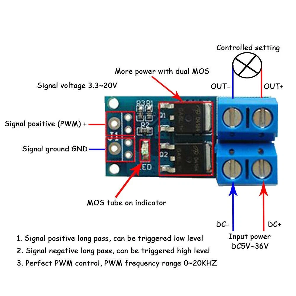 Product Description Features: brand new and high quality Made of high-quality materials, Dual MOS parallel active output, lower internal resistance, larger current, powerful power, 15A, 400W at room temperature, can meet the use of most equipment Wide voltage, support for PWM Easy to realize the control of high-power equipment Product parameters: Working voltage: DC 5V--36V; Trigger signal source: digital high and low level (DC3.3V--20V), can be connected to the microcontroller IO port, PLC interface, DC power supply, can receive for PWM signal, signal frequency 0-20KHZ perfect support Output: DC DC 5V--36V, continuous current 15A at room temperature, power 400W! Auxiliary heat dissipation, the maximum current can reach 30A. Application: The output can control high-power equipment, motors, bulbs, LED strips, DC motors, pumps, solenoid valves, etc., can enter for PWM, control motor speed, lamp brightness, etc. Service life: unlimited switching Working temperature: -40-85 C Size: 3.4 * 1.7 * 1.2cm packing list: 10 *module Note: 1.The real color of the item may be slightly different from the pictures shown on website caused by many factors such as brightness of your monitor and light brightness. 2.Please allow slight manual measurement deviation for the data. Payment Payment must be completed within 5 days. If you have any problems about payment, please contact us via ebay message. Delivery details We only ship to confirmed ebay Order addresses. Please comfirm that your Order address is in line with your shipping address. Please kindly note that the c ombined shipping is not provided because the shipping fee is calculated by weight. Also, the each additional item means exactly the the same color and size. It takes about 7 -15 working days to US; about 10-30 working days to other countries. Transit time may be a little delayed because of the bad weather and customs inspection . If you do not receive your item within 30 working days since payment finished, please contact us immediately for further assistance. Contact us We strive for 100% customer satisfaction! Positive Feedback is very important to us. If you have any questions, p lease feel free to contact us via "Ask seller a question" . We will reply your email within 24 working hours.