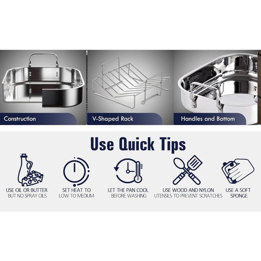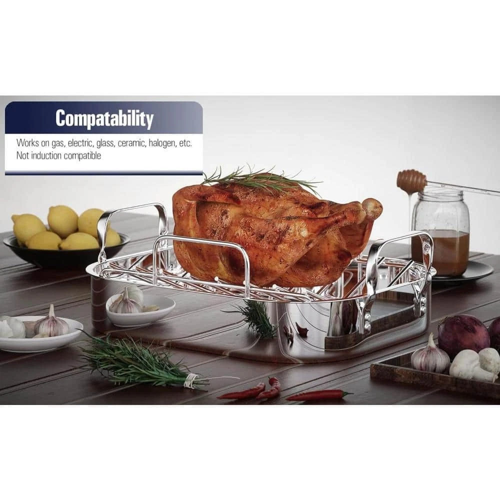 This roaster is a game-changer! The heavy-duty stainless steel heats evenly, and the polished interior makes cleanup a breeze. The V-shaped rack ensures perfectly browned meats while collecting juices for delicious sauces. Wide, riveted handles provide a secure grip, and the flat bottom works on most stovetops. Super versatile—great for roasting, baking, and more. Highly recommend!