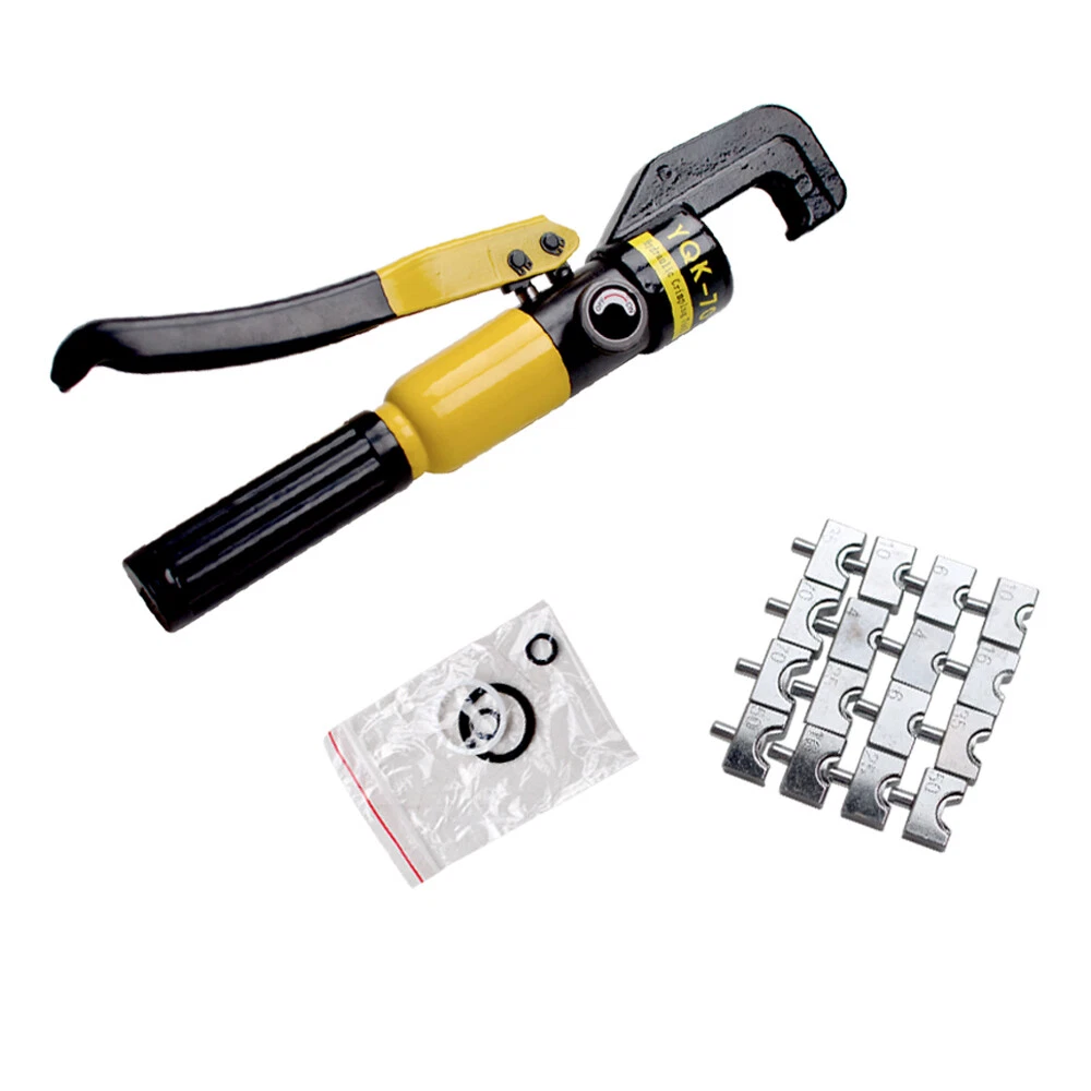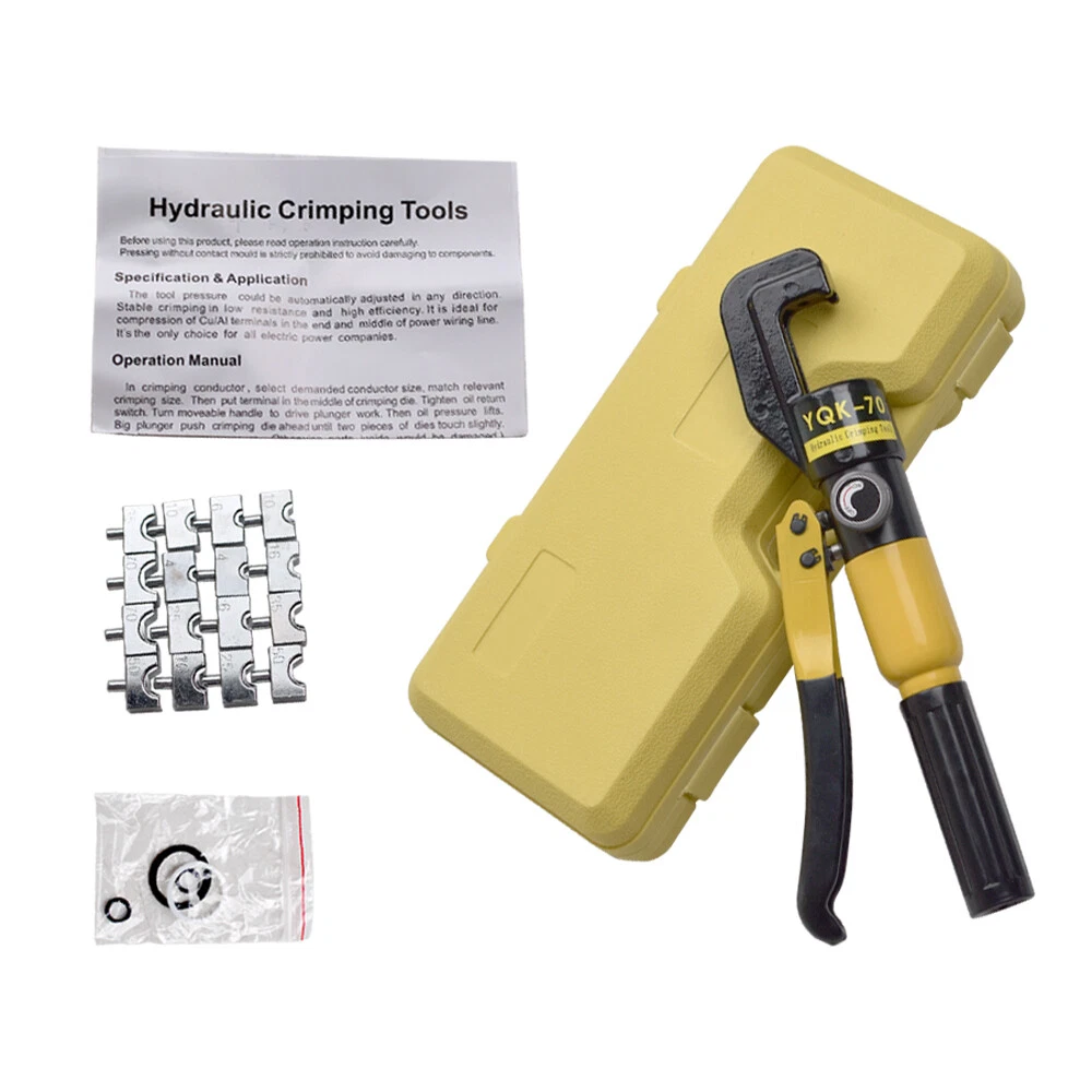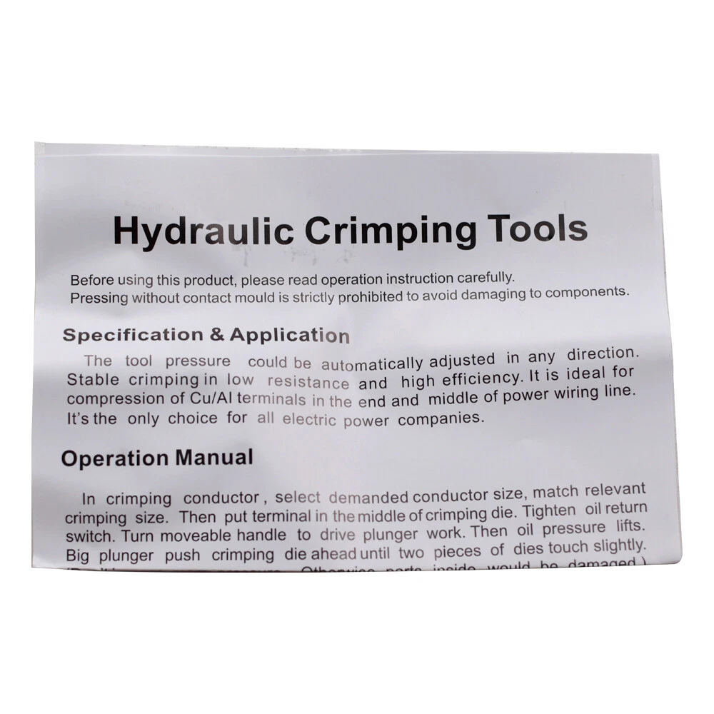 10 Ton Hydraulic Wire Battery Cable Lug Terminal Crimper Crimping Tool w/ Case Description: Hydraulic Crimper Crimping Tool Maximum crimping power : 10 tons Stroke Capacity: 10mm On/off knob for fast tool operation. 8" Long comfortable grips Crimps AWG 12 to 2/0 size aluminum and copper wire Great for battery and welding cables, power wires and electrical cables etc 8 Sets of the largest hexagon crimping dies : Made of hardened steel with chrome finish Tool free for changing dies quickly Dies: 4, 6, 10, 16, 25, 35, 50, 70mm2 Package Including : 1 Hydraulic Crimper Crimping Tool and 8 Dies ,comes with a durable plastic case.